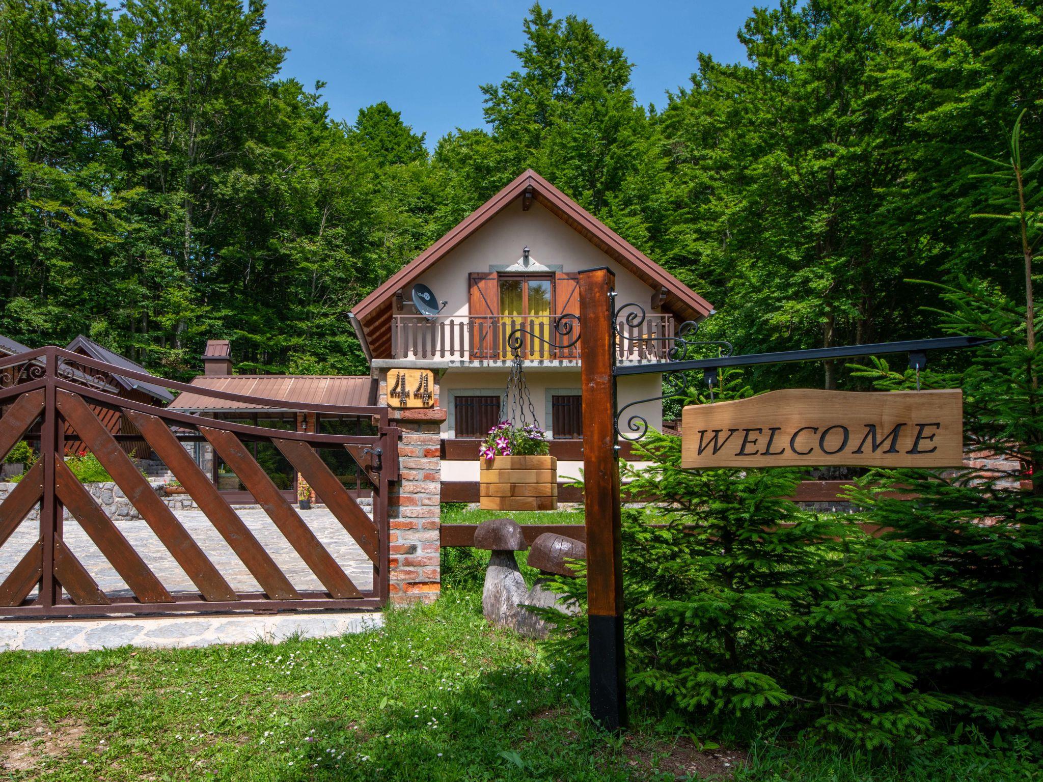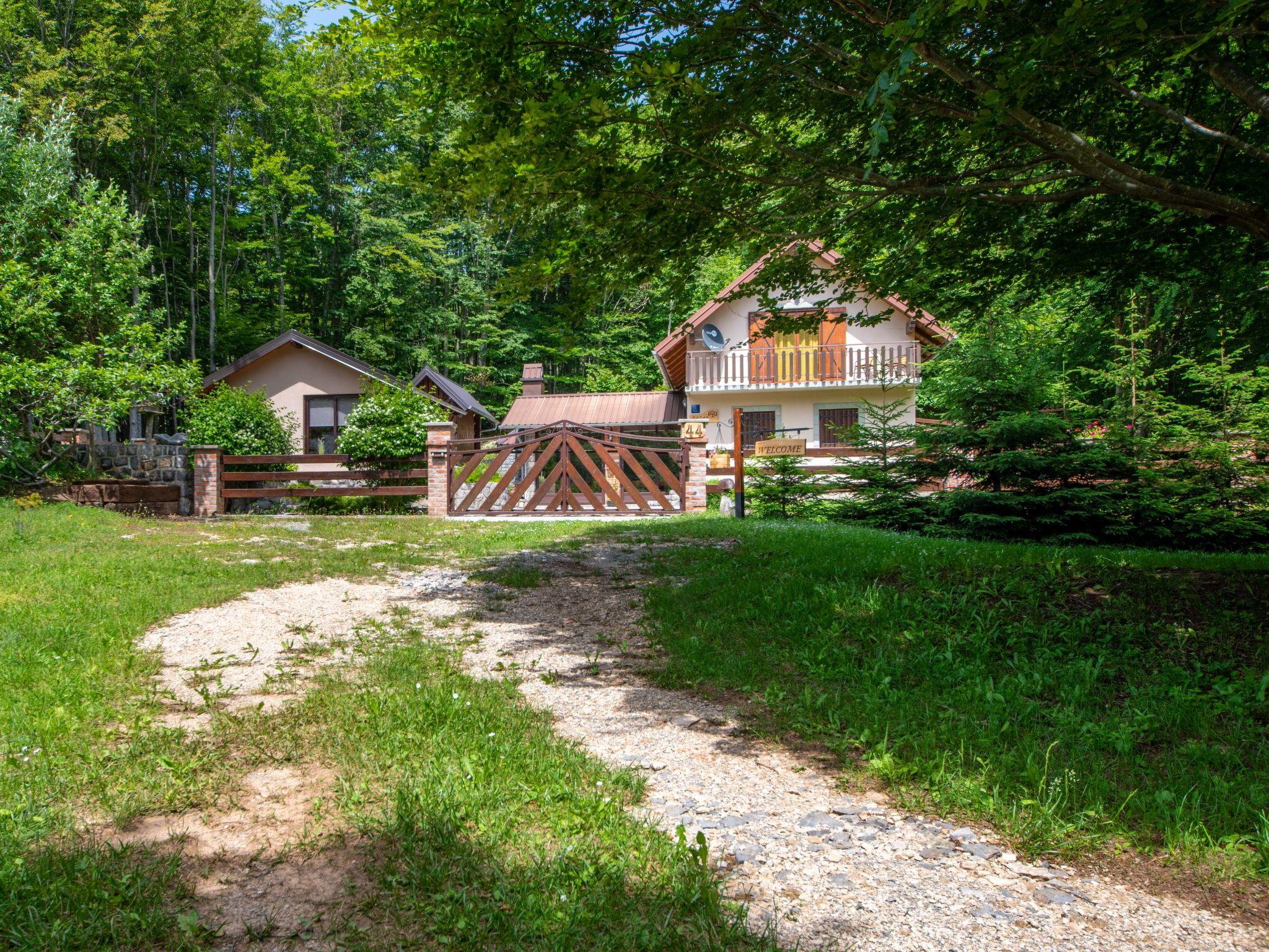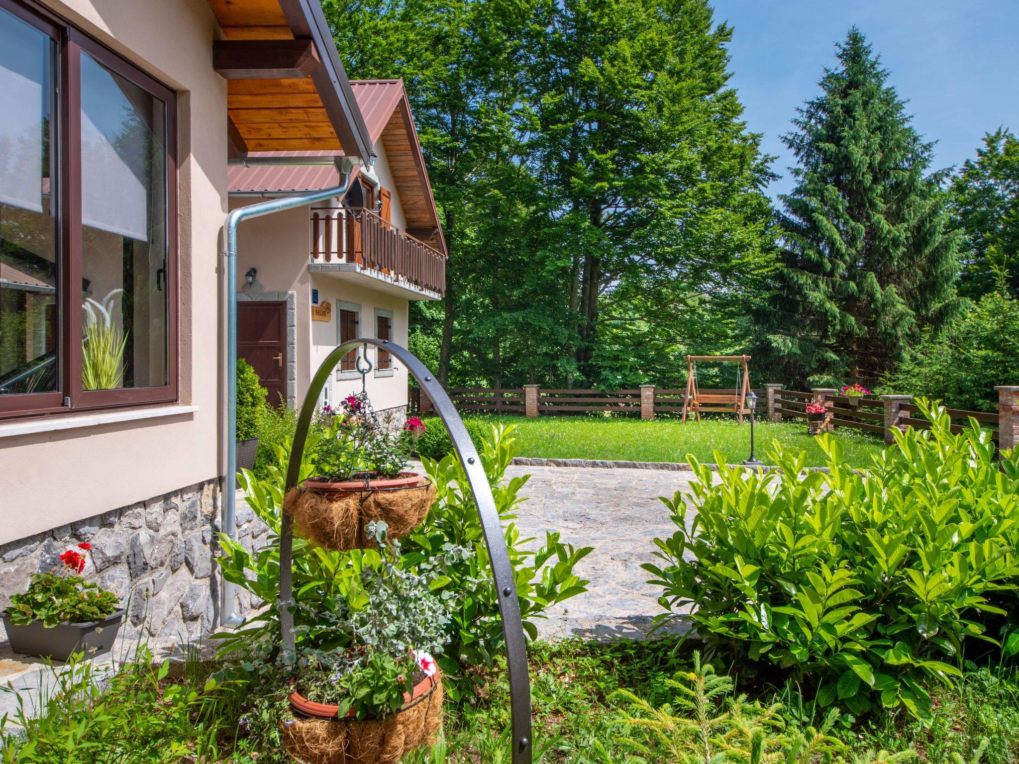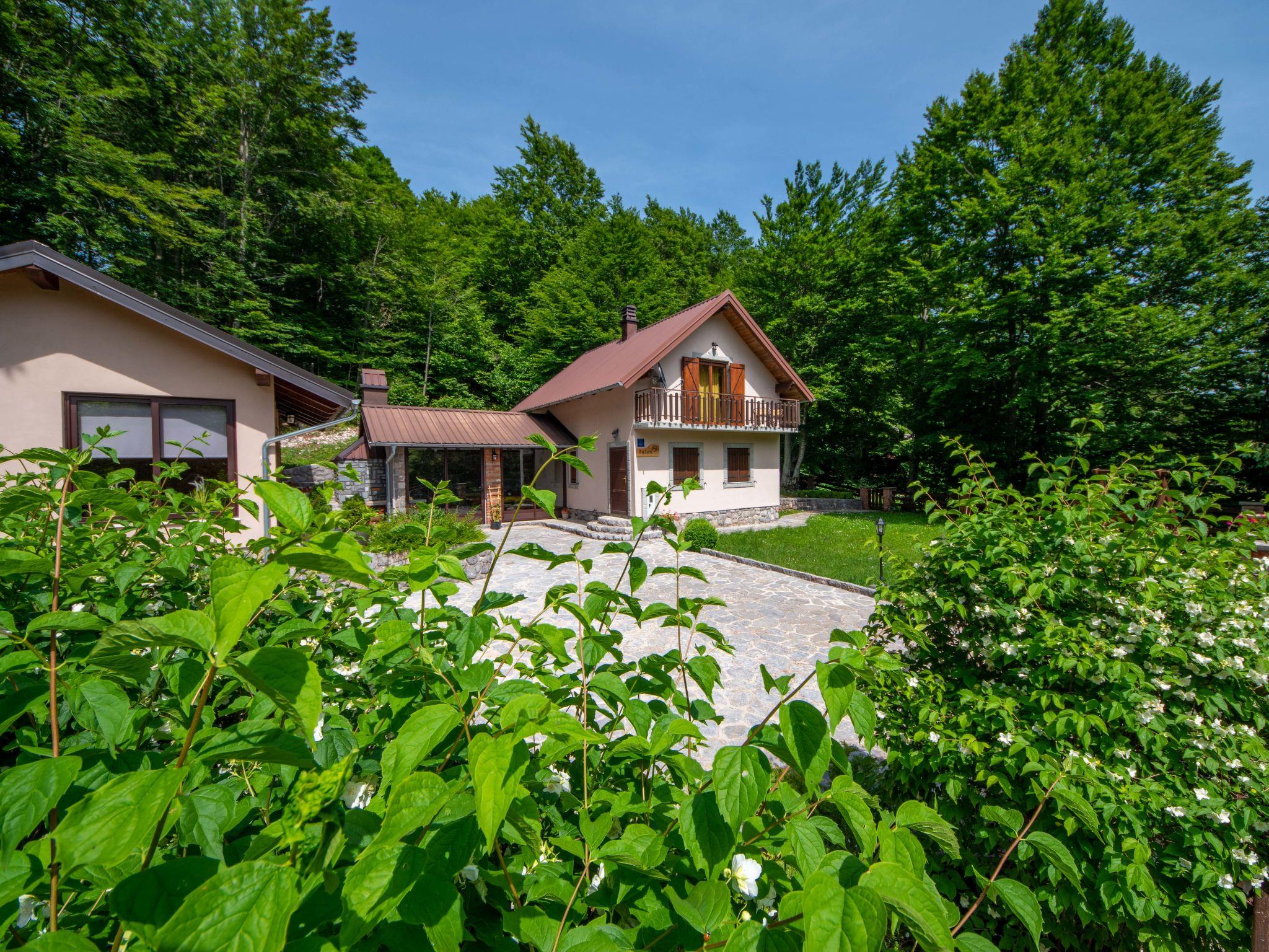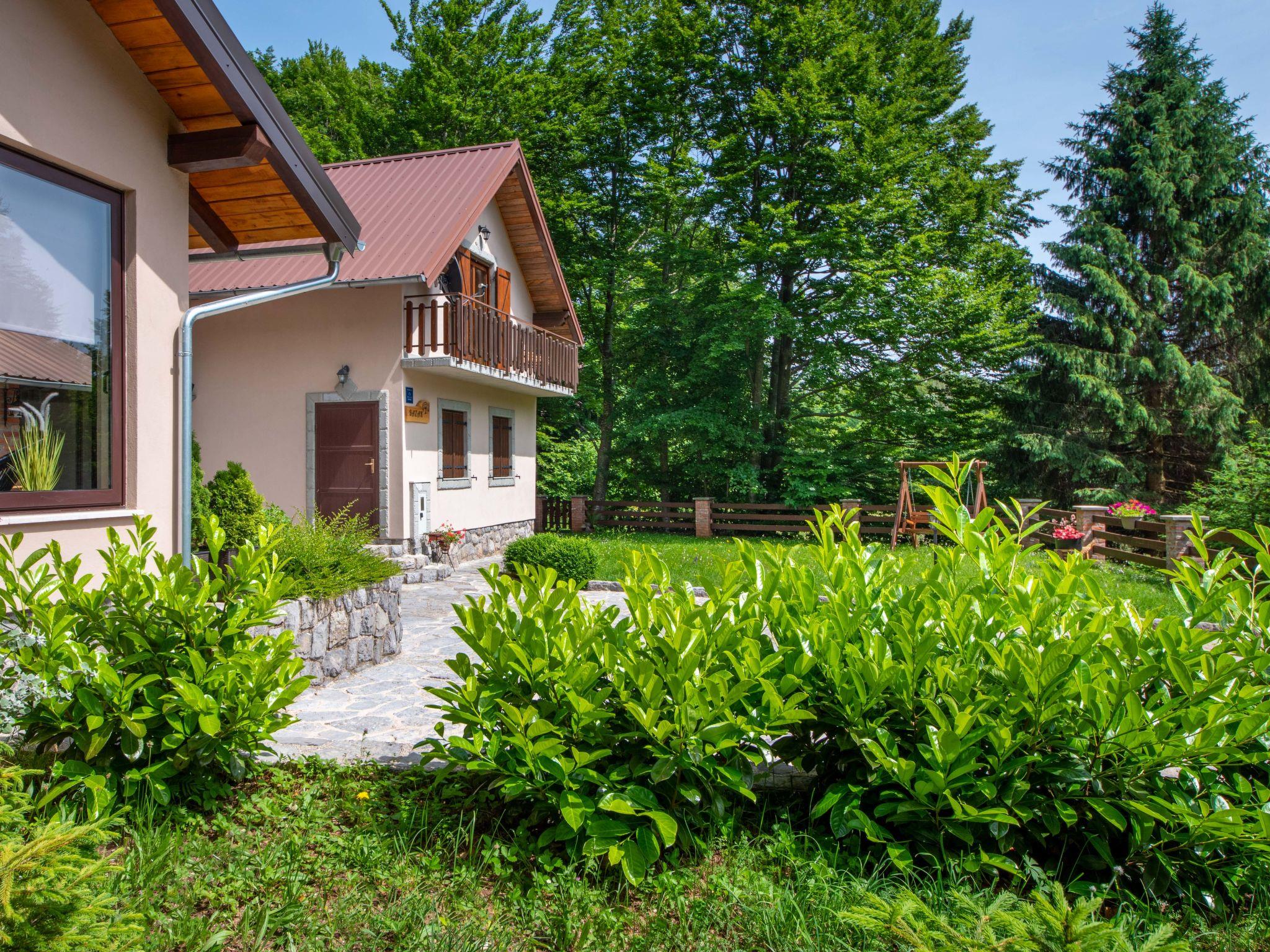 Lukovo 13 km from Fužine: Single-family house "Bazak", 2 storeys, surrounded by trees. In the hamlet Ravno, in a quiet, sunny position, 24 km from the sea, 14 km from the lake. Private: property 2'000 m2 with lawn 130 m2. Hot tub, barbecue house (swing). In the house: internet access, infrared sauna. Motor access (800 m via unmade road). Parking (for 3 cars) at the house on the premises. Shop 11 km, restaurant 1 km, bus stop 14.1 km, pebble beach 24 km, public bathing area 24 km. Riding stable 17 km, walking paths from the house 600 m, cycle lane 650 m. Well-known lakes can easily be reached: Bajer 14 km. The tap water has no drinking water quality.