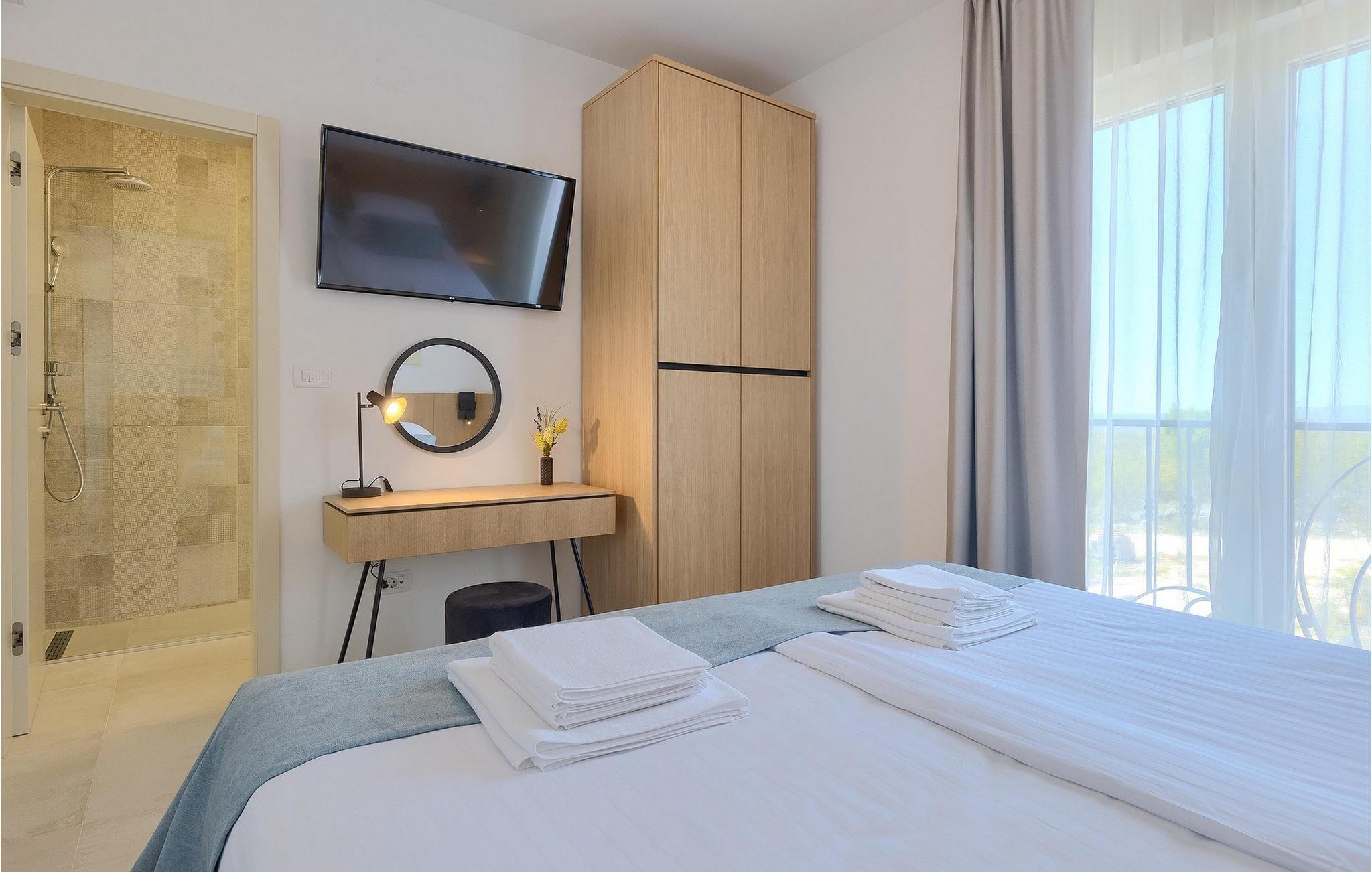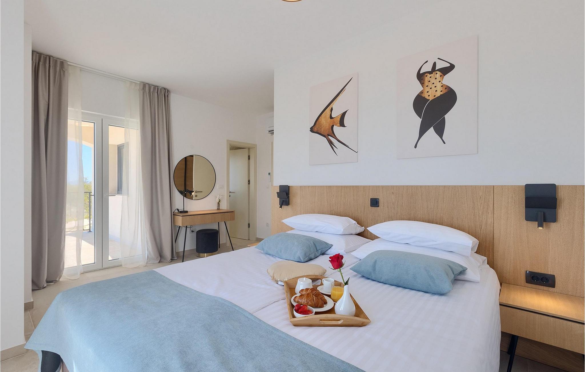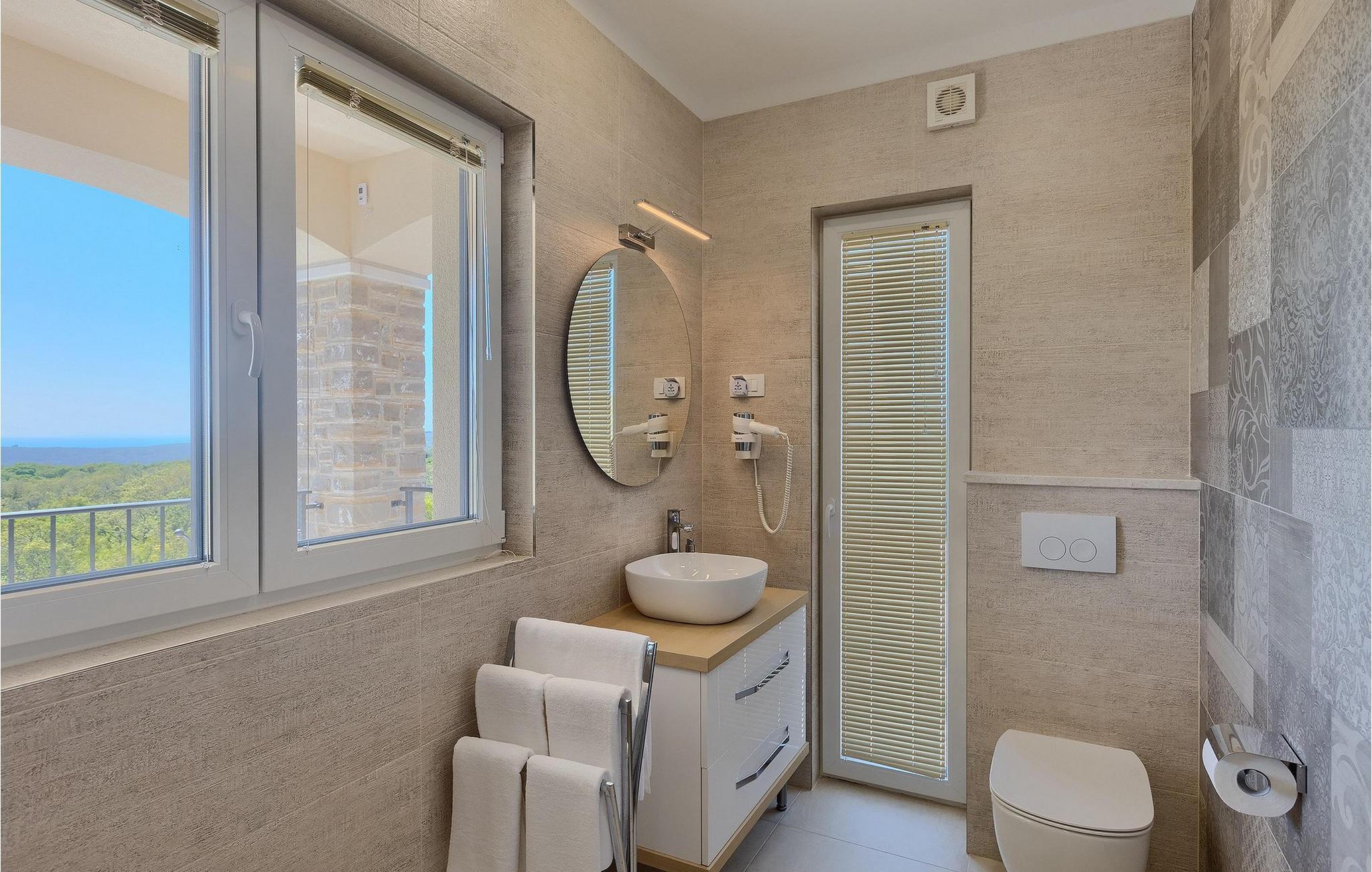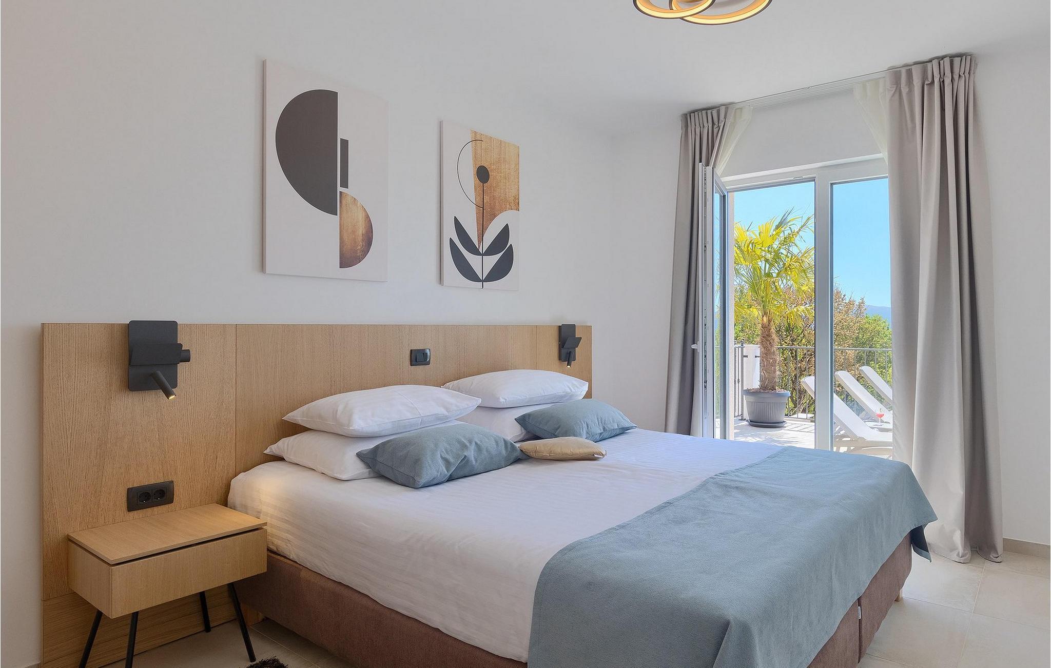 De resterende 3 soverommene, alle med eget bad, ligger i første etasje. Bestill Villa Arietta og begynn å planlegge ferien! Den vakre Villa Arietta ligger i den lille landsbyen Garica på øya Krk. Garica er en typisk øylandsby - rolig og omgitt av vakker natur. I sentrum av landsbyen ligger Peterskirken, landsbyens skytshelgen. Det finnes også noen interessante turstier i området rundt. Ikke langt fra Garica ligger Vrbnik, en by som er kjent for sin sjarm. Med sin beliggenhet på en bratt høyde, 28 kilometer fra Krk-broen, og med sine middelalderske bymurer er Vrbnik det ideelle stedet for å nyte en fantastisk utsikt over omgivelsene og havet. Byen har nesten 900 års historie bak seg - ta en tidsreise og besøk det glagolitiske og sakrale senteret eller Frankopan-festningen. Vrbnik er også kjent for Zlahtina - nyt den fine, karakteristiske smaken av den stedegne druesorten. Strendene er også verdt å nevne. Finn en som oppfyller dine kriterier og slapp av!