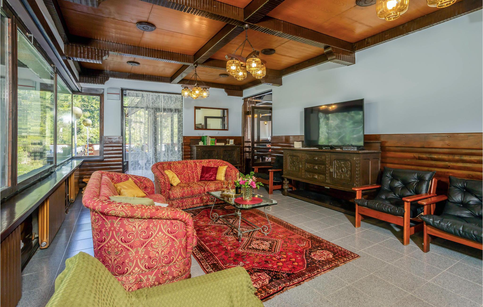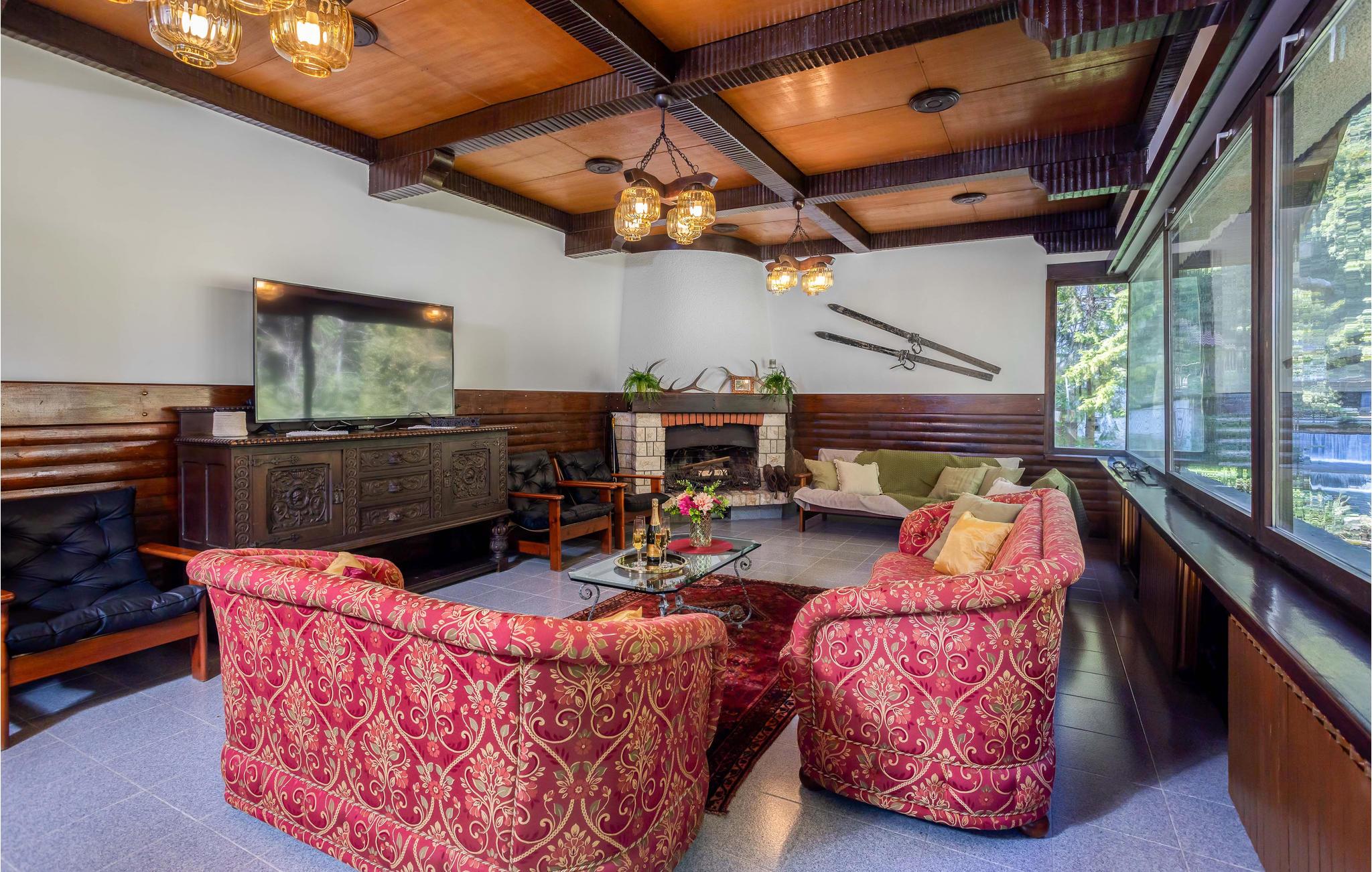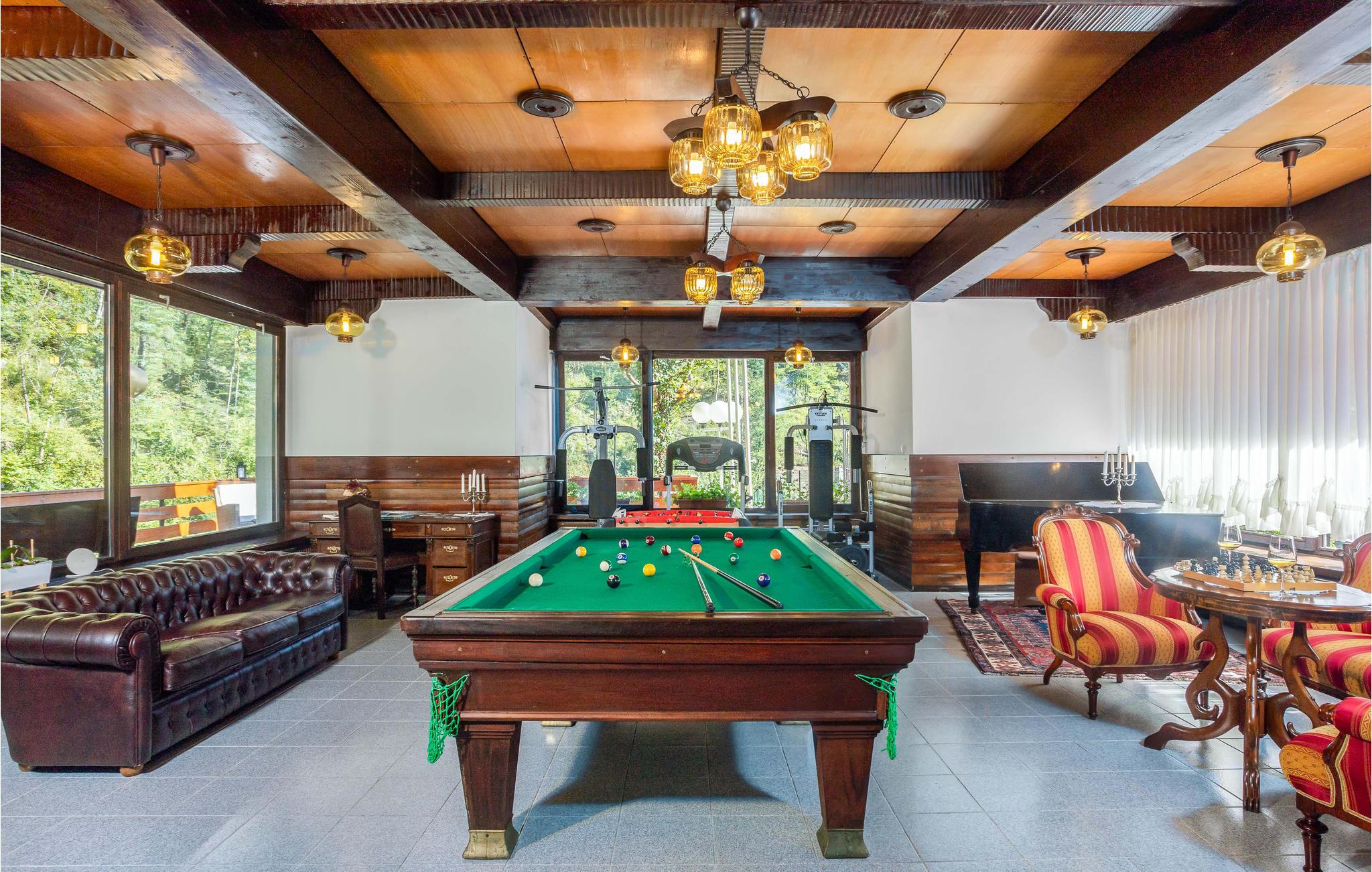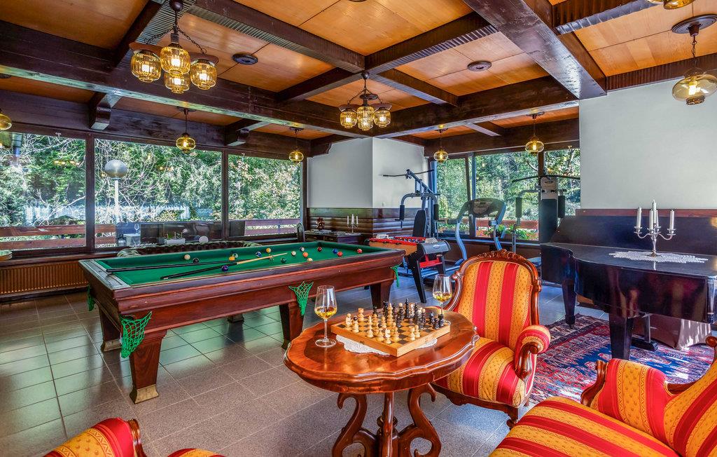 Velkommen til dette vakre feriehuset som med sine tretak, solide tremøbler og mange fasiliteter lover en uforglemmelig ferie. Oppdag de store rommene med mange vinduer som er fylt med naturlig lys. Enten du vil trene, spille biljard eller bare kose deg i sofaene, finner du det rette rommet for deg og dine nærmeste. Du kan også nyte tiden utendørs, enten du vil spise, grille eller sole deg, og du kan velge mellom to terrasser. Lytt til fossefallene i elven, som har sitt utspring bare noen få meter unna.