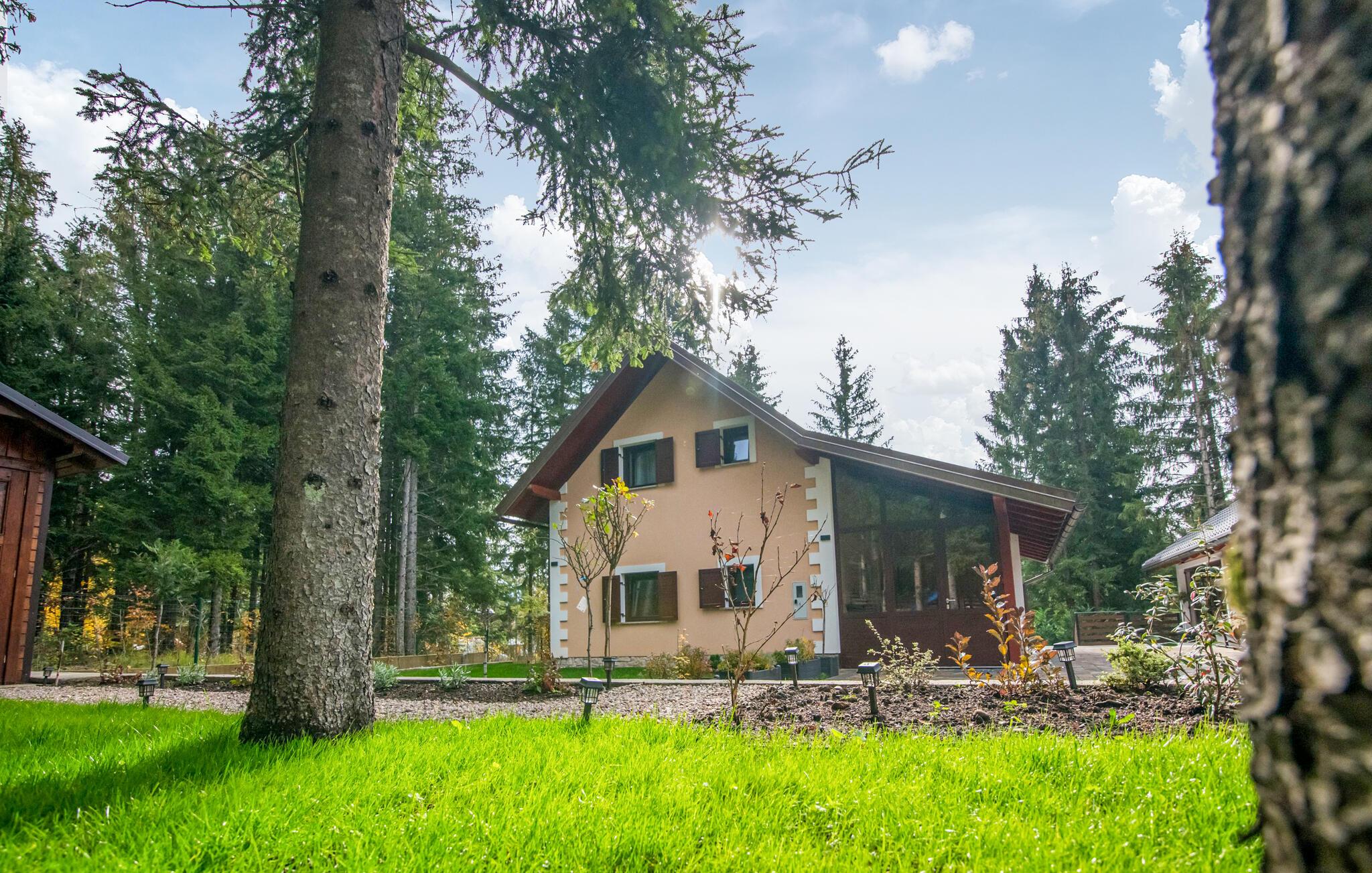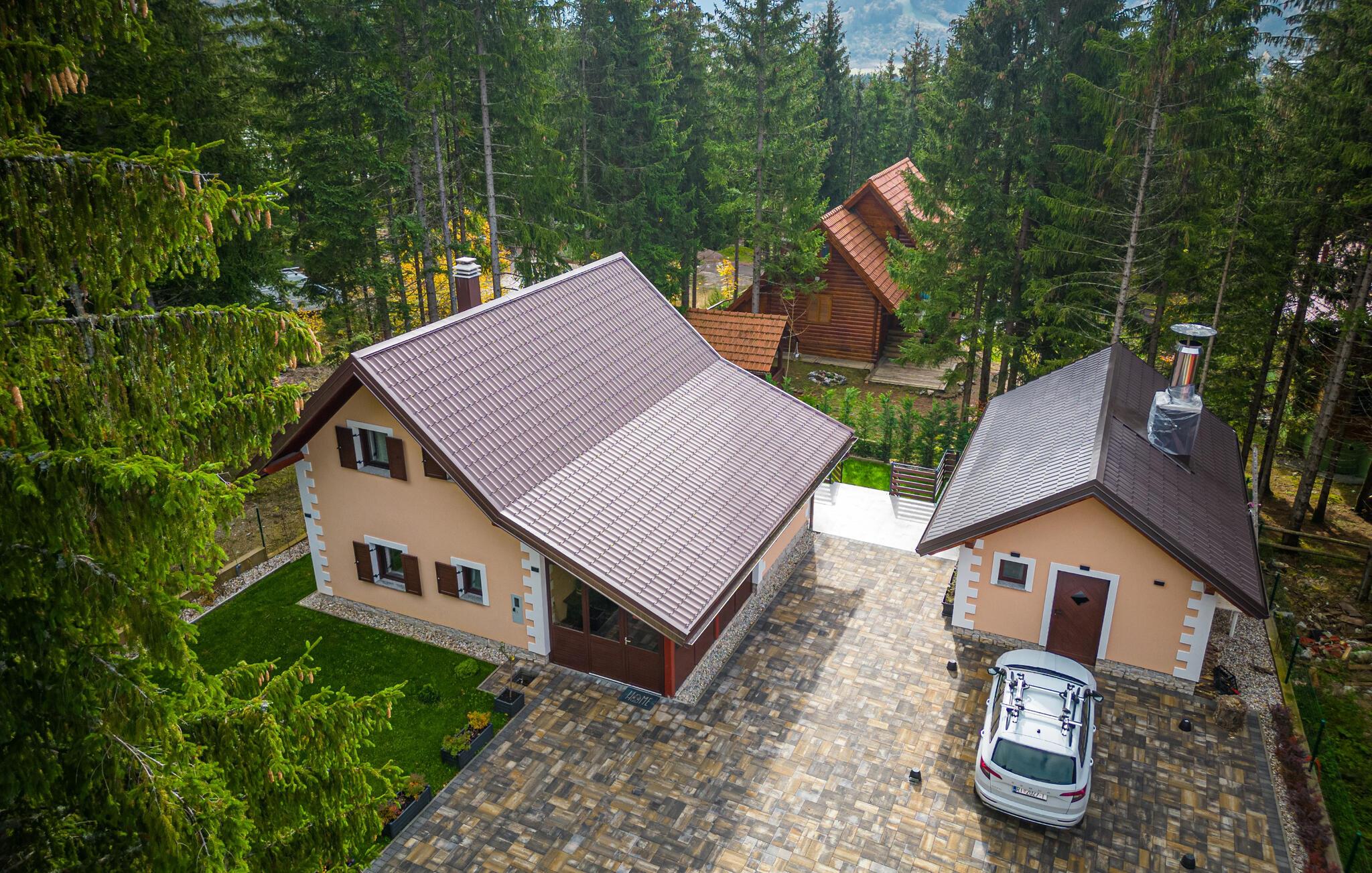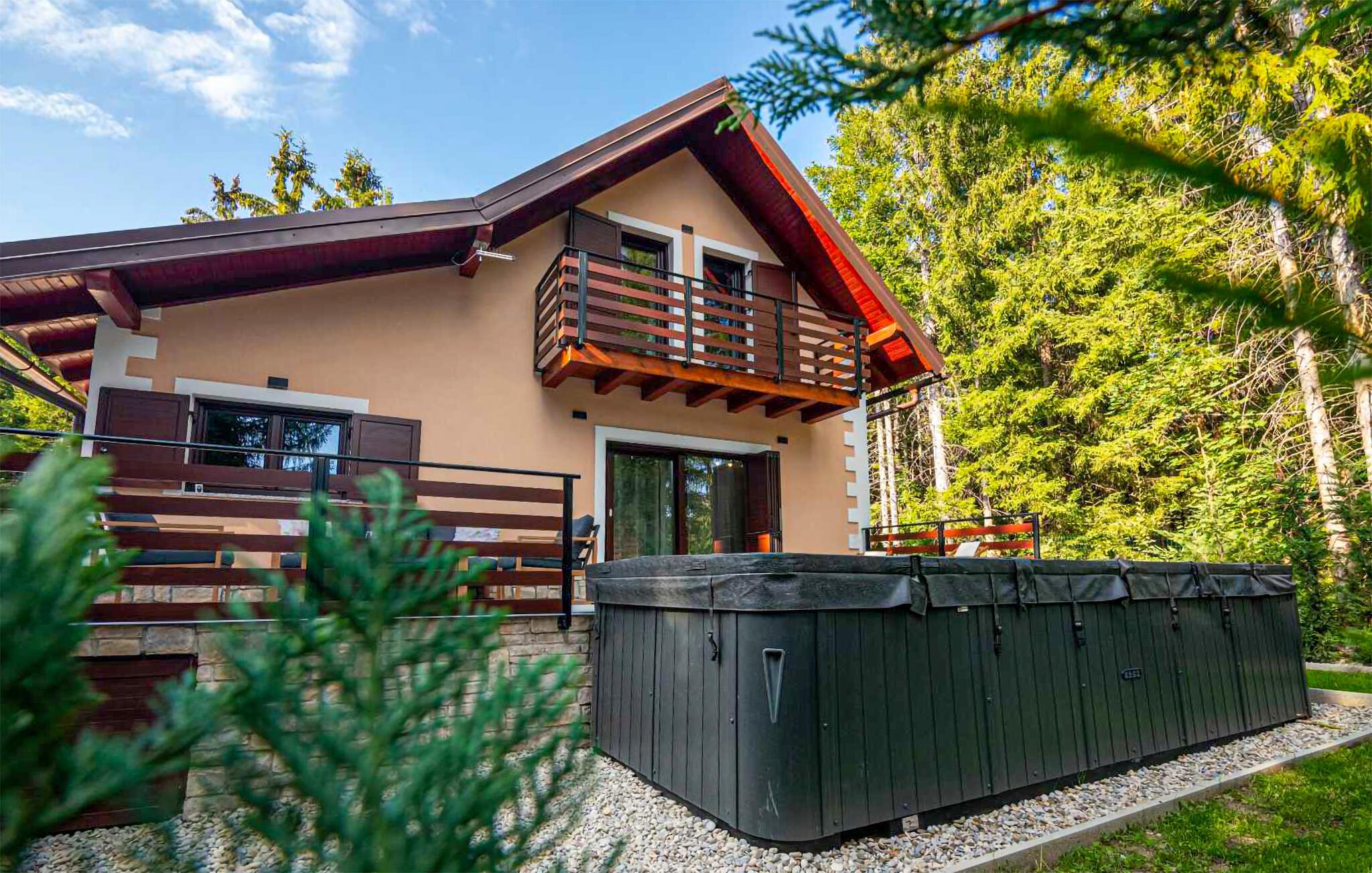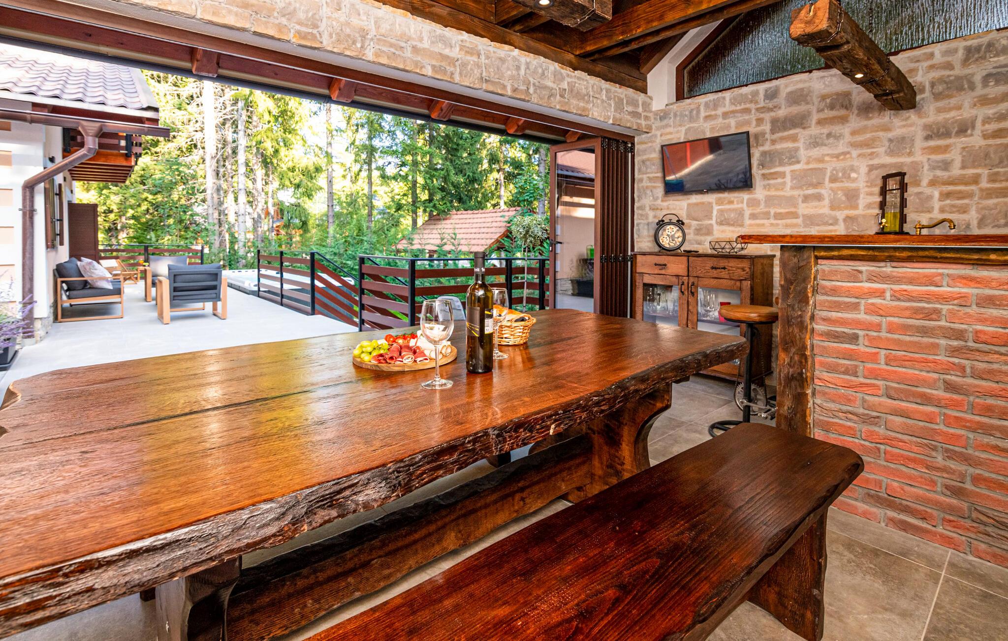 Omgitt av høye trær, kombinerer dette huset rustikkhet og komfort på en harmonisk måte. Synlige trebjelker, naturstein og tremøbler skaper en koselig atmosfære der du raskt vil føle deg som hjemme. Slapp av i boblebadet, tilbring en filmkveld i sofaen eller spill et slag dart.
