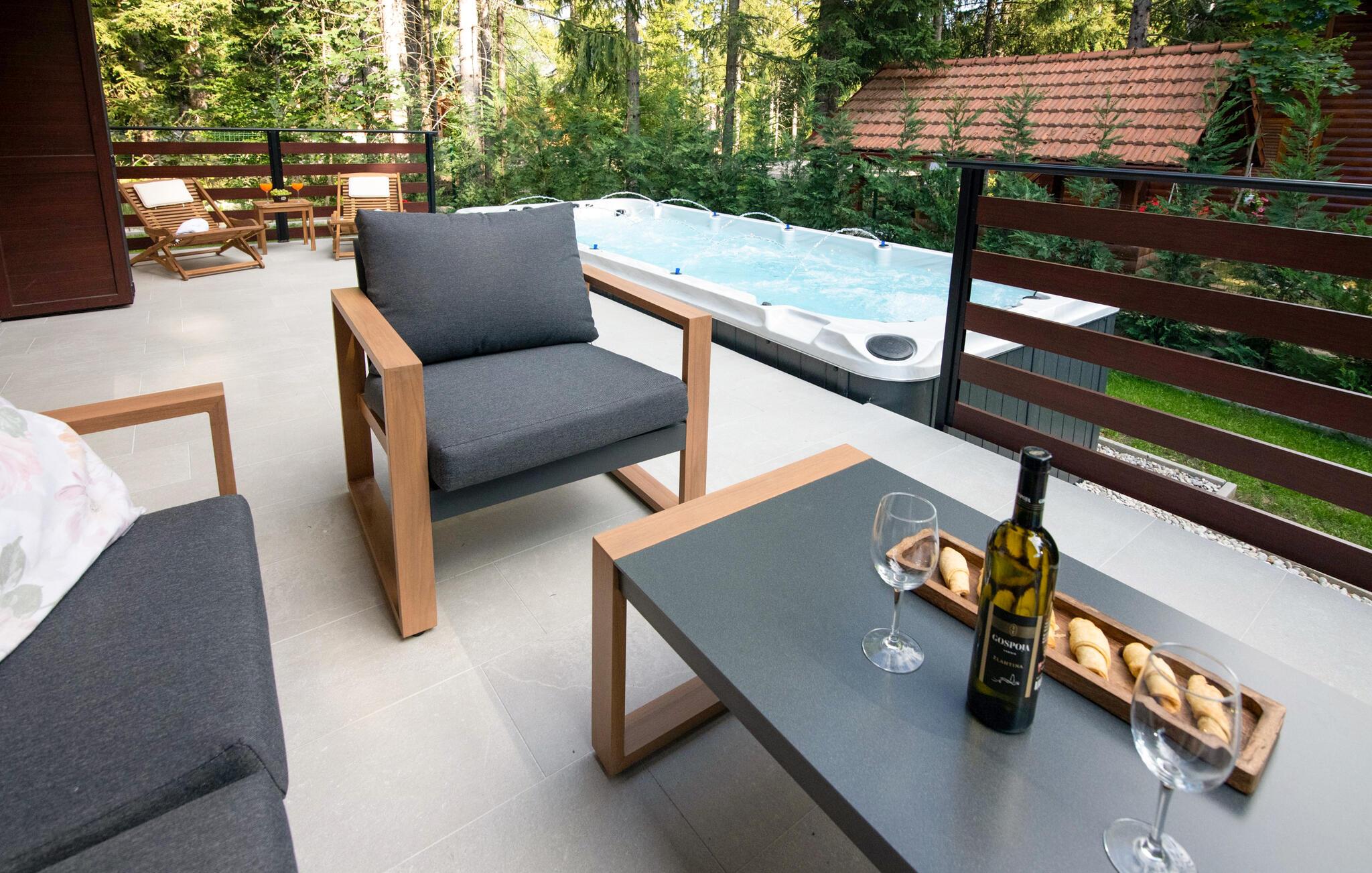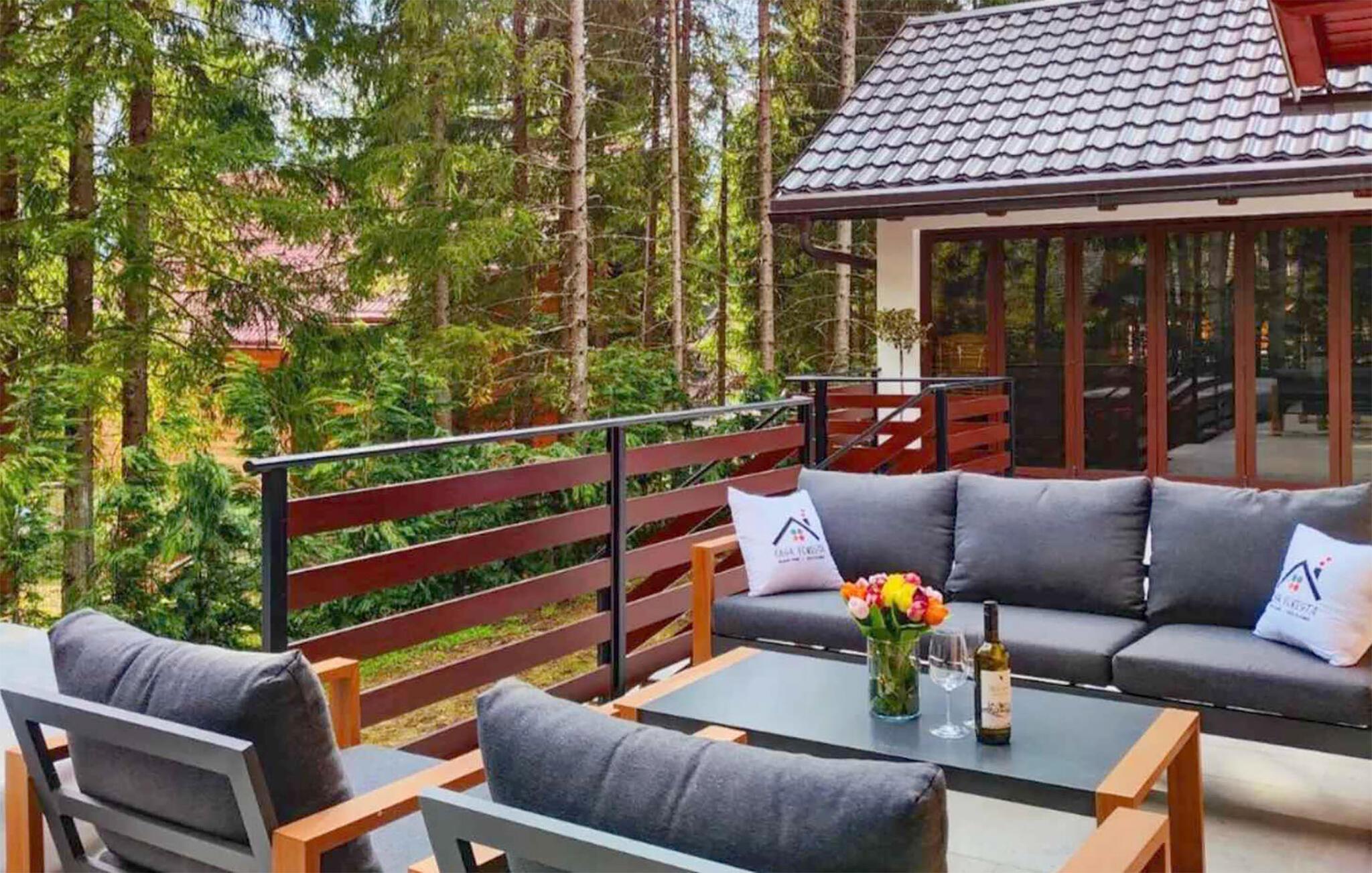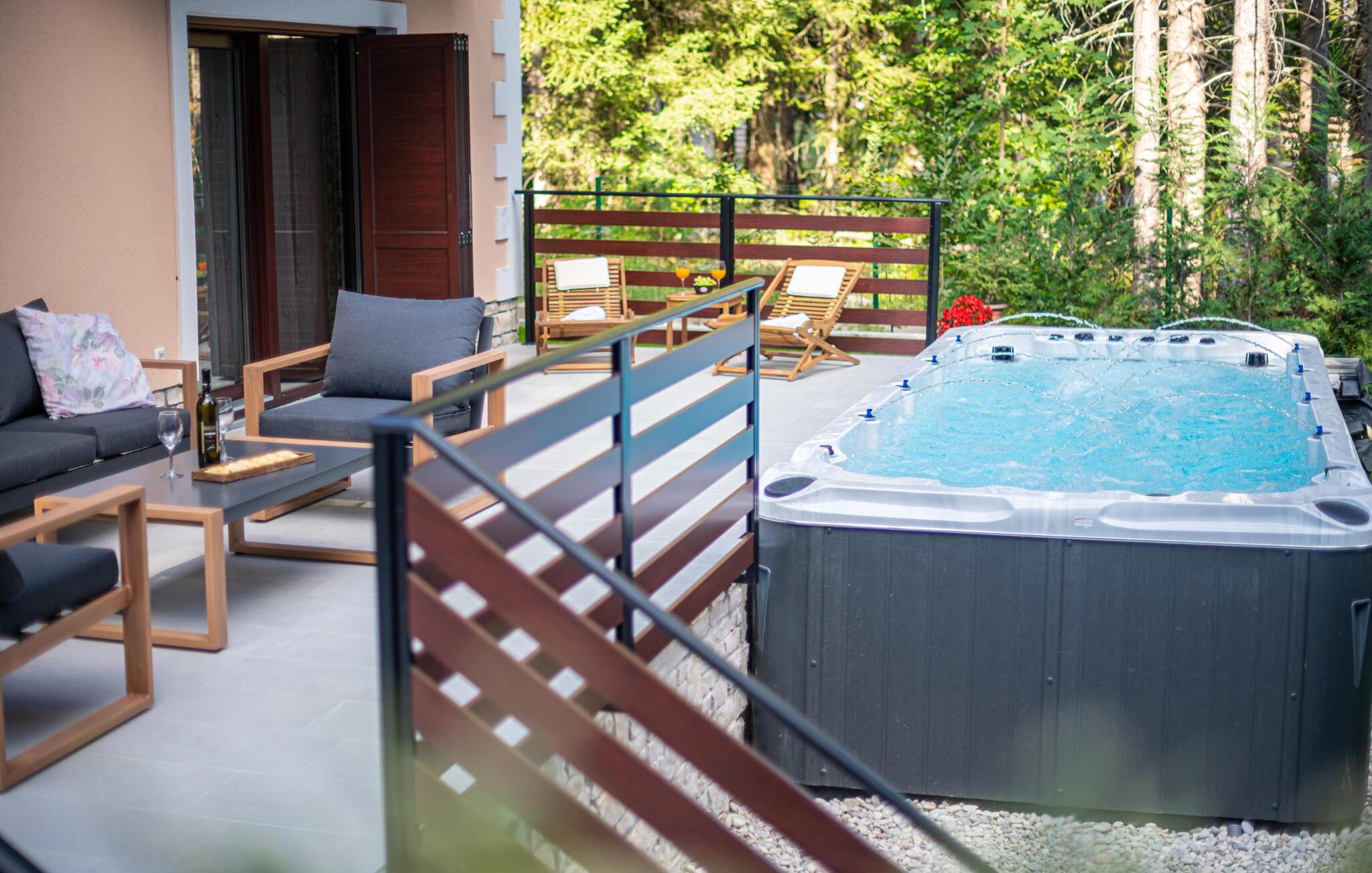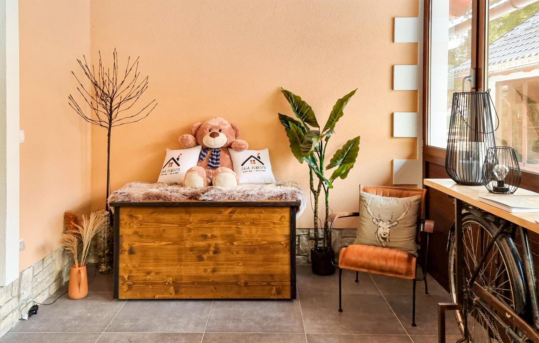 Omgitt av høye trær, kombinerer dette huset rustikkhet og komfort på en harmonisk måte. Synlige trebjelker, naturstein og tremøbler skaper en koselig atmosfære der du raskt vil føle deg som hjemme. Slapp av i boblebadet, tilbring en filmkveld i sofaen eller spill et slag dart.