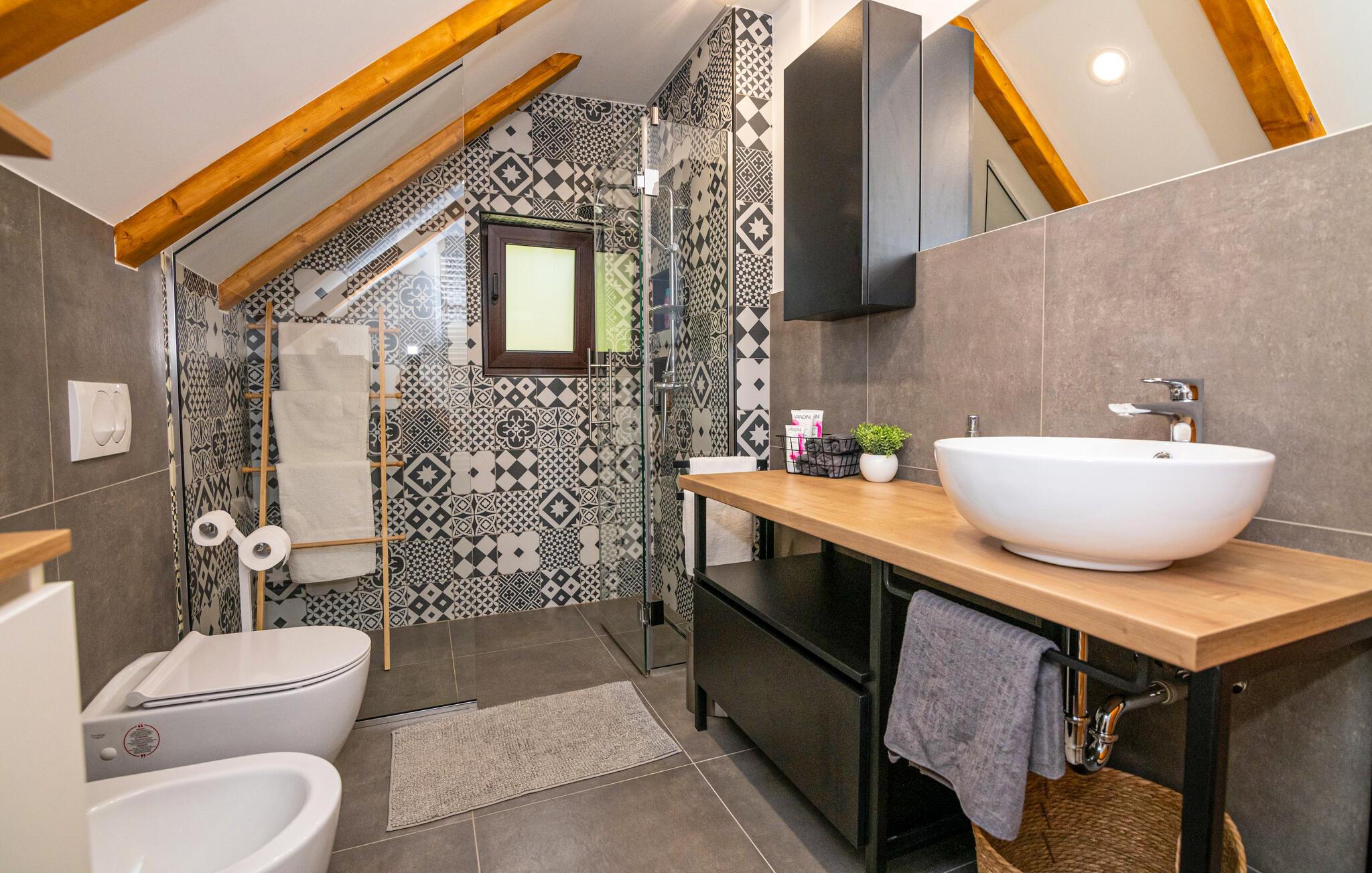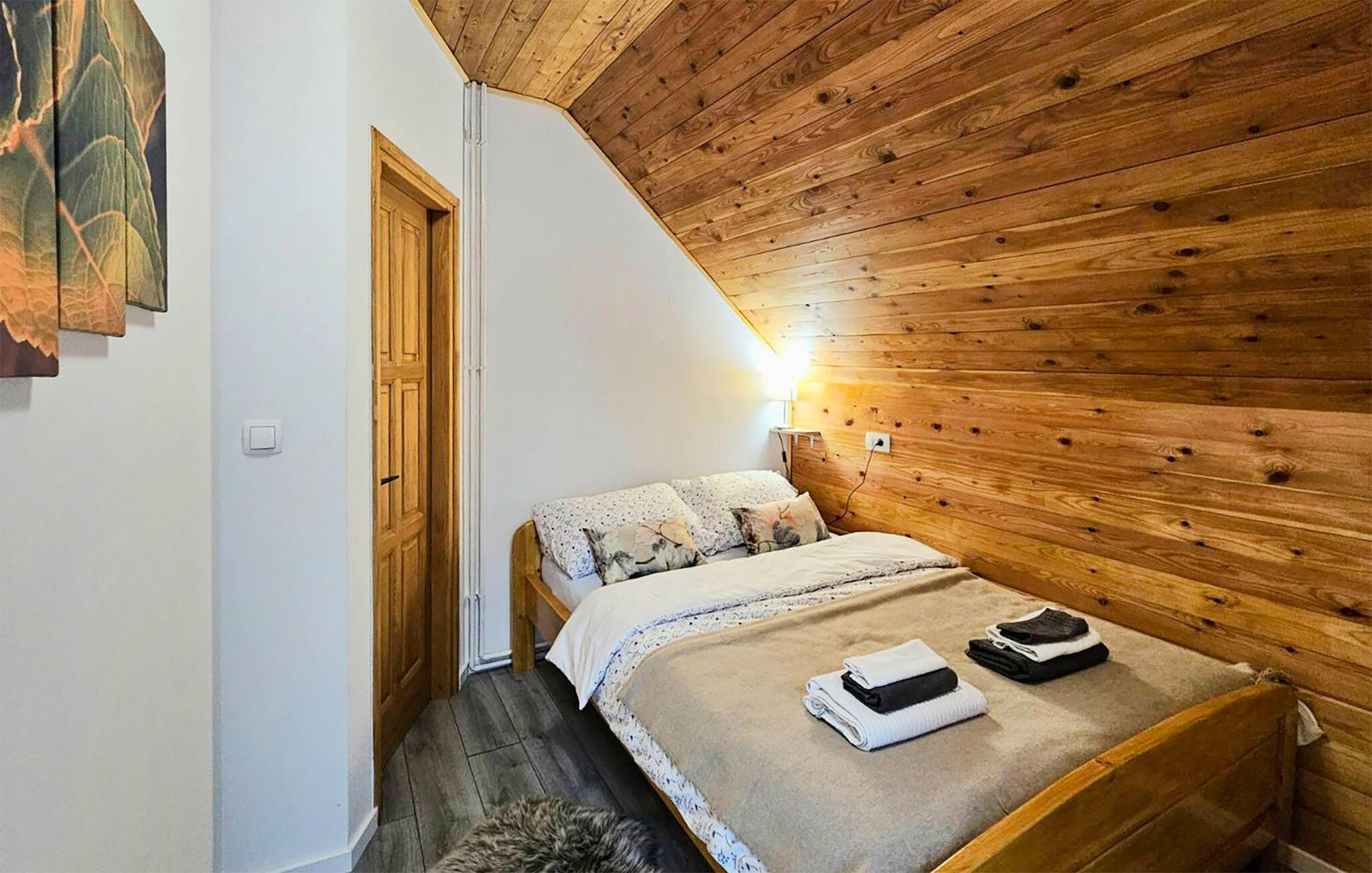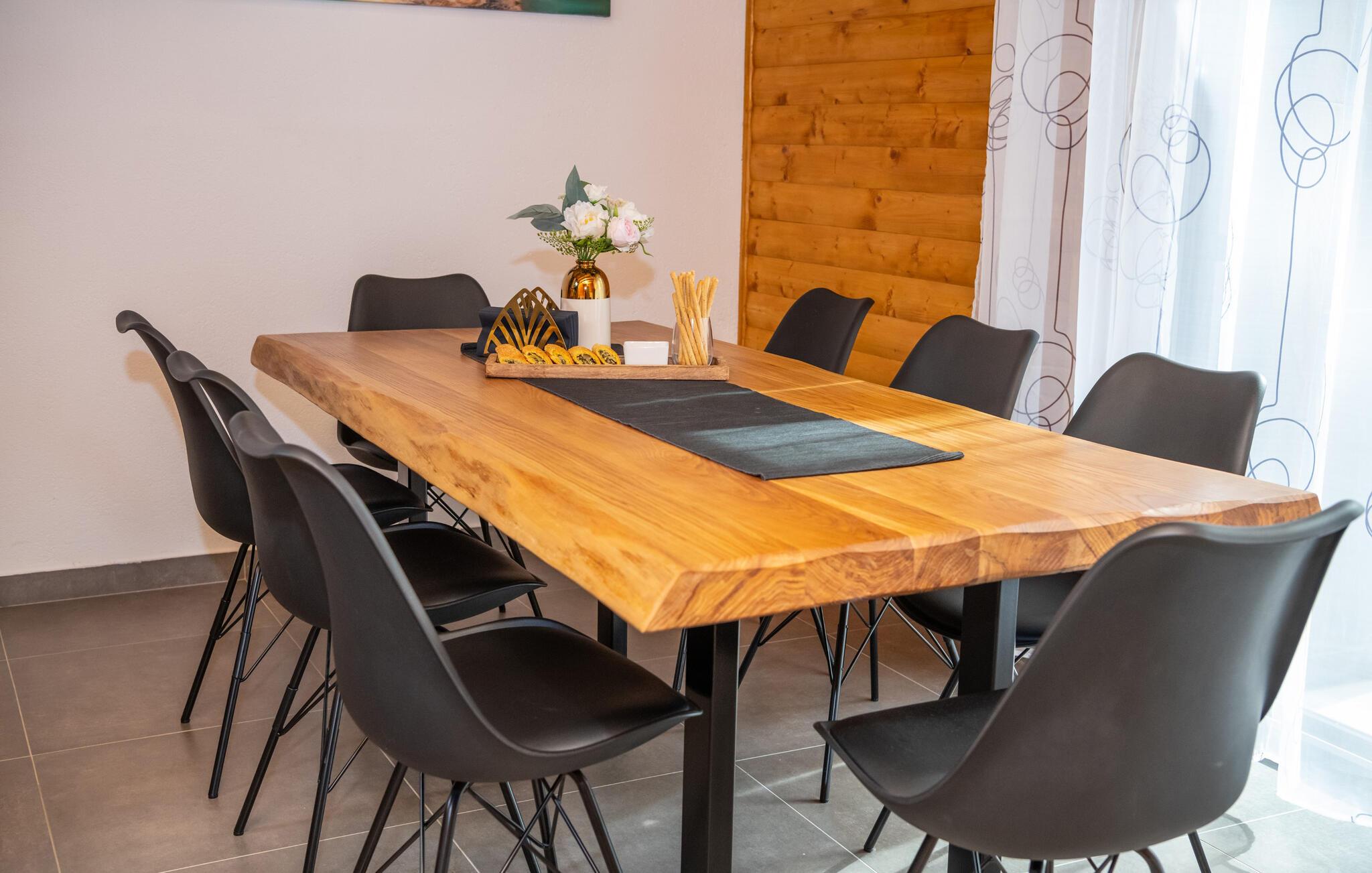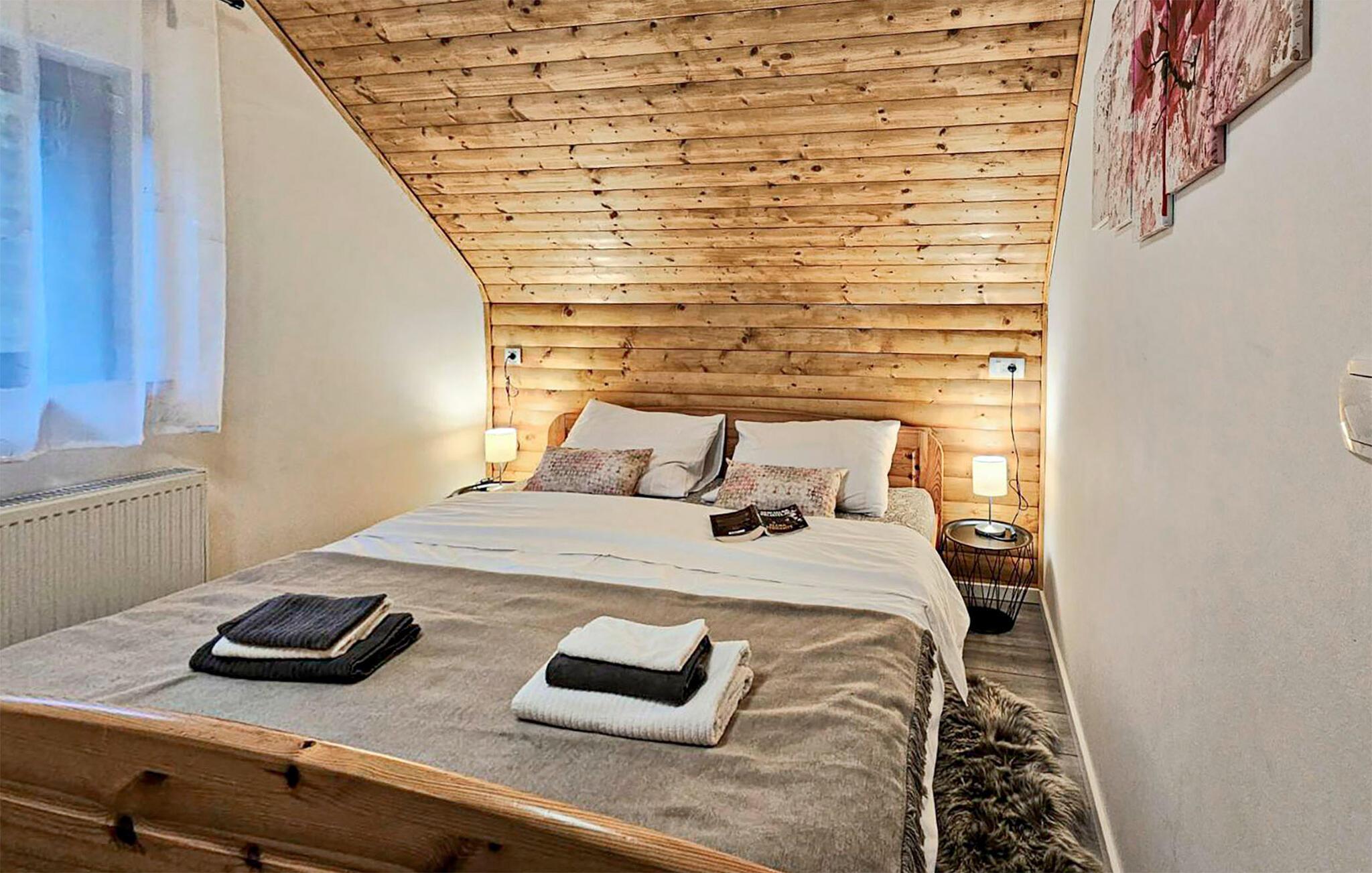 Omgitt av høye trær, kombinerer dette huset rustikkhet og komfort på en harmonisk måte. Synlige trebjelker, naturstein og tremøbler skaper en koselig atmosfære der du raskt vil føle deg som hjemme. Slapp av i boblebadet, tilbring en filmkveld i sofaen eller spill et slag dart.