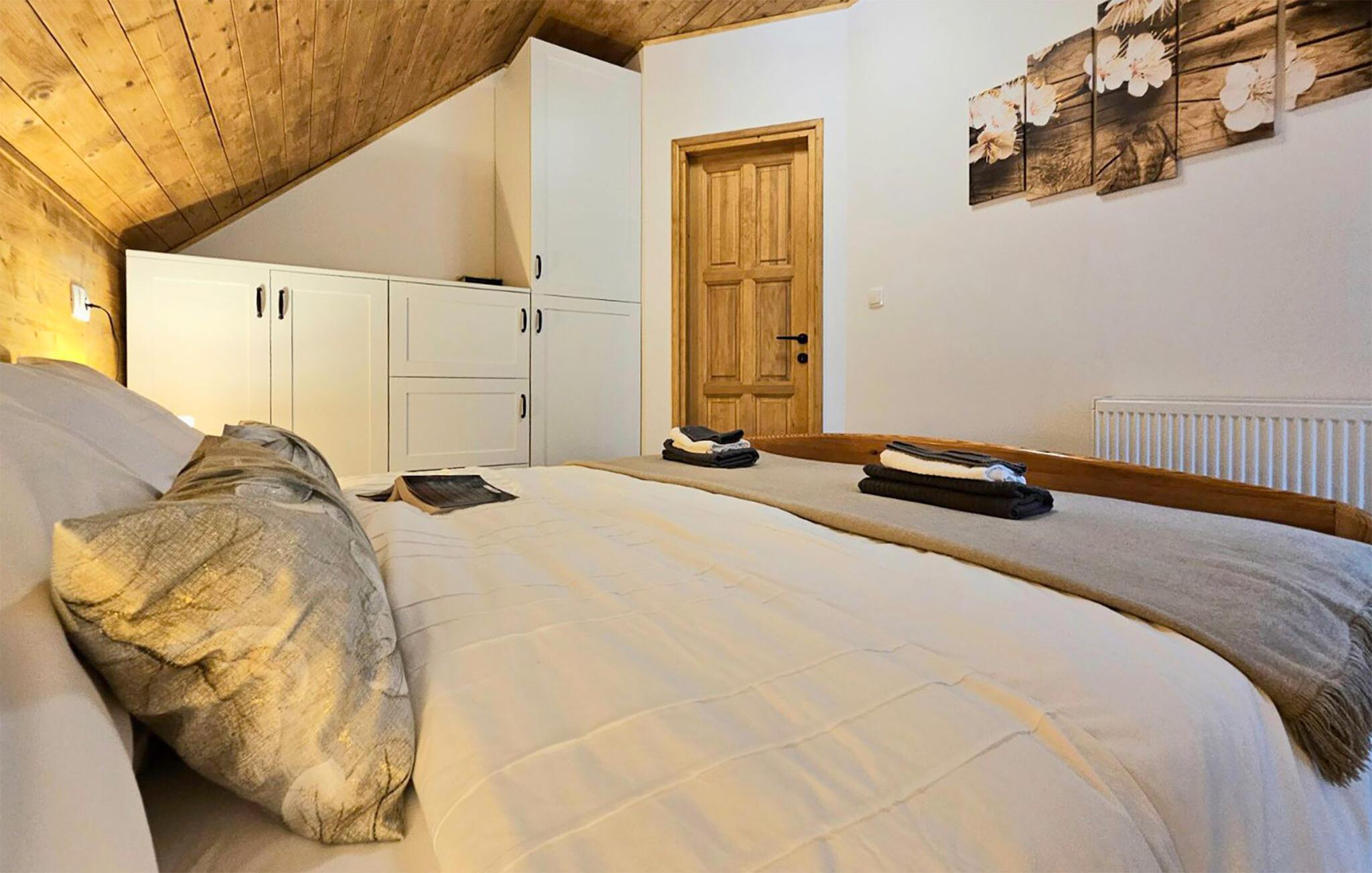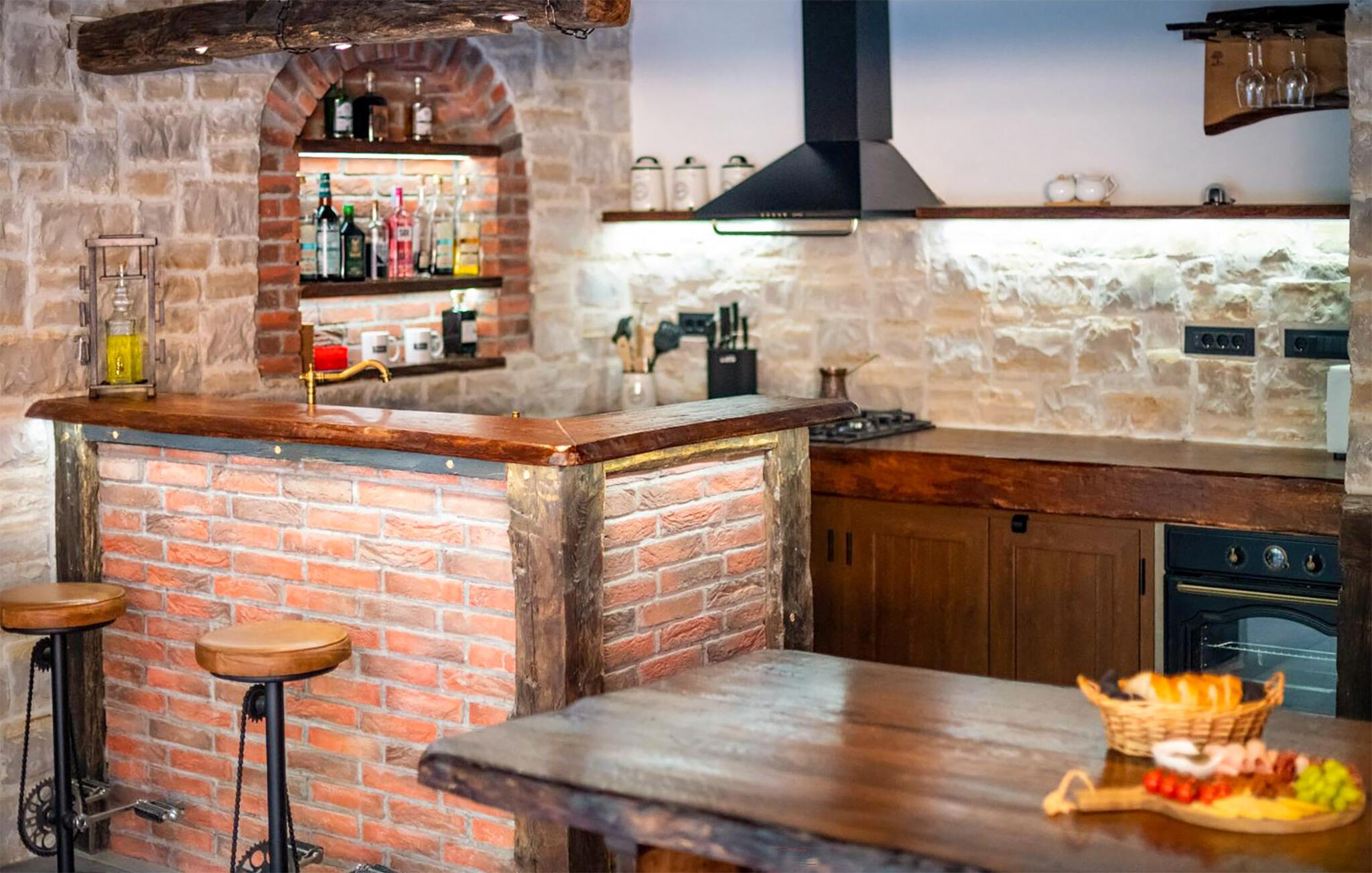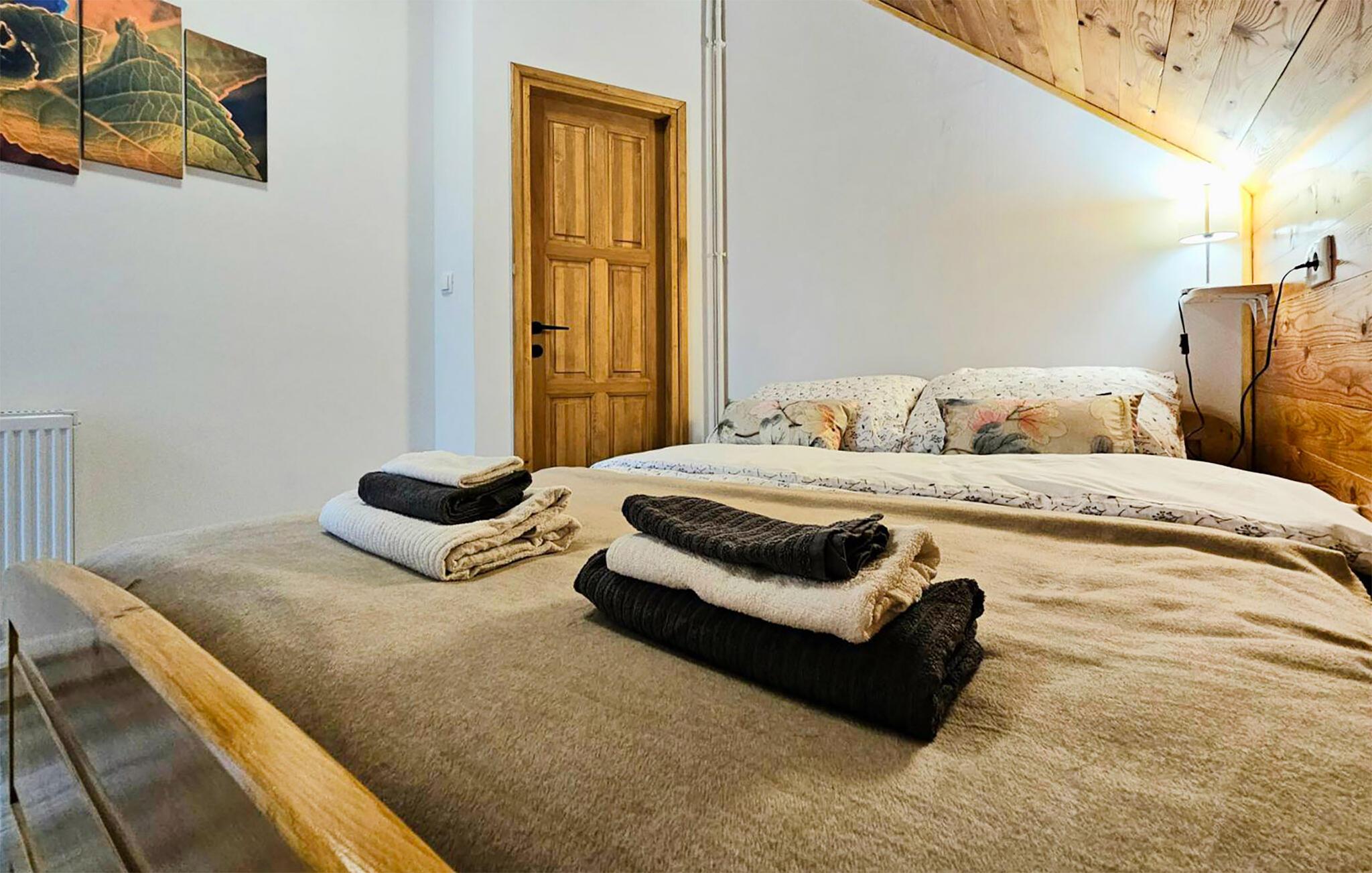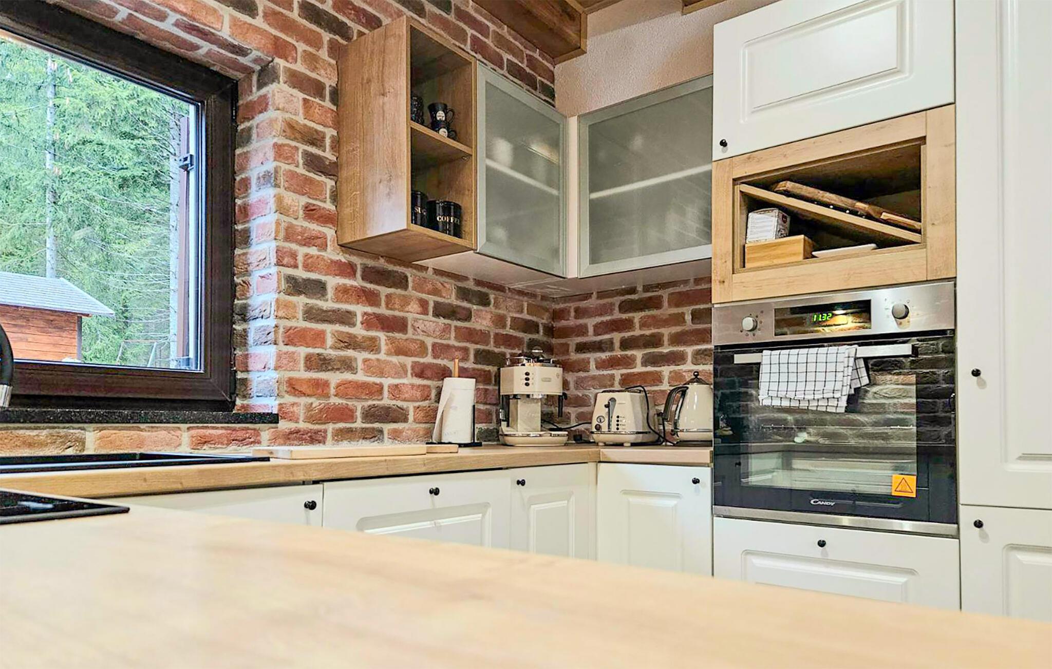 Omgitt av høye trær, kombinerer dette huset rustikkhet og komfort på en harmonisk måte. Synlige trebjelker, naturstein og tremøbler skaper en koselig atmosfære der du raskt vil føle deg som hjemme. Slapp av i boblebadet, tilbring en filmkveld i sofaen eller spill et slag dart.