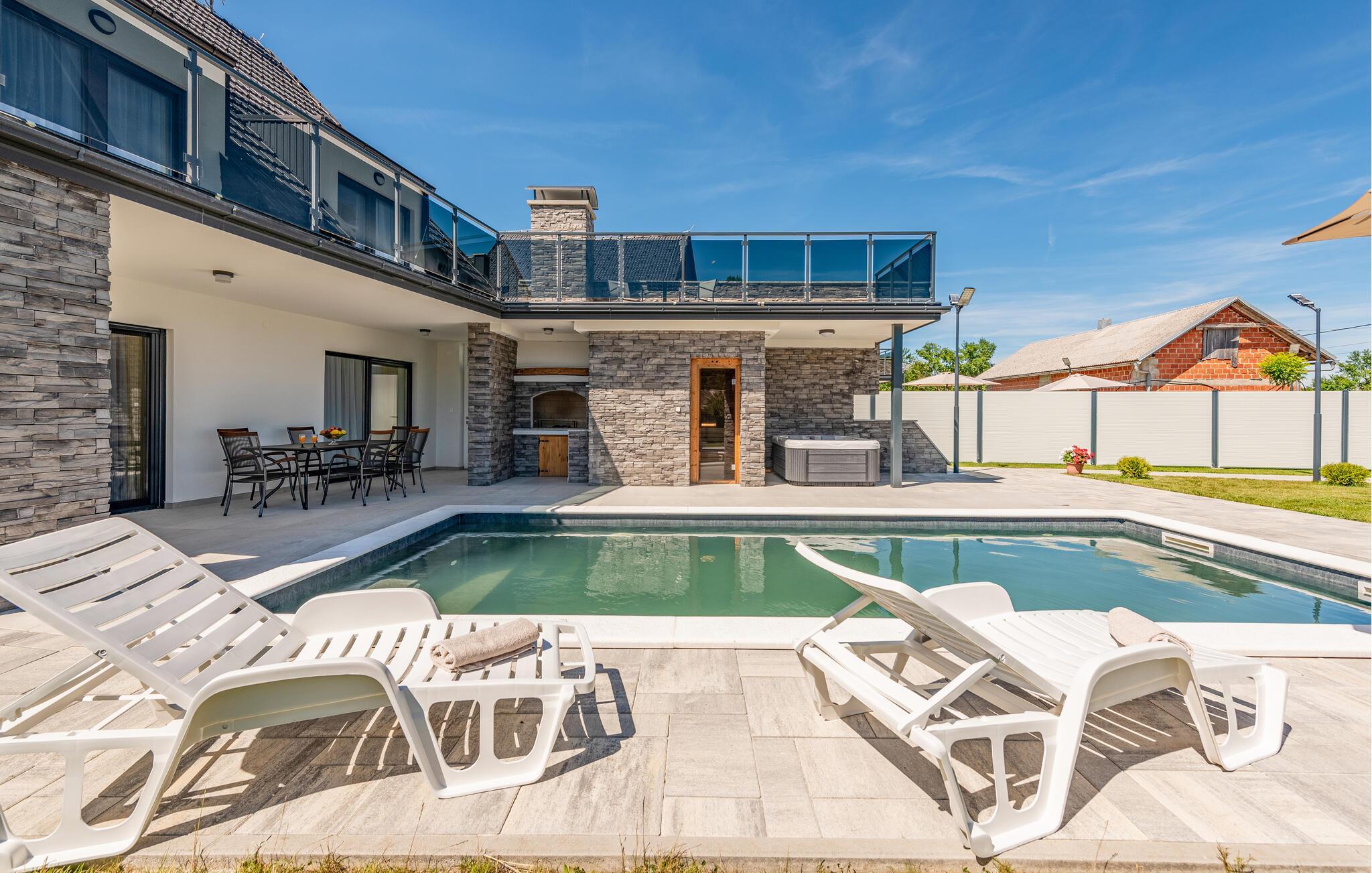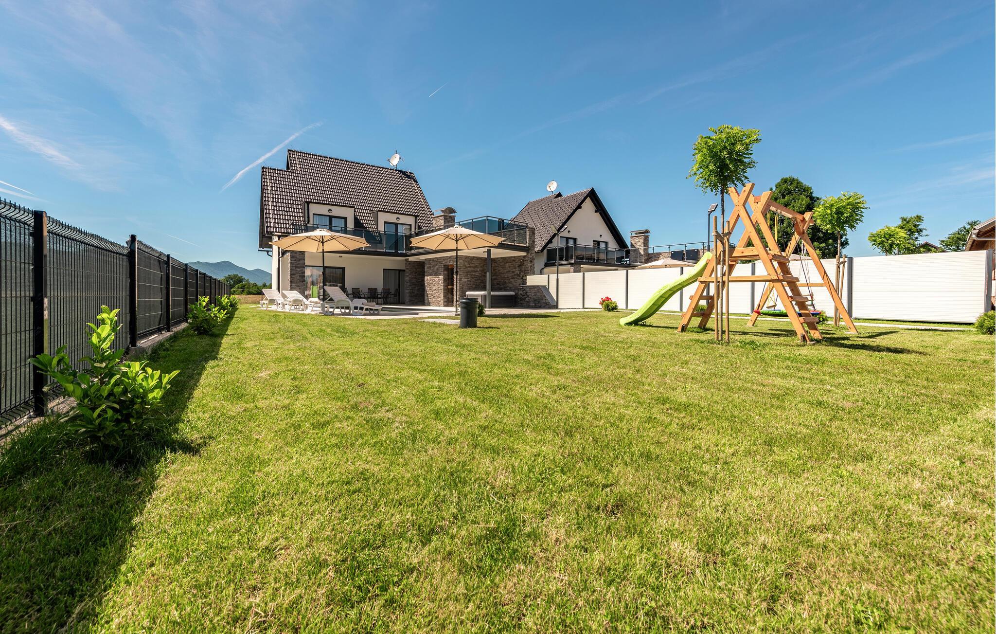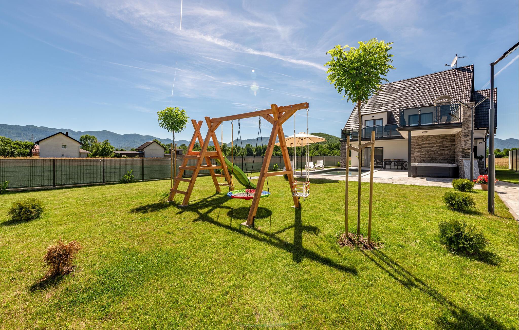 Forestill deg å sitte på den romslige terrassen og nyte den friske morgenluften eller et glass vin i hånden om kvelden. Svømmebassenget byr på forfriskninger på varme dager, mens du kan finne ren avslapning i badstuen eller boblebadet. Den velstelte hagen er et paradis for barn, som kan leke av hjertens lyst på lekeplassen mens du tilbereder middag på grillen.