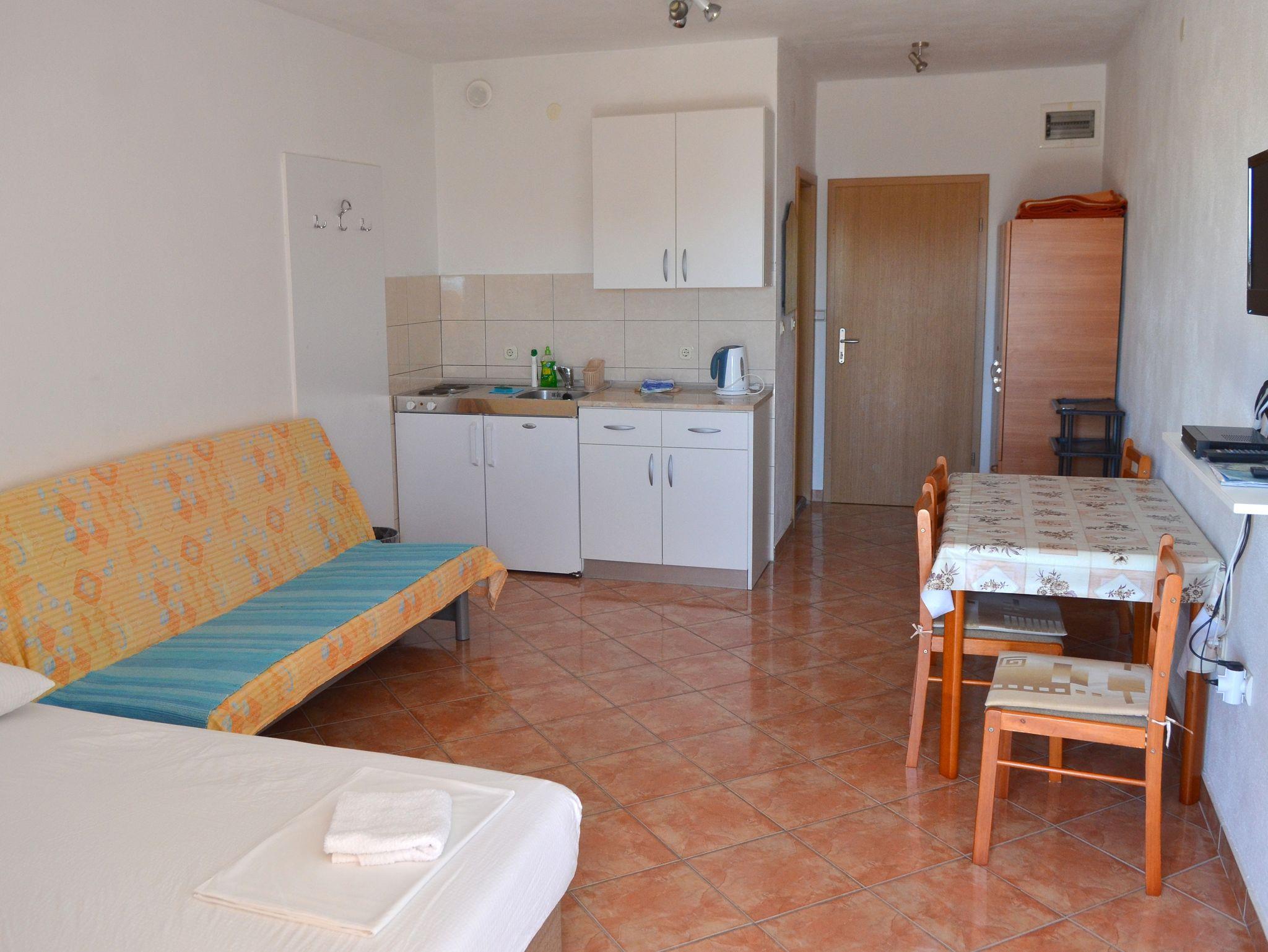 Studio bietet Platz für 3 Gäste. Die Betten sind in Schlafzimmern, die es 1 gibt, innerhalb einer Gesamtfläche von 30m2, angeordnet. Die Gäste haben einen eigenen Balkon zur Verfügung, auf der sie in warmen Sommernächten genießen können. Das Studio-Apartment bietet Meerblick. Es ist erlaubt, Speisen auf dem Gemeinschafts-Grill vorzubereiten. IM PREIS INBEGRIFFEN: Kurtaxe, Endreinigung, Klimatisierung, Parkplatz, Internet, Kinderbett. VERBINDLICHE ZUSÄTZLICHE KOSTEN: Aufzahlung für Kurzaufenthalte (prozentualer Zuschlag pro Nächtigungsanzahl: 30% - 1, 20% - 2, 10% - 3). UNVERBINDLICHE ZUSÄTZLICHE KOSTEN: Wäschewaschen (5,00 € Waschen). Die Verfügbarkeit zusätzlicher Dienstleistungen in Ihrem reservierten Termin und die Preise derselben (falls nicht aufgeführt) müssen im Voraus überprüft werden. Zusätzliche Dienstleistungen die in der Zahlungsaufforderung nicht aufgeführt sind werden direkt beim Vermieter bezahlt, angenommen der Gast nutzt auch diese. Ermäßigung auf den Grundpreis: Gratistag 21=19 (bei einem Aufenthalt von 21 Tagen oder mehr erhalten Sie 2 Gratistage für den Aufenthalt bis 31.12.26).