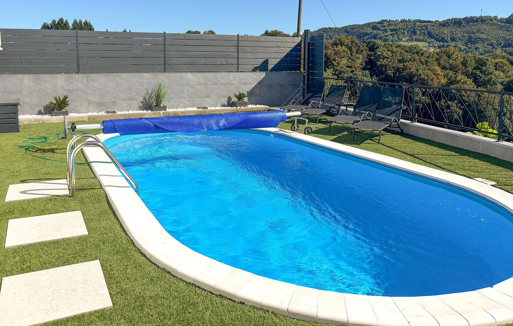 Nyt avslappende dager i dette moderne feriehuset med basseng, badstue og fortryllende panoramautsikt.