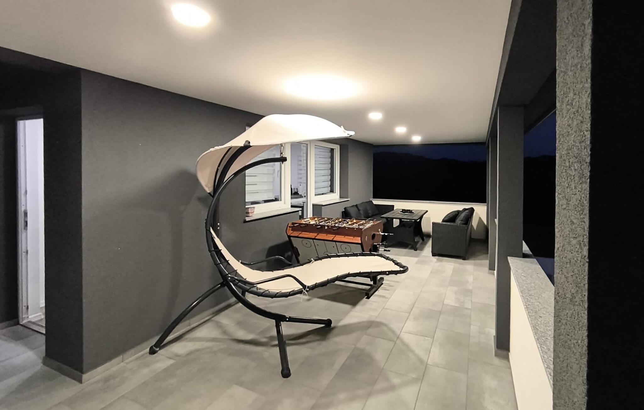 Dette romslige og komfortable feriehuset har attraktive ekstrafunksjoner for hele familien for å gjøre ferien til en variert opplevelse. Gled dere til gode måltider og koselige stunder i badstuen, la barna more seg på dartskiven, ved foosballbordet eller med airhockey, og planlegg aktivitetene over et glass vin i den koselige sofagruppen.