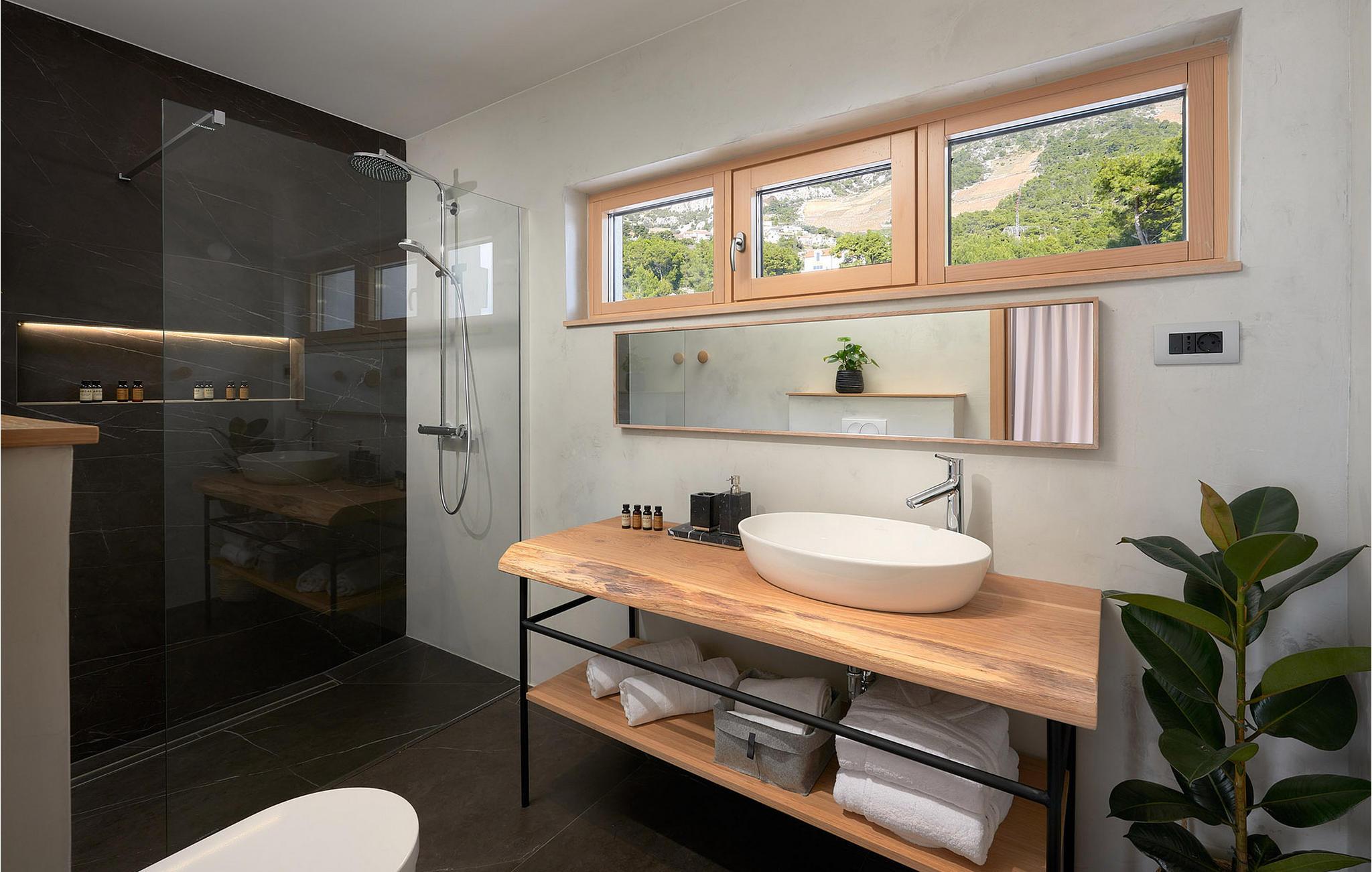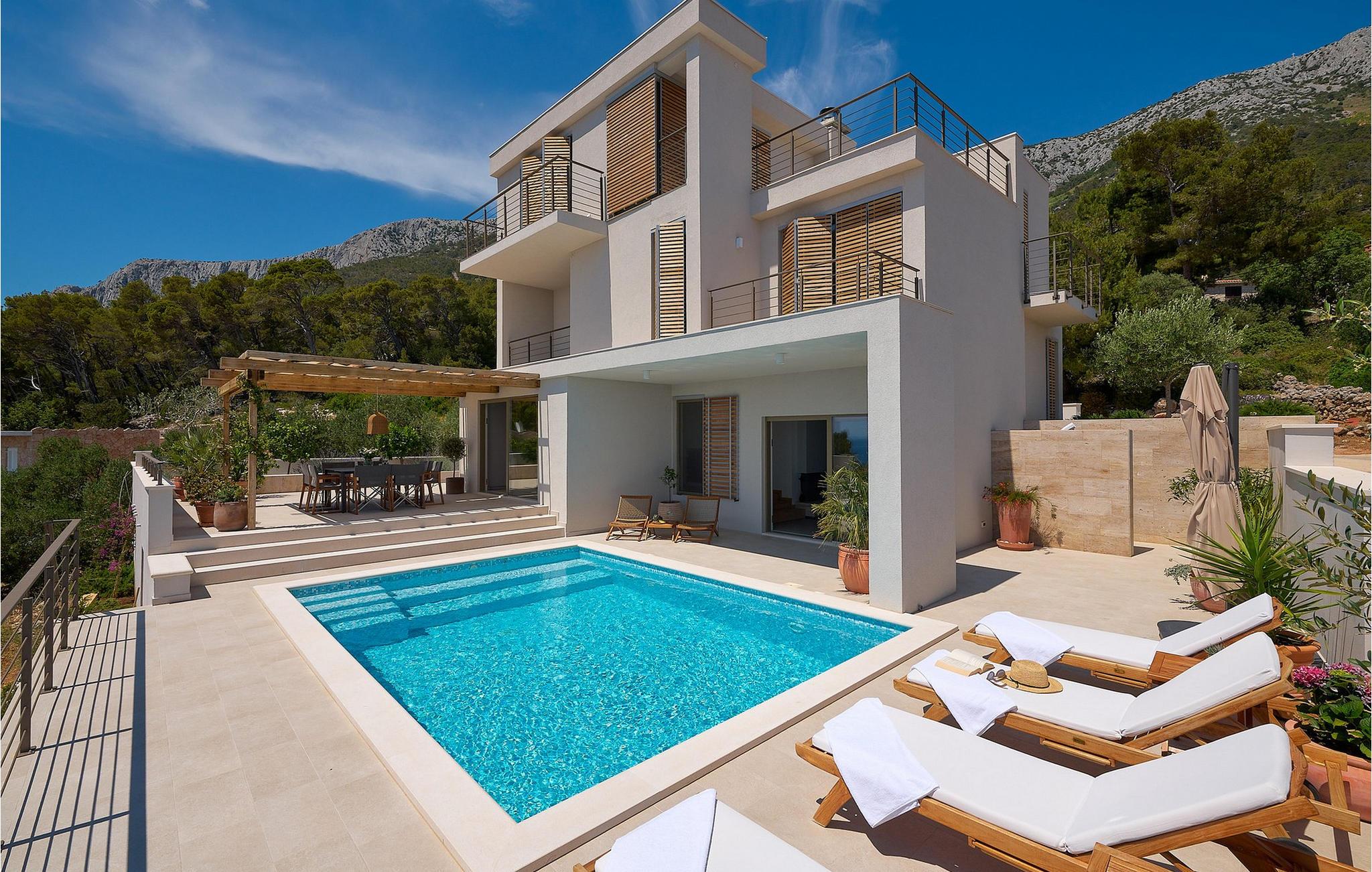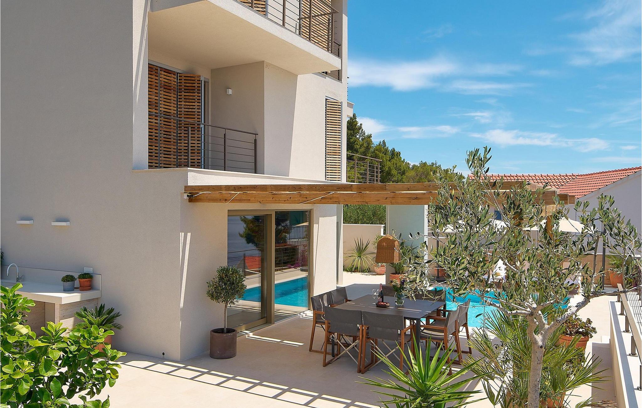 Den luksuriøse designervillaen Bianca Hvar har en sublim beliggenhet på en høyde med utsikt over havet, og byr på uforglemmelig utsikt over Adriaterhavet og den ville middelhavsvegetasjonen. Gå inn og la deg inspirere av det stilfulle interiøret av høy kvalitet, der store vindusfronter åpner opp den fantastiske utsikten over havet og bader de harmoniske rommene i et behagelig, varmt lys. Nyt harmoniske måltider i den lyse spisestuen, sett deg godt til rette med en god bok i den koselige stuen etter en begivenhetsrik dag, eller lytt til den åpne peisens milde knitring mens du har stimulerende samtaler.
