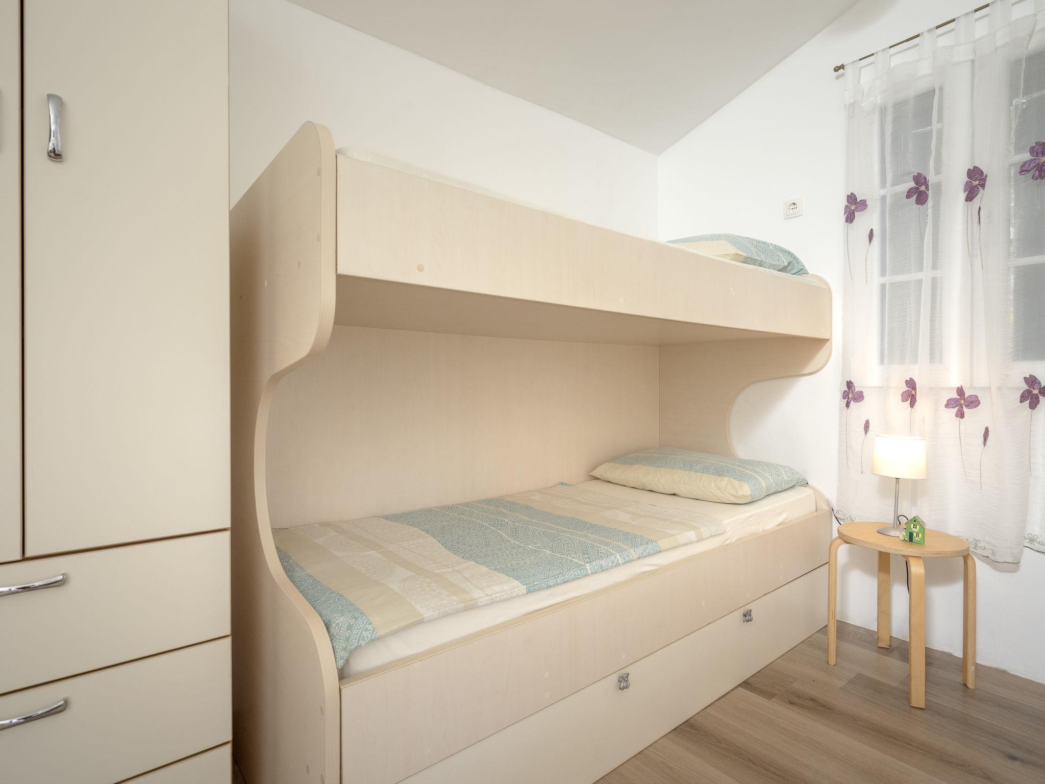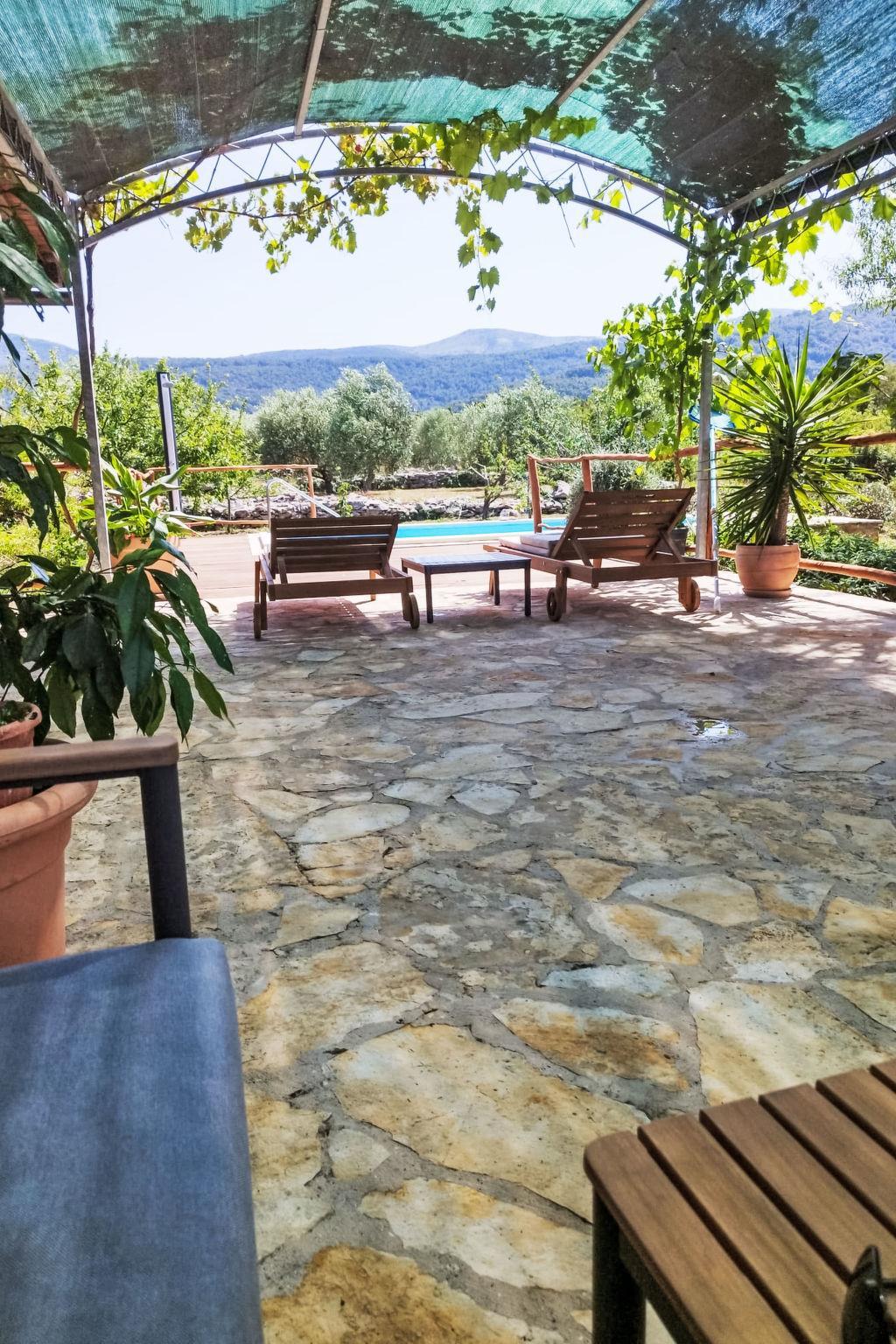 1-room house 20 m2, south facing position. Living/sleeping room with 1 x 2 bunk beds (80 cm, length 200 cm), 1 french bed (160 cm, length 200 cm), satellite TV (flat screen), air conditioning. Exit to the terrace. Open kitchen (2 hot plates) with dining table. Shower/WC. Terrace 100 m2 partly roofed. Terrace furniture. View of the swimming pool and the countryside. Facilities: Internet (WiFi, free).