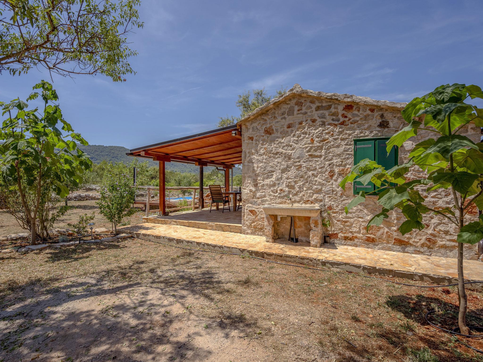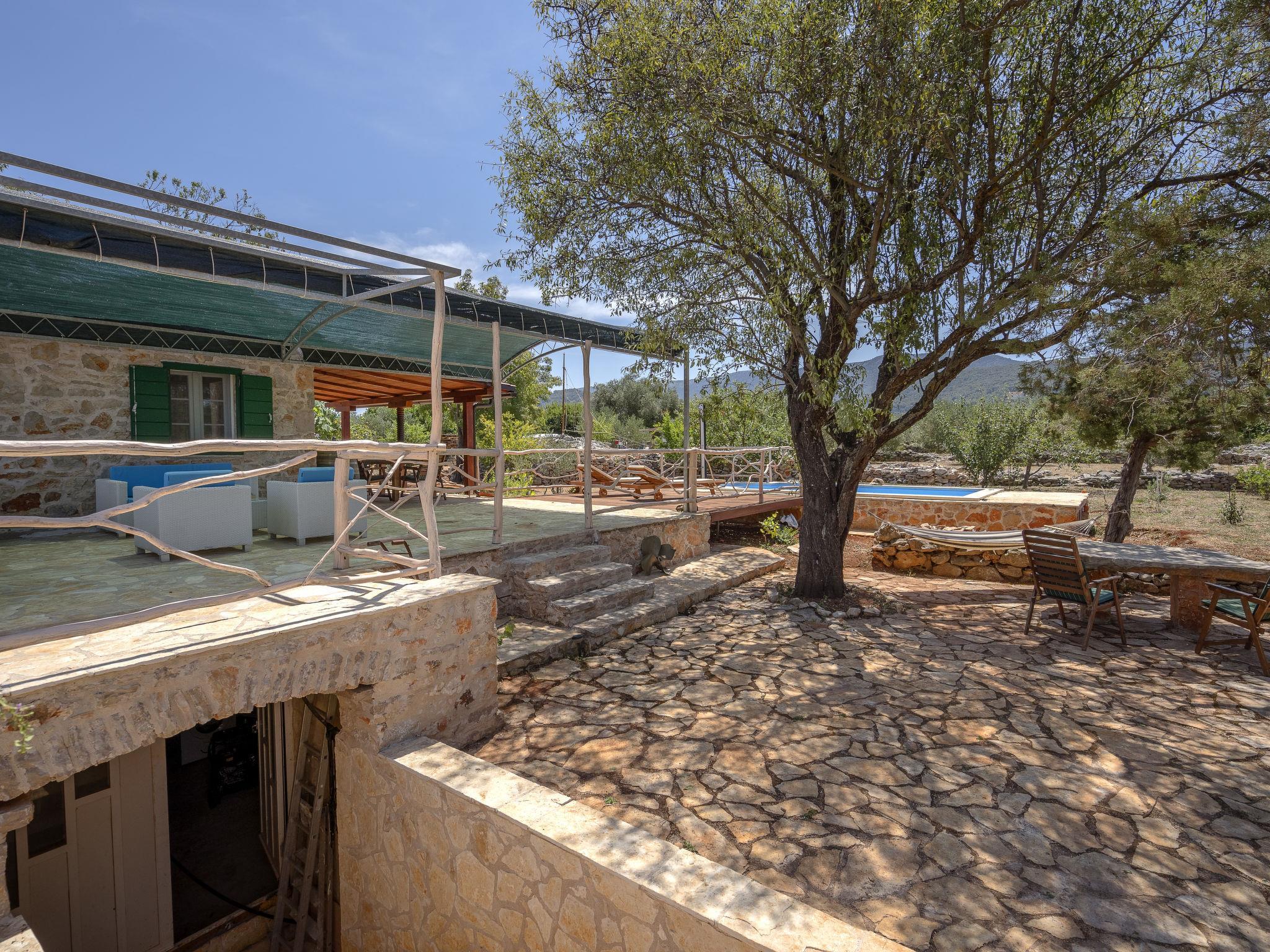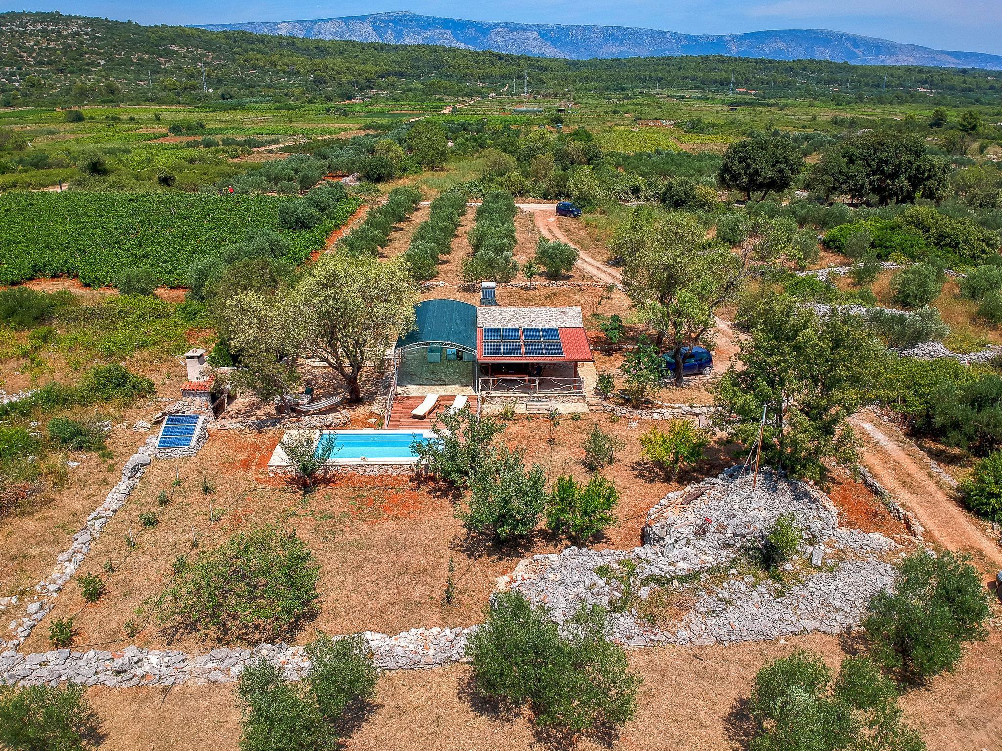 Single-family house "Marijo". 1.7 km from the centre of Stari Grad, in a quiet, sunny position, 1.7 km from the sea, 3 km from the beach. Private: property 5'700 m2, swimming pool angular (6 x 3 m, depth 135 cm, seasonal availability: 01.May. - 01.Oct.) with internal staircase and alarm system. Terrace (50 m2), garden furniture, barbecue. In the house: internet access. Parking (for 2 cars) at the house on the premises. Shop 1.7 km, restaurant 1.7 km, bus stop 71.2 km, rocky beach 3 km.