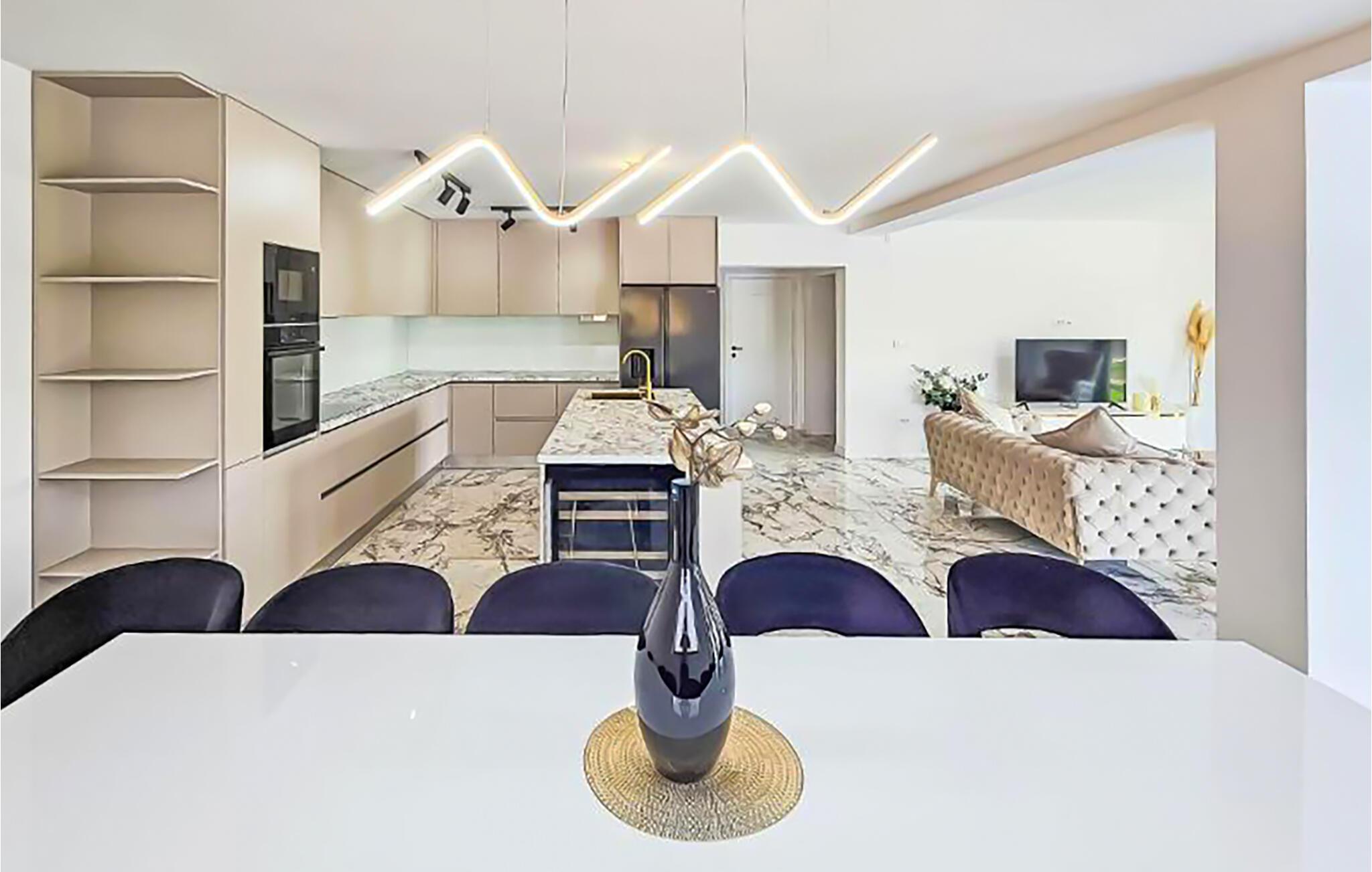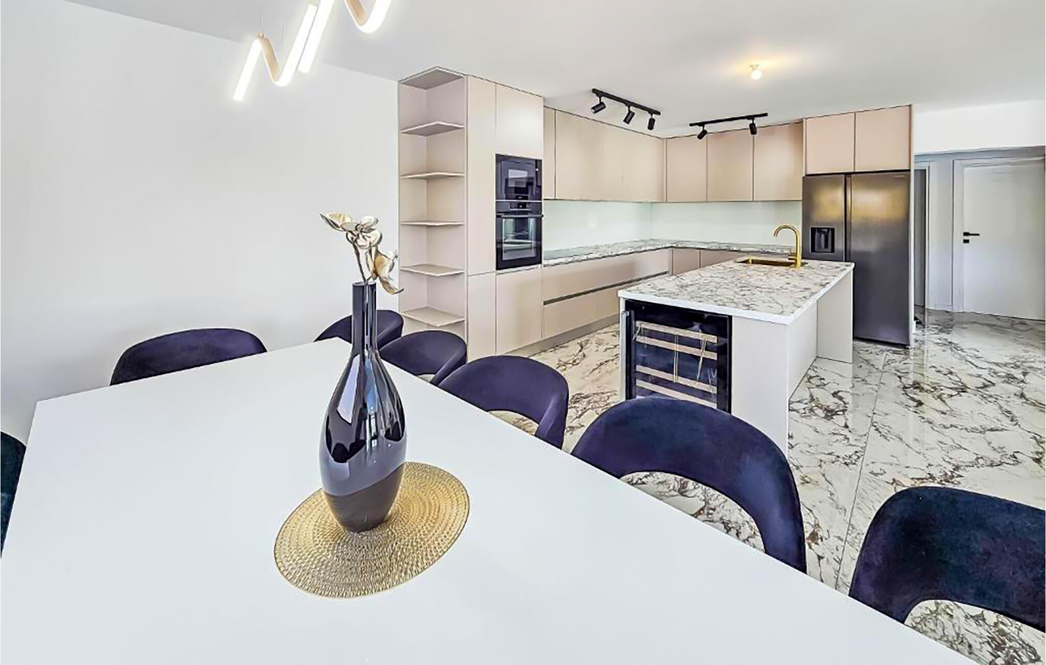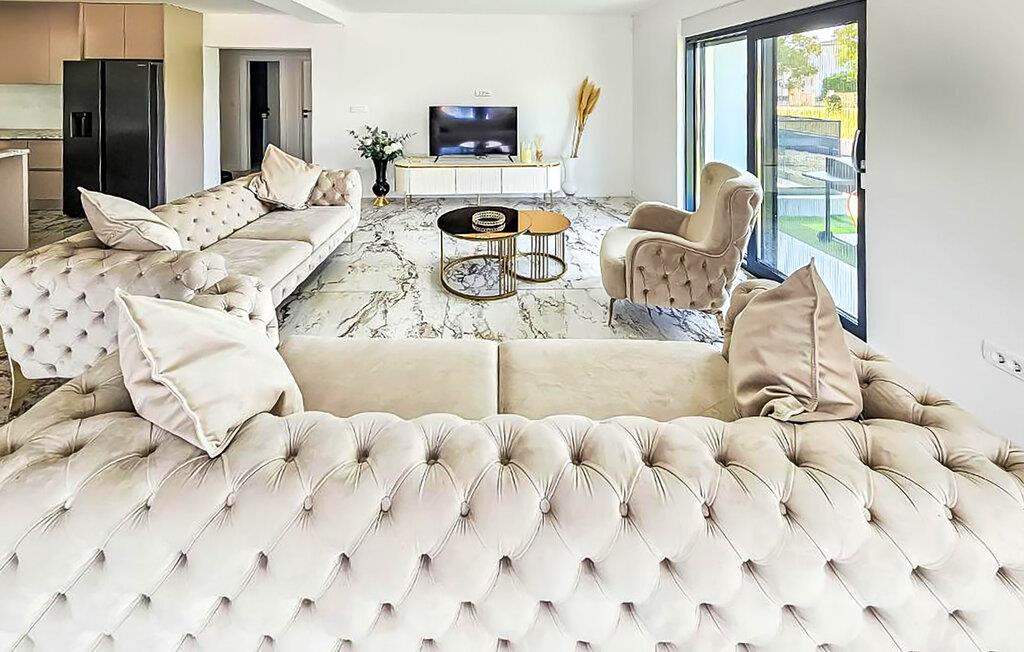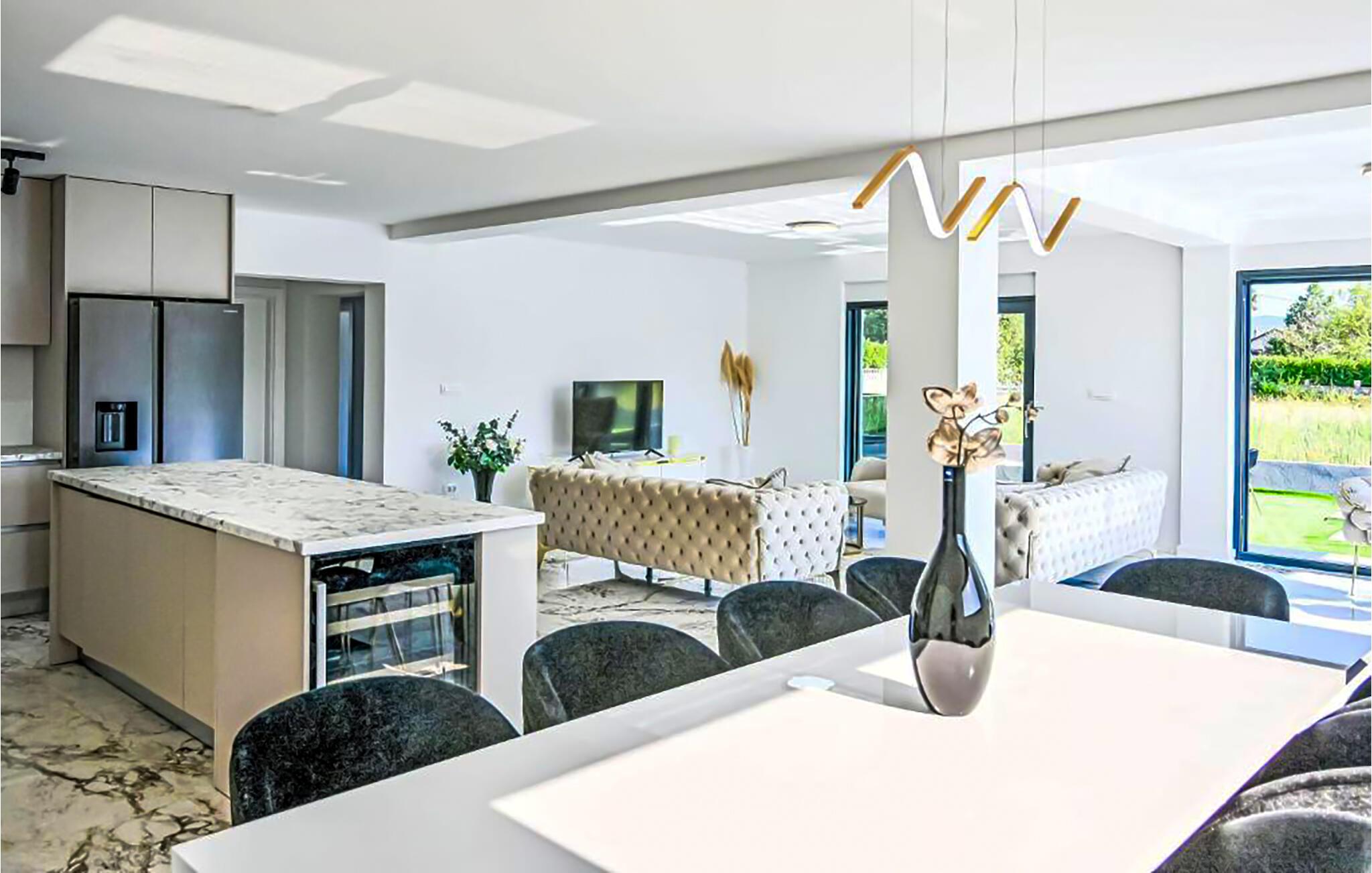 Denne romslige og moderne villaen har god plass til å dele den stilfulle atmosfæren med en større familie eller vennegjeng. Du kan trylle frem kulinariske høydepunkter i hyggelige sammenkomster, samles til avslappede måltider i den elegante spisestuen og kose deg i sofaene av høy kvalitet med en god film eller en spillkveld etter en lang dag i solen.