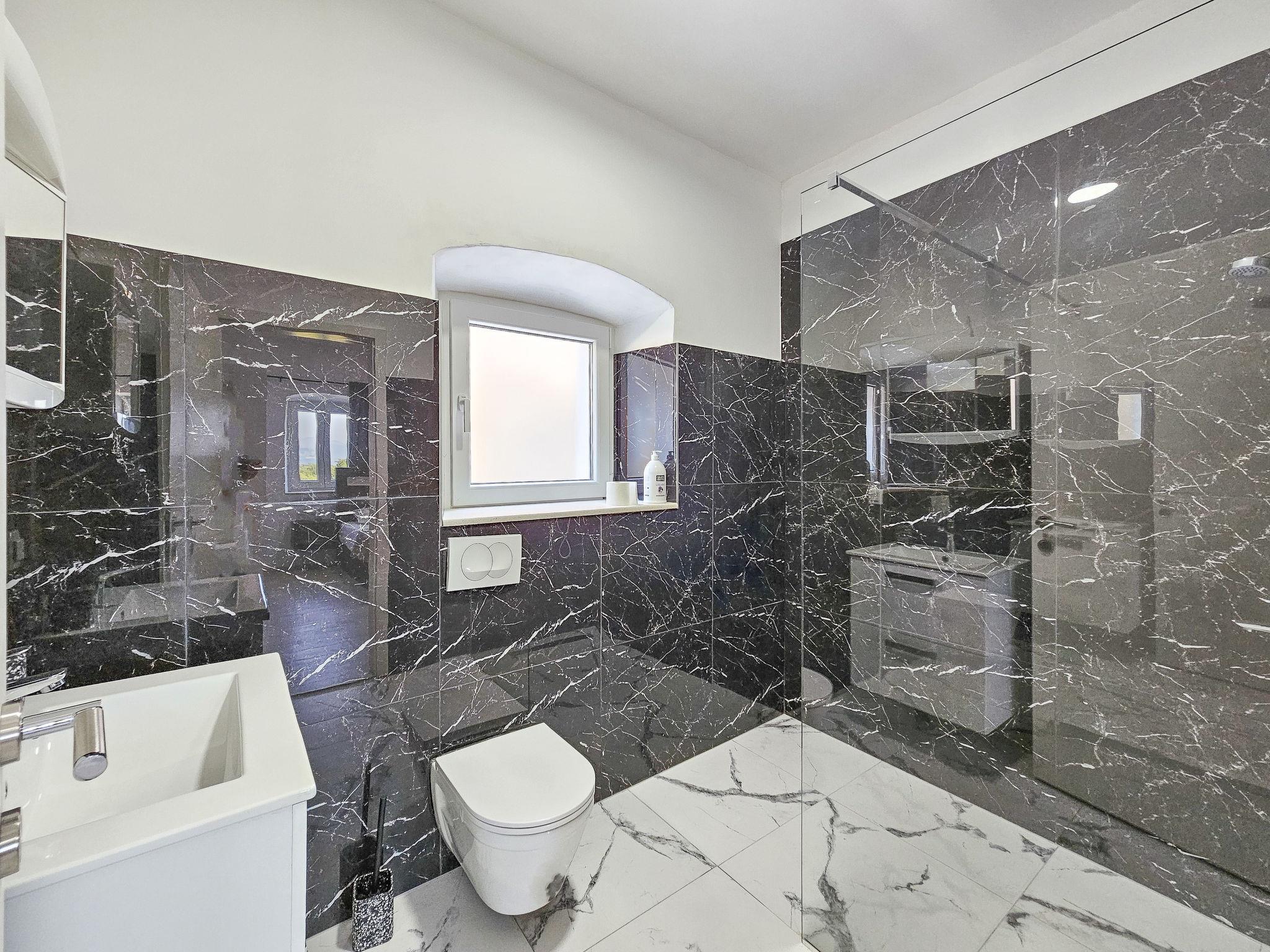 4-room apartment 110 m2 on 2 levels. On the lower ground floor: living room 27 m2 with satellite TV, flat screen and air conditioning. Exit to the terrace. Dining room. Exit to the terrace. Open kitchen (oven, dishwasher, 4 induction hot plates, kettle, microwave, freezer) with dining table, air conditioning. Shower/WC. Upper floor: 2 rooms, each room with 1 double bed (180 cm, length 200 cm), shower/WC and air conditioning. Terrace 22 m2. Terrace furniture, barbecue, deck chairs (4). Beautiful view of the countryside. Facilities: hair dryer. Internet (WiFi). Please note: non-smokers only.