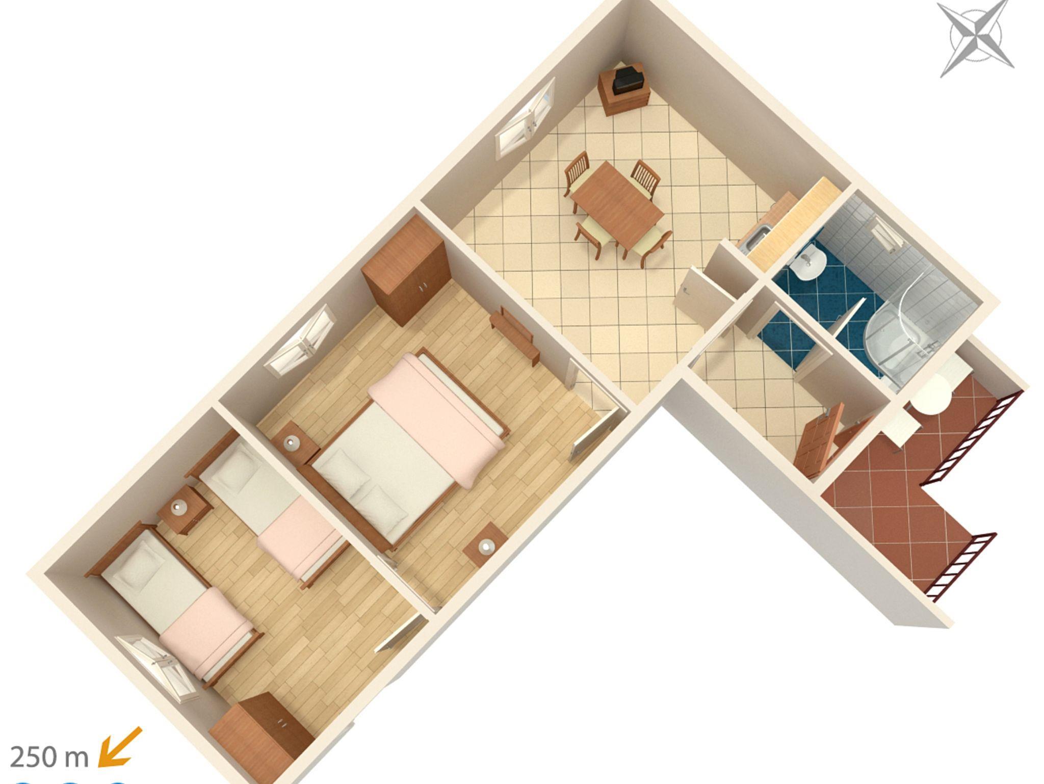 Ferienwohnung bietet Platz für 5 Gäste. Die Betten sind in Schlafzimmern, die es 2 gibt, und in Esszimmer, innerhalb einer Gesamtfläche von 36m2, angeordnet. Die Gäste haben einen eigenen Balkon zur Verfügung, auf der sie in warmen Sommernächten genießen können. Es ist erlaubt, Speisen auf dem Gemeinschafts-Grill vorzubereiten. In der Unterkunftseinheit besteht die Möglichkeit des Mitbringens von Haustieren gegen Aufpreis. Durch das Schlafzimmer der gebuchten Unterkunftseinheit geht man in die andere Räume der Einheit. IM PREIS INBEGRIFFEN: Kurtaxe, Endreinigung, Parkplatz, Sonnenschirm. VERBINDLICHE ZUSÄTZLICHE KOSTEN: Aufzahlung für Kurzaufenthalte (prozentualer Zuschlag pro Nächtigungsanzahl: 30% - 1, 20% - 2, 10% - 3). UNVERBINDLICHE ZUSÄTZLICHE KOSTEN: Haustiere (5,00 € pro Nacht). Die Verfügbarkeit zusätzlicher Dienstleistungen in Ihrem reservierten Termin und die Preise derselben (falls nicht aufgeführt) müssen im Voraus überprüft werden. Zusätzliche Dienstleistungen die in der Zahlungsaufforderung nicht aufgeführt sind werden direkt beim Vermieter bezahlt, angenommen der Gast nutzt auch diese.