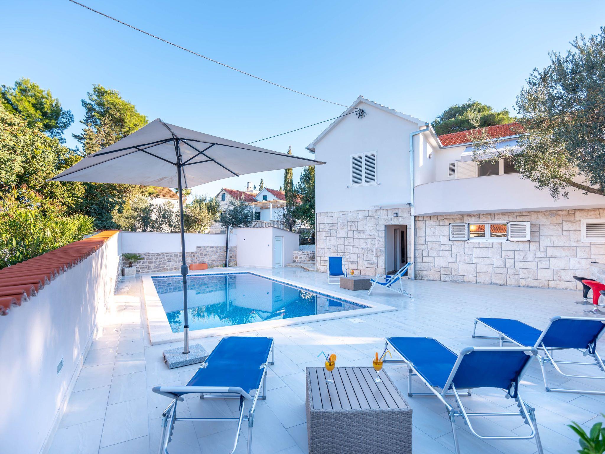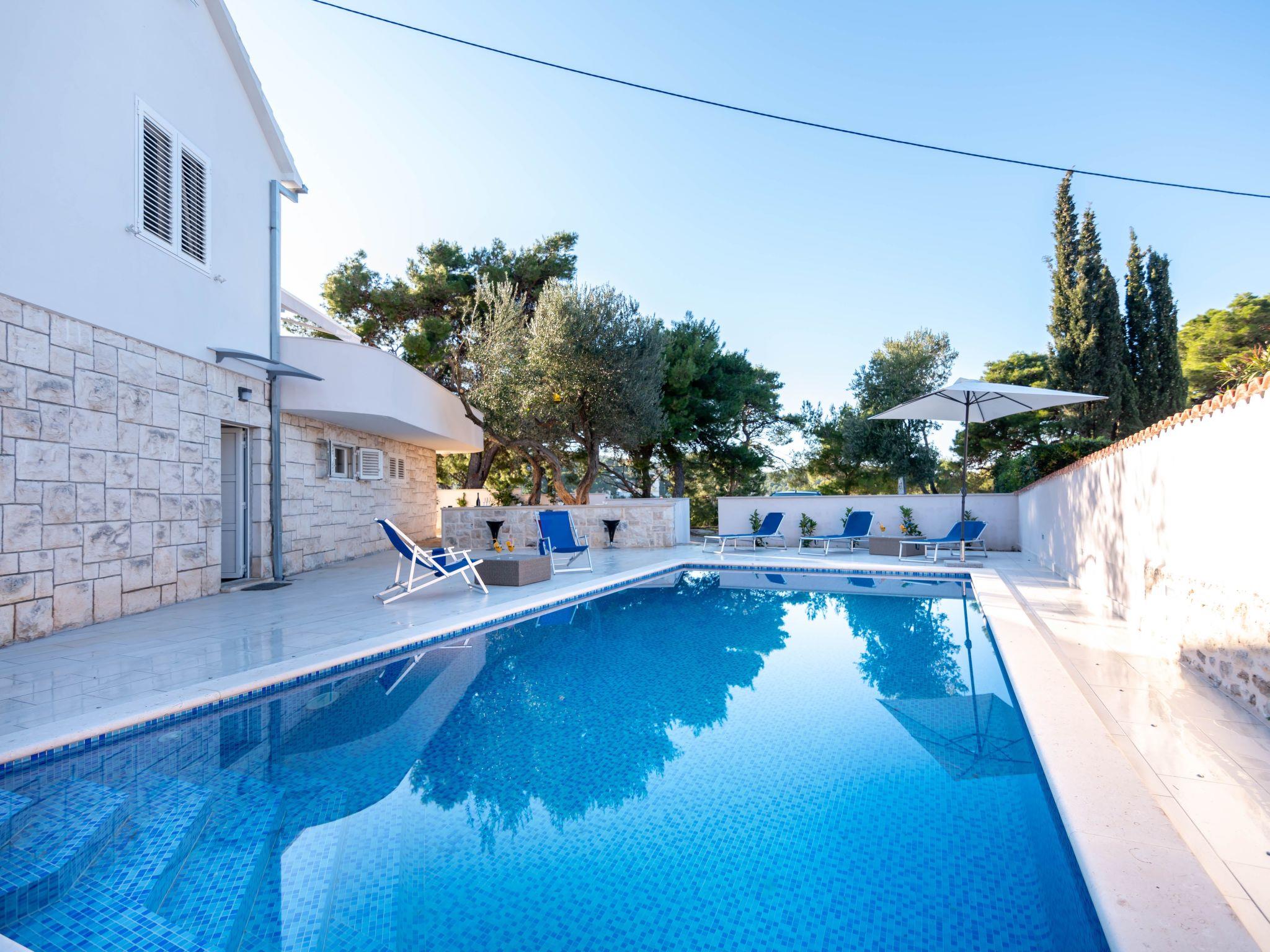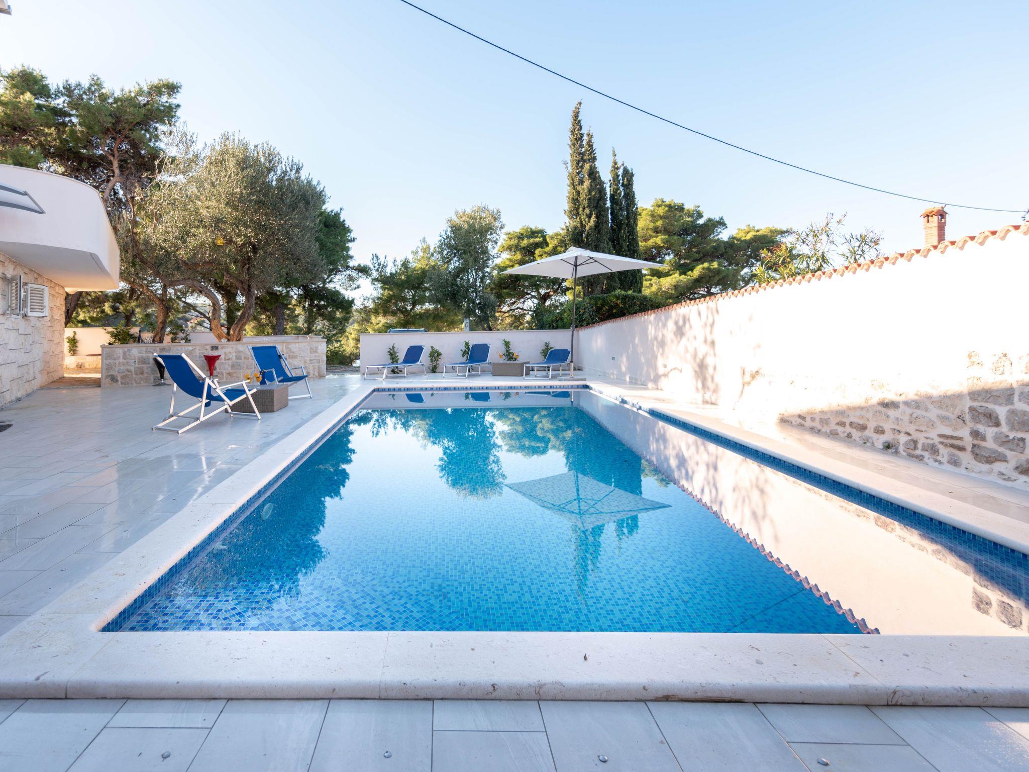 Villa is located on the right side of the bay, in a pine forest and is only 50 meters from the sea. Villa has a large pool & which is surrounded with stone paved yard on which there is a fireplace, table with chairs under the olive tree, an outdoor shower and sunbeds.