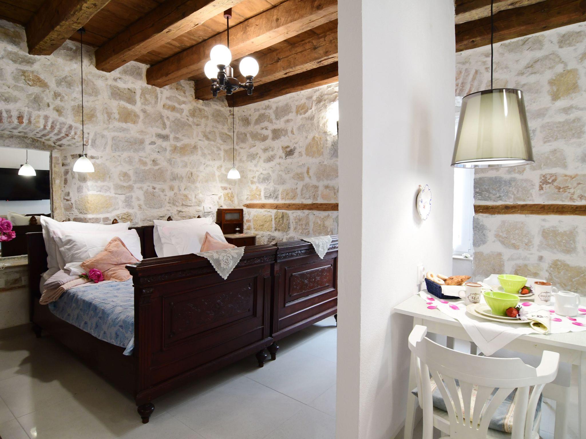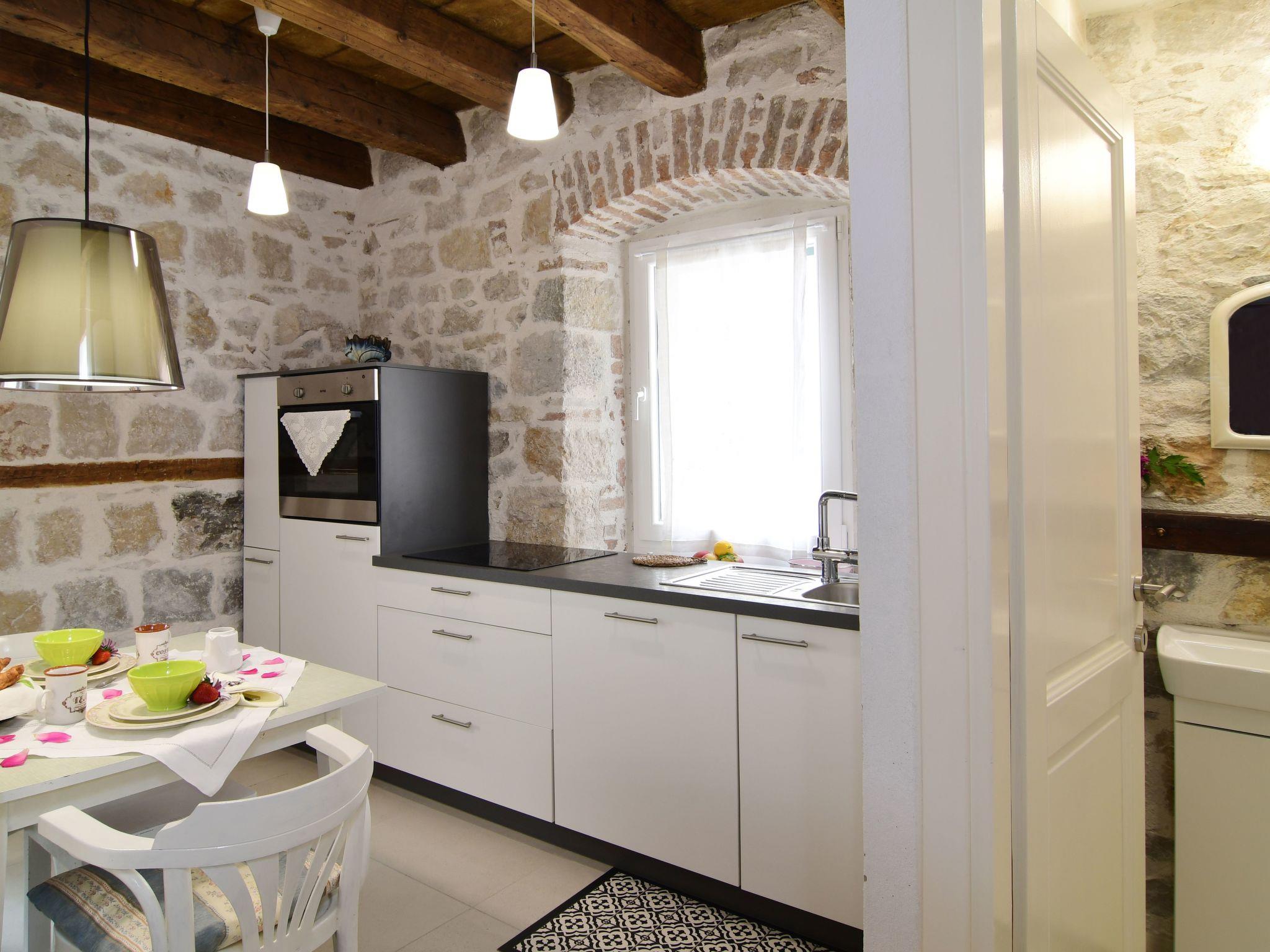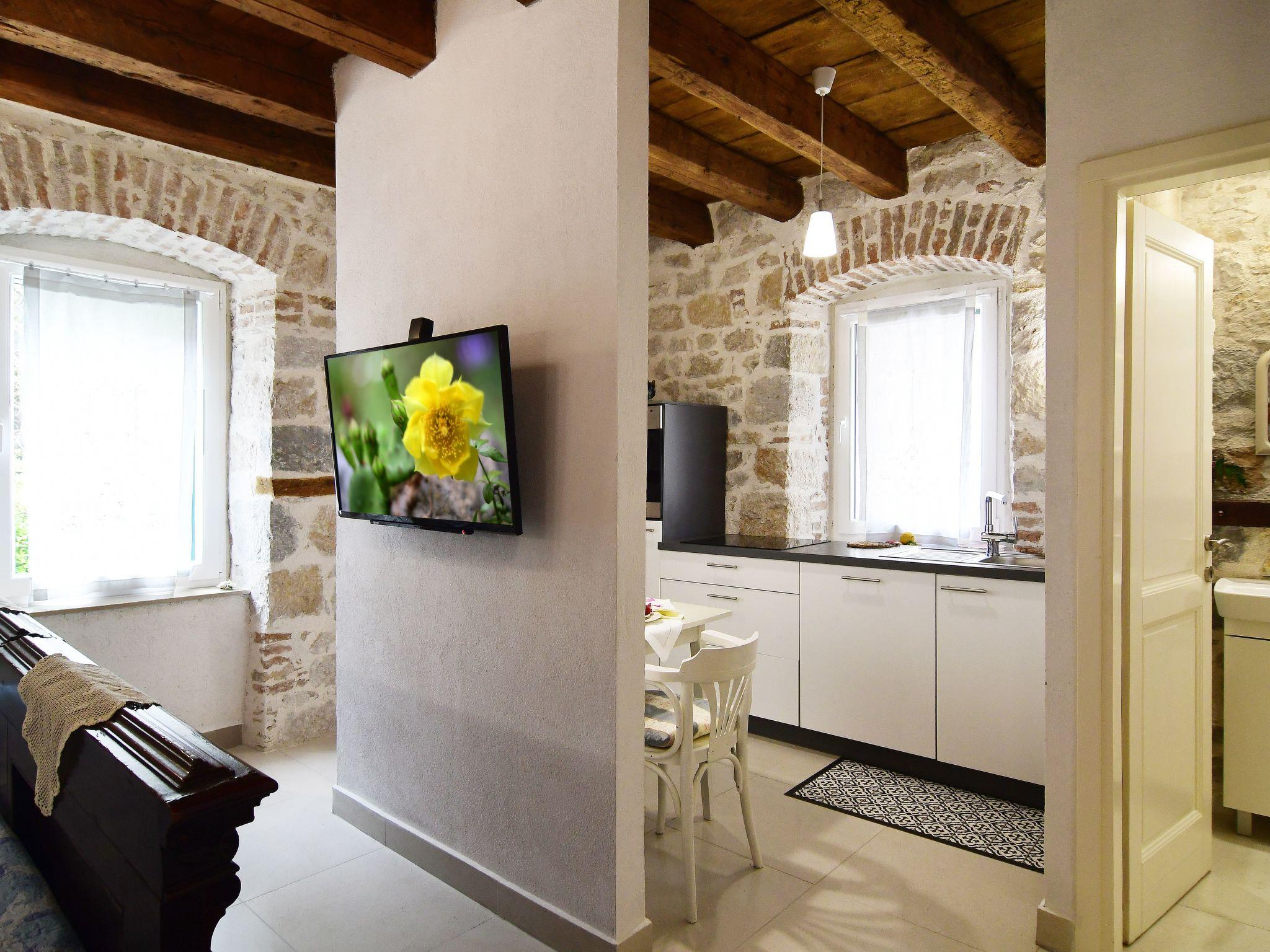 embellished with a traditional patio with an atmospheric fireplace that will make your stay in the very centre of Kastel Kambelovac unique, as if you were in the times of the noble Cambi founders of the third of the seven castles located between the cities of Split and Trogir.