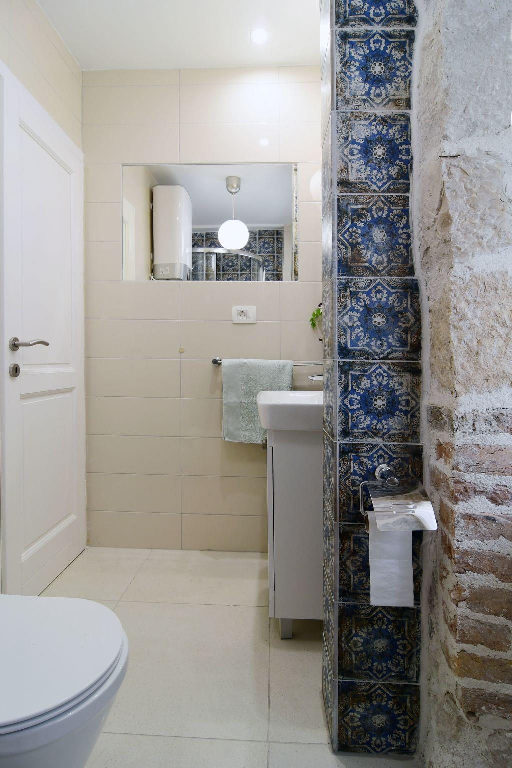 The washing machine is located at the entrance in common with the ground floor studio apartment.