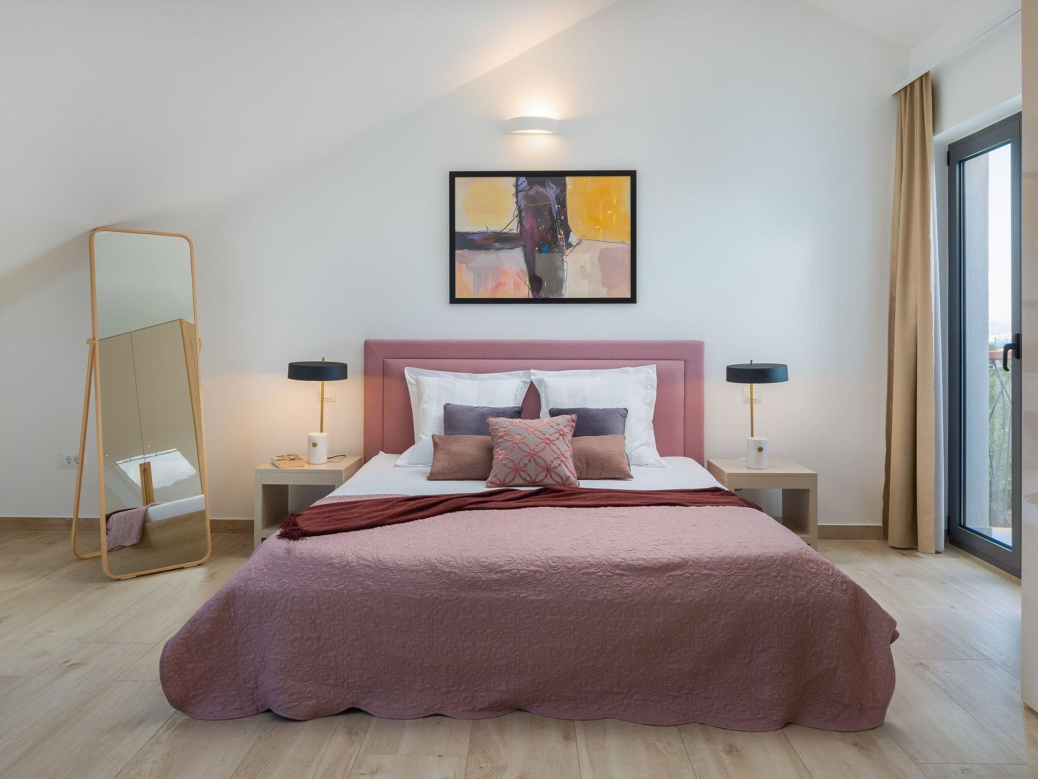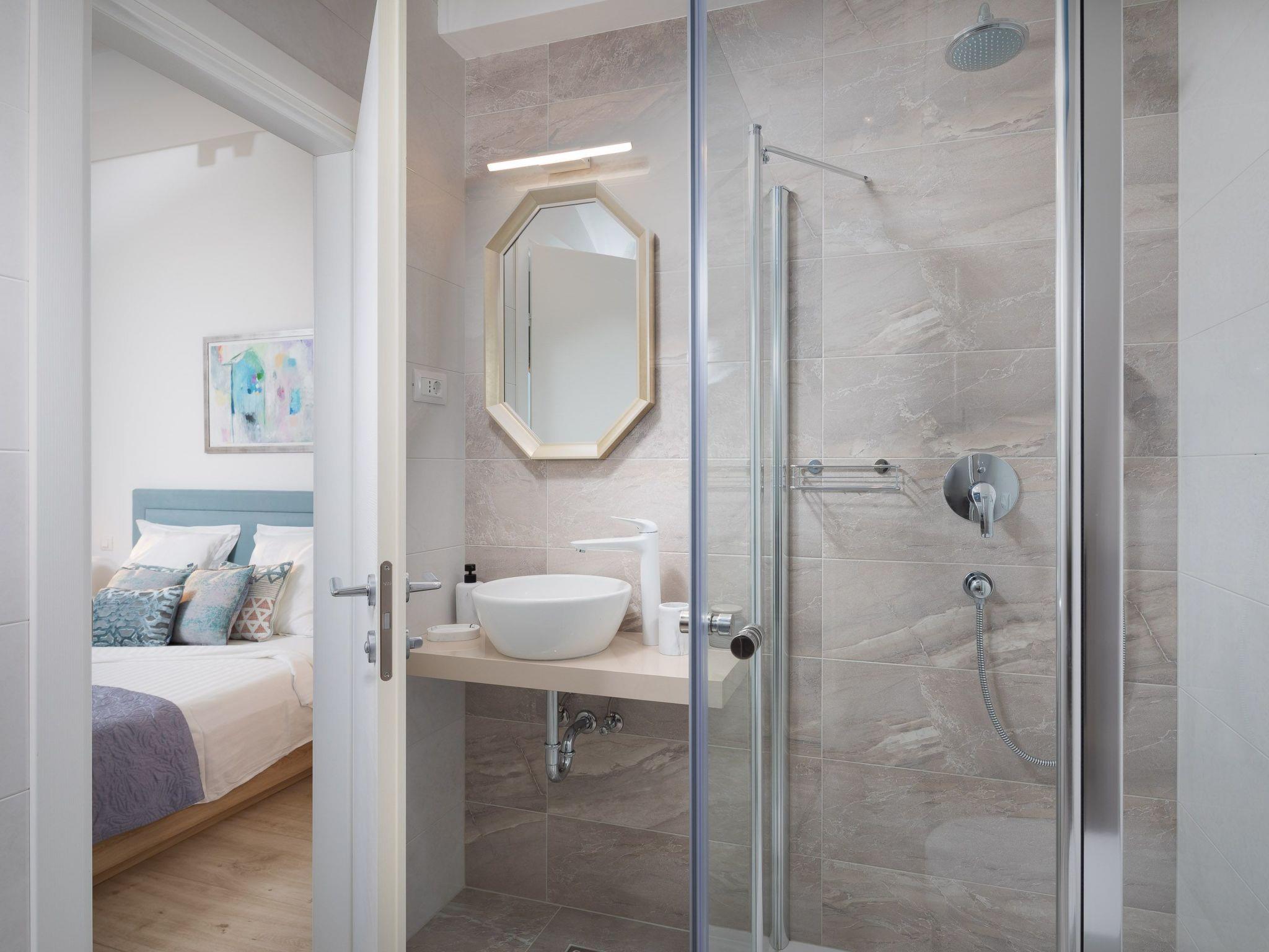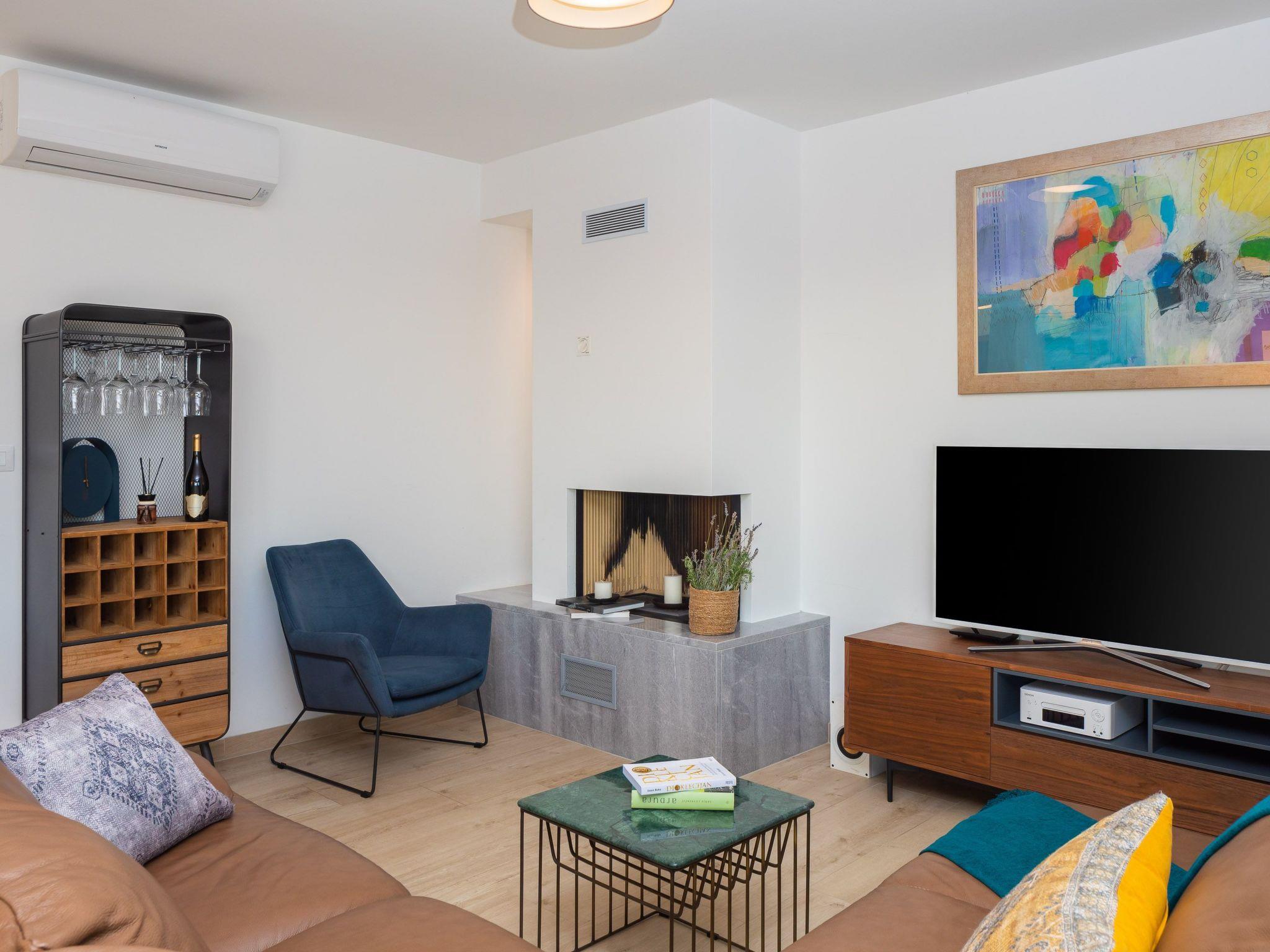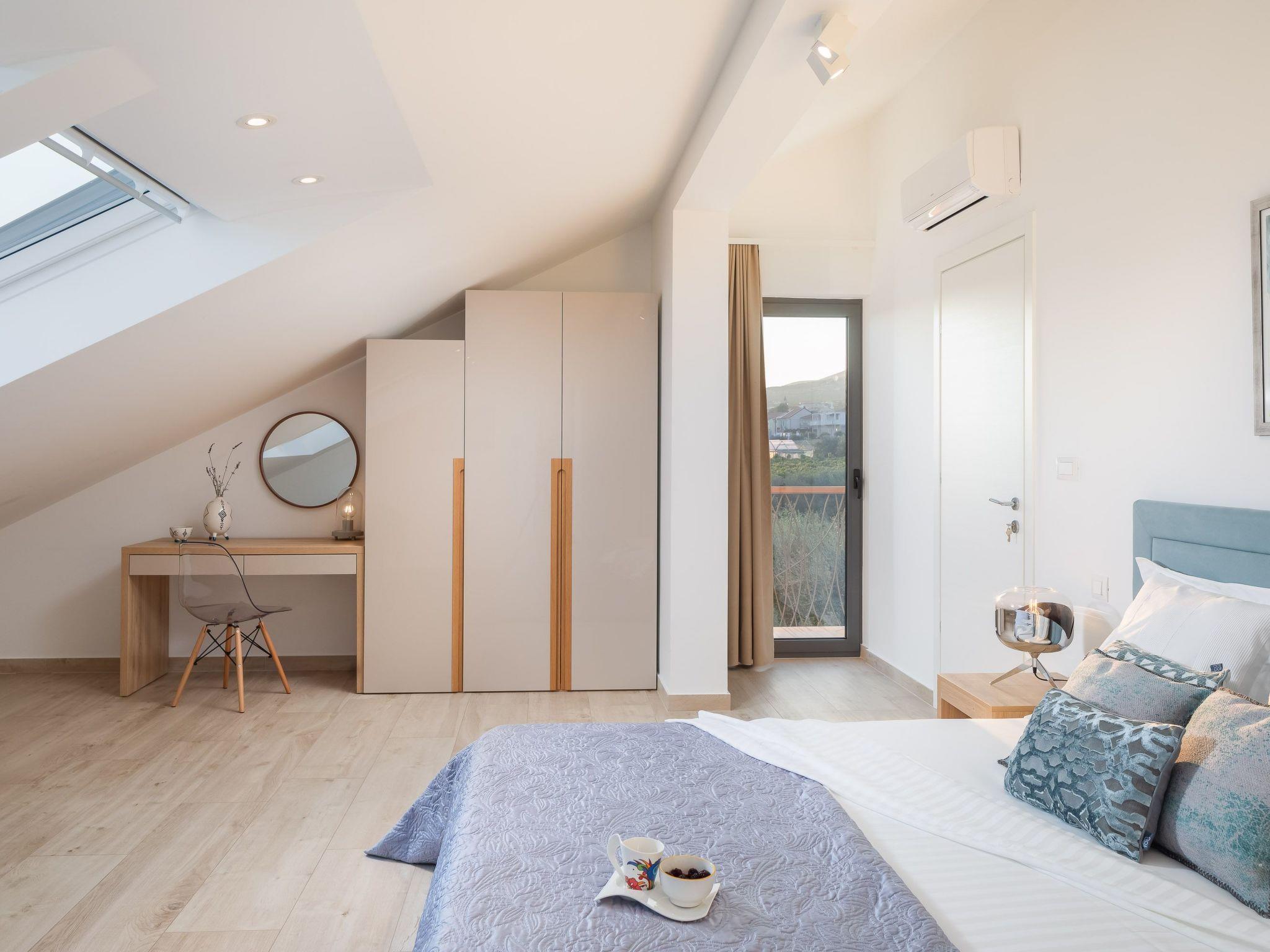 Villa Cvita has ground floor and first floor. There are 4 en suite bedrooms in the house, two are on the ground floor and two upstairs. All rooms have double beds 1.80m wide and 2m long. All rooms have bathrooms with shower, and one room on the ground floor has a bathtub. All rooms have exits either to the garden or balcony. All rooms have WiFi and Smart TVs with satellite and Netflix connection. Kitchen is located on the ground floor with dining table, right next to large glass door which can be completely opened, giving you the al fresco dining feeling. All modern appliances and dishes, as well as electric appliances used for preparing food can be found in kitchen cabinets.The living room has one big L shape leather sofa and an armchair. All rooms in the house have AirCon and are fully furnished.