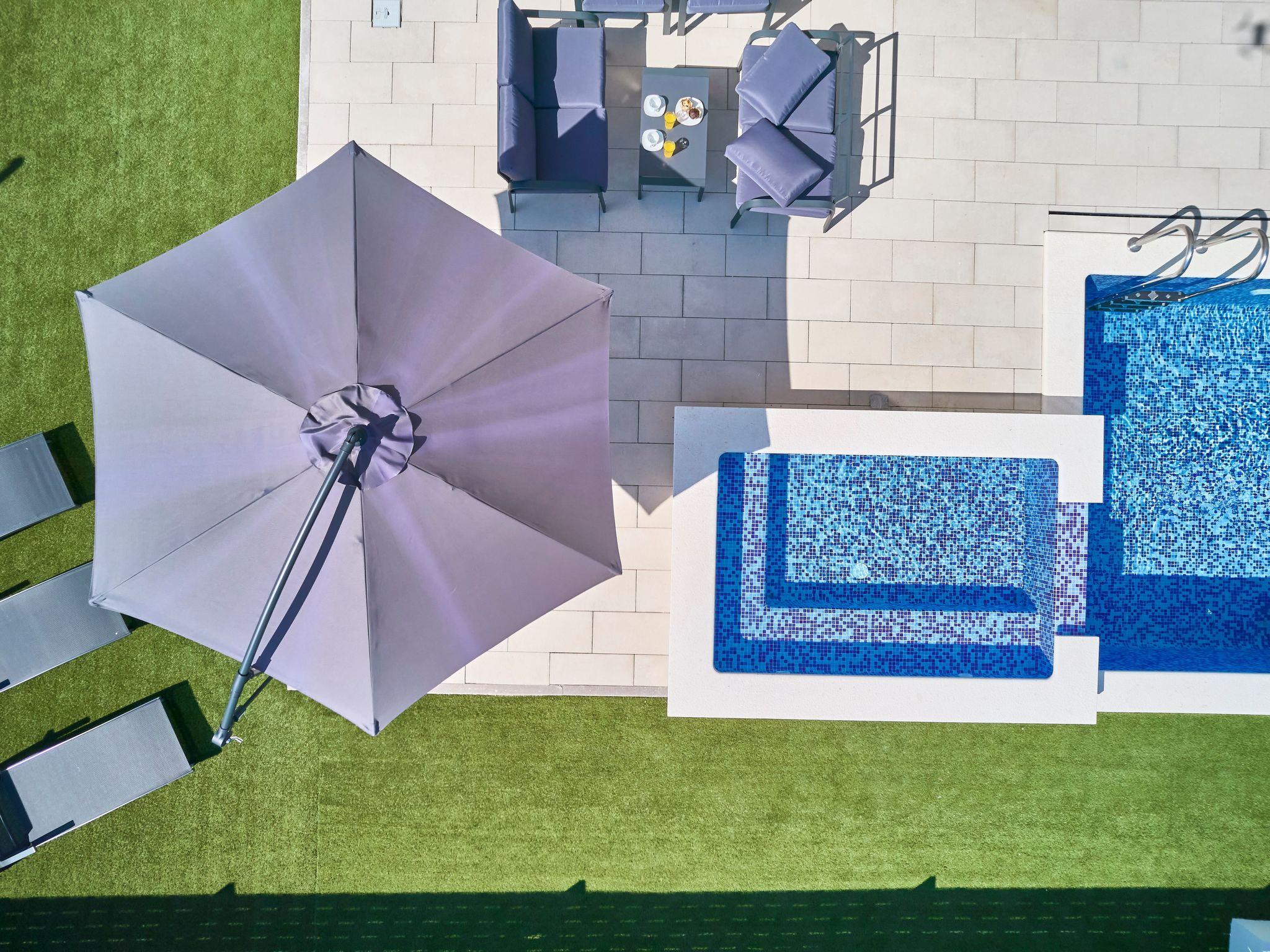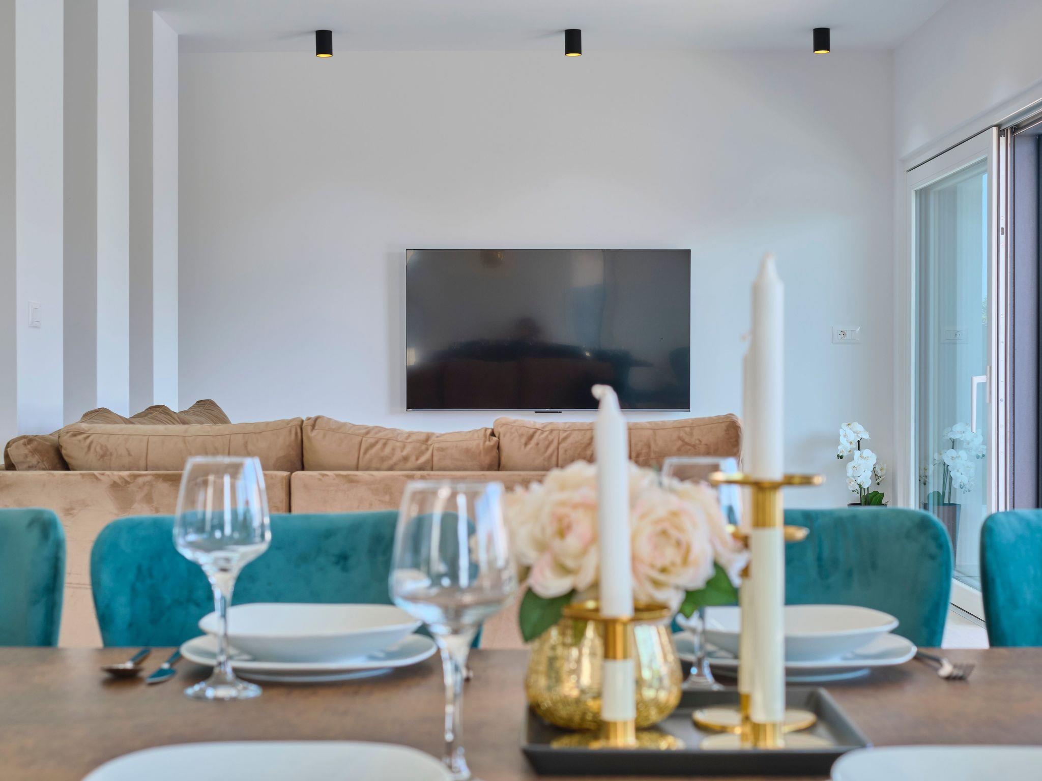 The ground floor features a spacious and comfortable living room with a smart TV and a pool area exit. Open space leads to the dining room and the kitchen with a storage room. There is also a bedroom with an ensuite bathroom and a guest toilet.