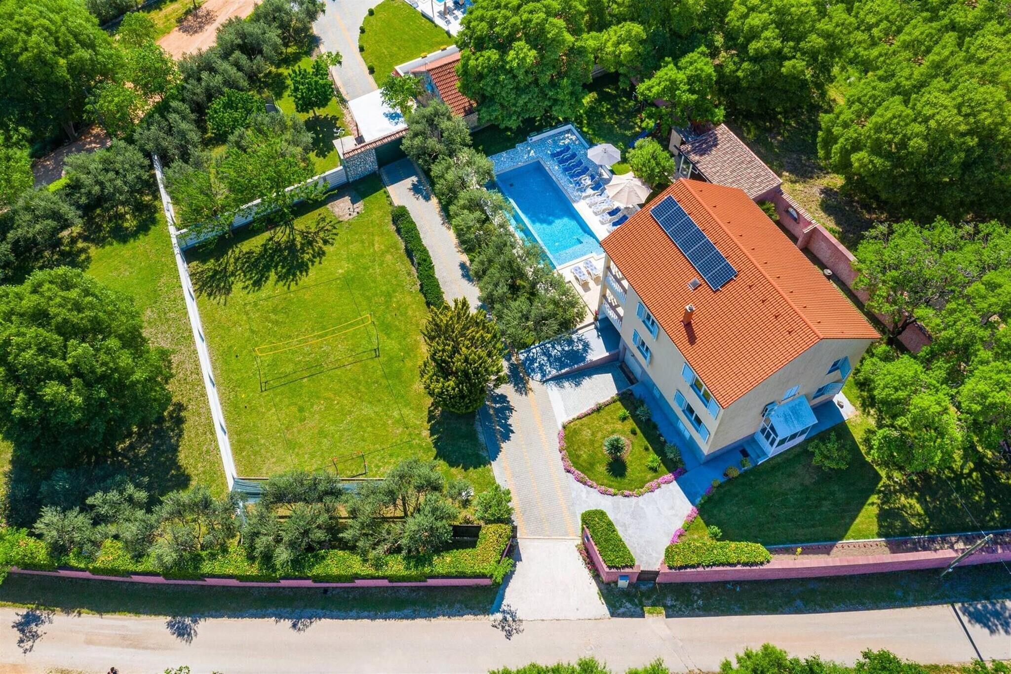 Dette sjarmerende feriehuset ligger i den fredelige landsbyen Kakma, bare 7 km fra strendene i Biograd, og tilbyr den perfekte blandingen av avslapning og rekreasjon for familier eller grupper. Feriehuset Blanka ligger på en privat eiendom omgitt av grøntområder og tilbyr privatliv, plass og komfort for opptil 12 gjester. Den rolige beliggenheten, kombinert med enkel tilgang til kysten og nærliggende attraksjoner, gjør det til et ideelt reisemål for en stressfri ferie i Dalmatia. Villaens 260 m² store interiør er fordelt på to fullt utstyrte etasjer, med 5 soverom med aircondition, 3 moderne bad, 2 kjøkken og en stor, lys stue. Hver etasje har utgang til en overbygd terrasse med uteservering, perfekt for familiemåltider i friluft. Det smakfullt innredede interiøret sikrer alle hjemmets bekvemmeligheter, samtidig som det gjenspeiler en avslappet middelhavsatmosfære. Ute kan gjestene nyte et privat 55 m² stort evighetsbasseng med solsenger, et sommerkjøkken, grillfasiliteter og en romslig spiseplass. Det er også en lekeplass for barn og en multifunksjonell idrettsbane, som gir mange underholdningsmuligheter for alle aldre. Naturelskere vil sette pris på nærheten til Vrana-sjøen, kjent for fiske og fugletitting, mens båtturer til Kornati nasjonalpark avgår daglig fra Biograd. Med Zadar og Šibenik begge mindre enn 30 minutters kjøretur unna, tilbyr Holiday Home Blanka den perfekte basen for å utforske Dalmatias kyst, kultur og landsbygd i total komfort.