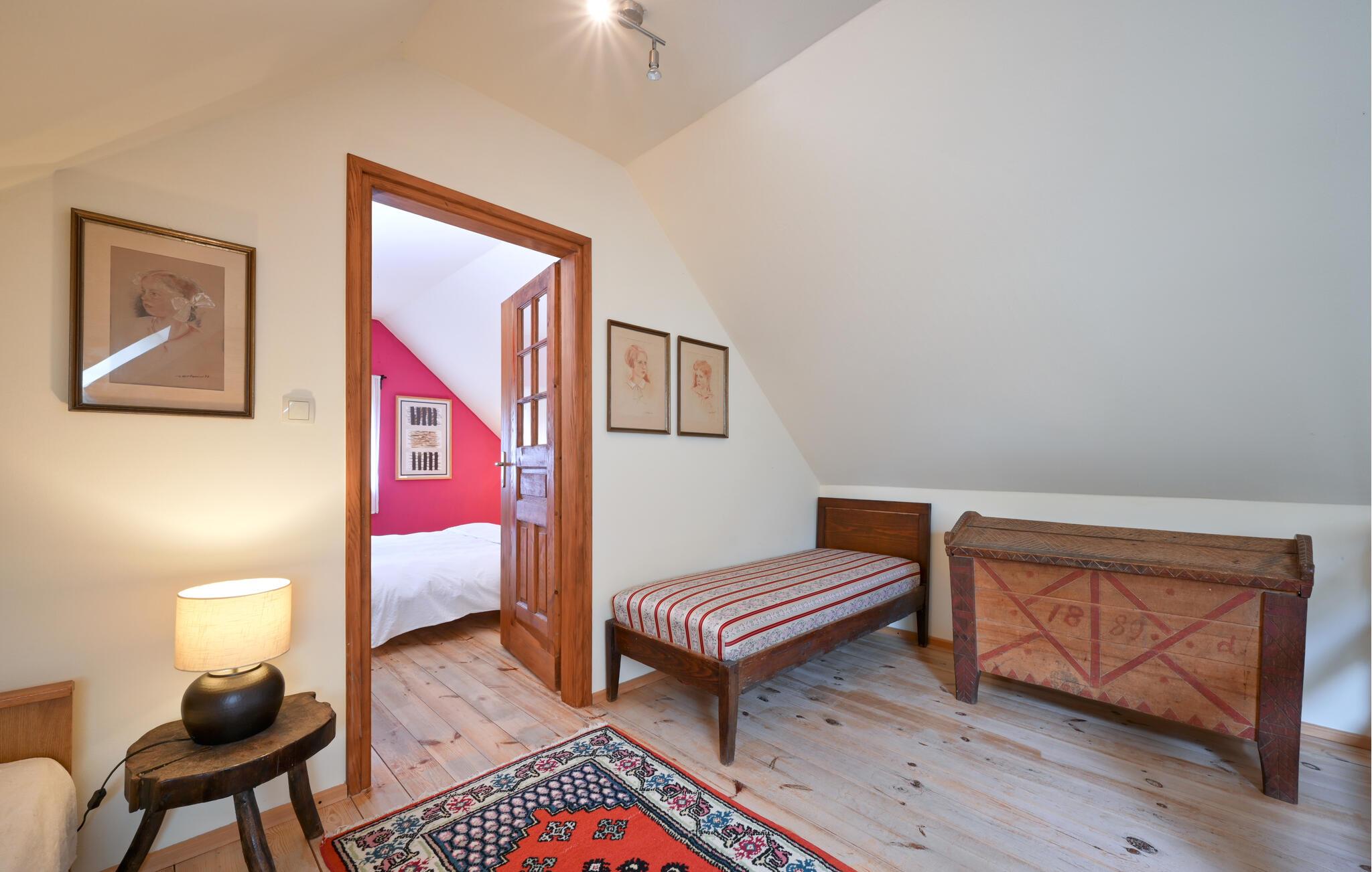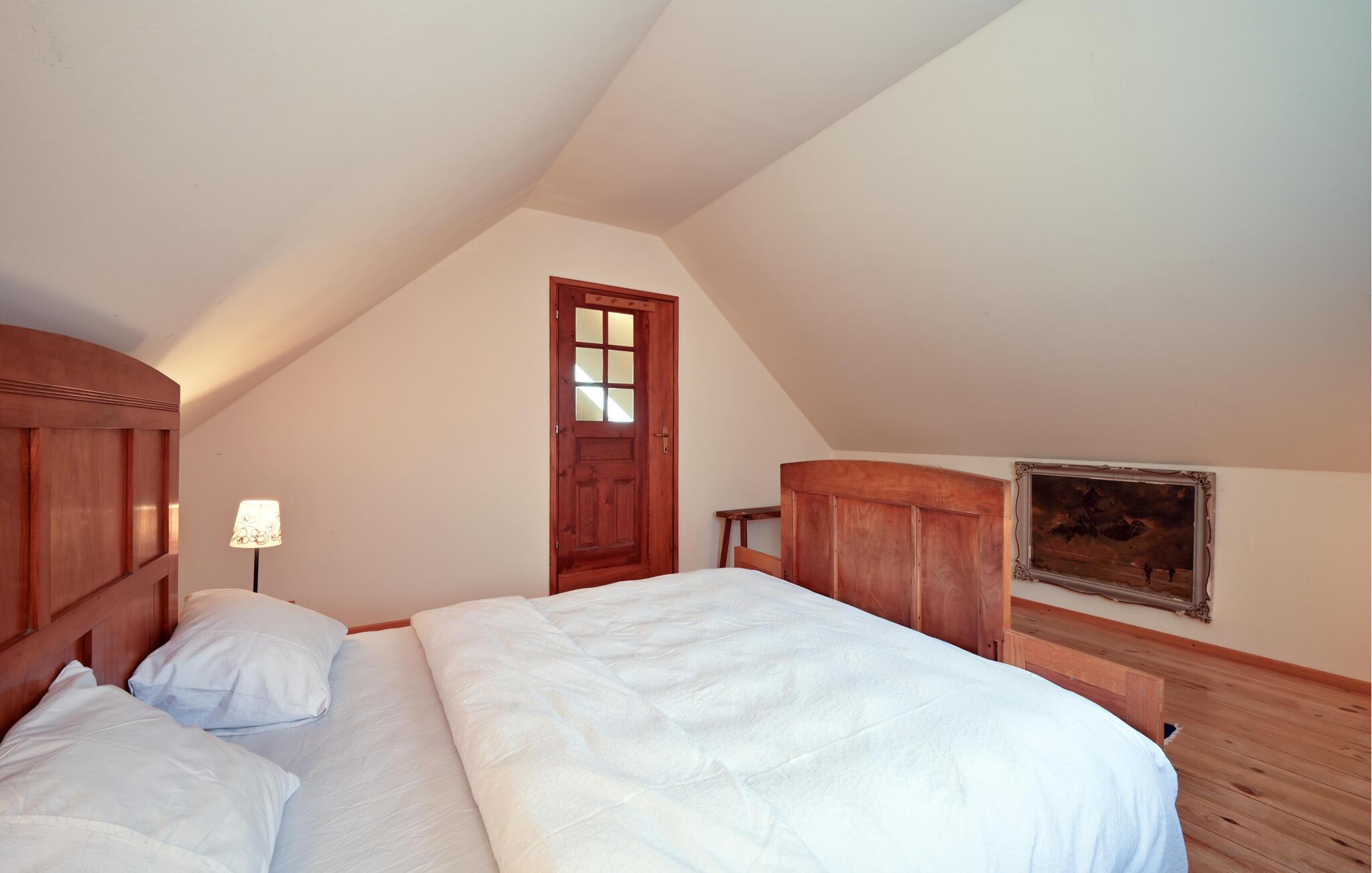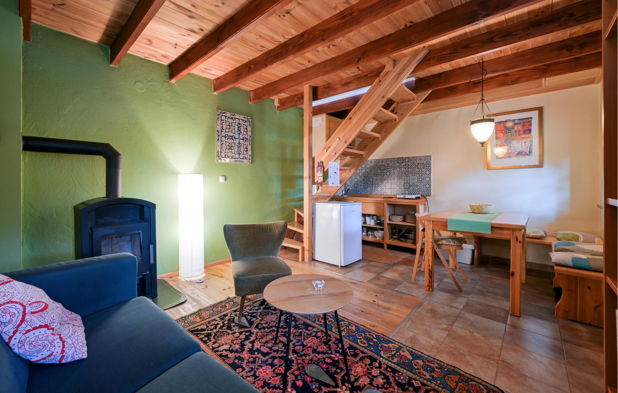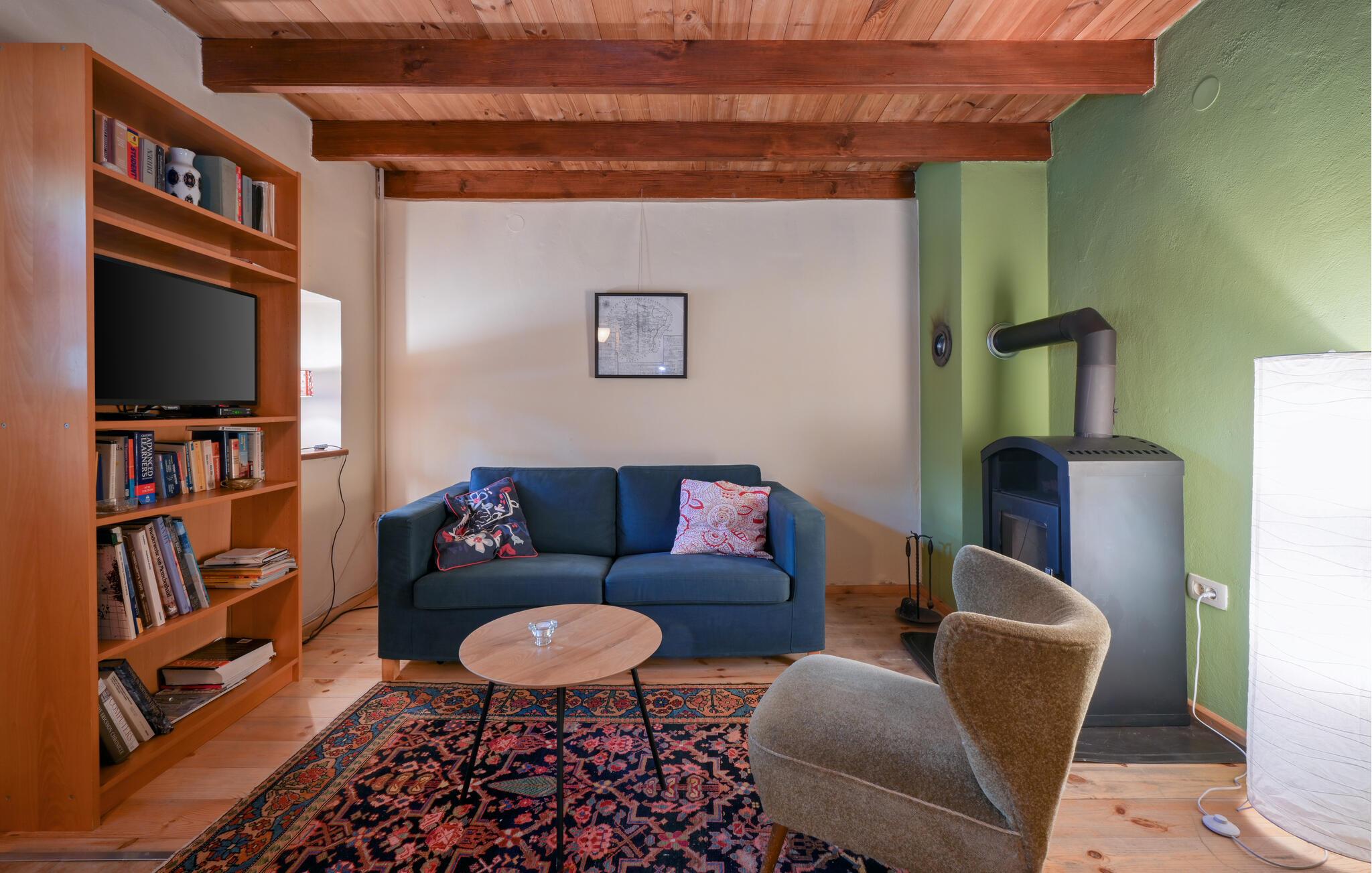 Velkommen til huset, som har en ideell beliggenhet for en avslappende ferie i nærheten av skogen og med vakker utsikt over landskapet. Med sine koselige møbler og varme farger er det det ideelle stedet å slappe av. Etter aktivitetene inviterer stuen til å sitte lenge sammen og legge planer for neste dag, og skape en ekstra koselig atmosfære med ild i vedovnen.