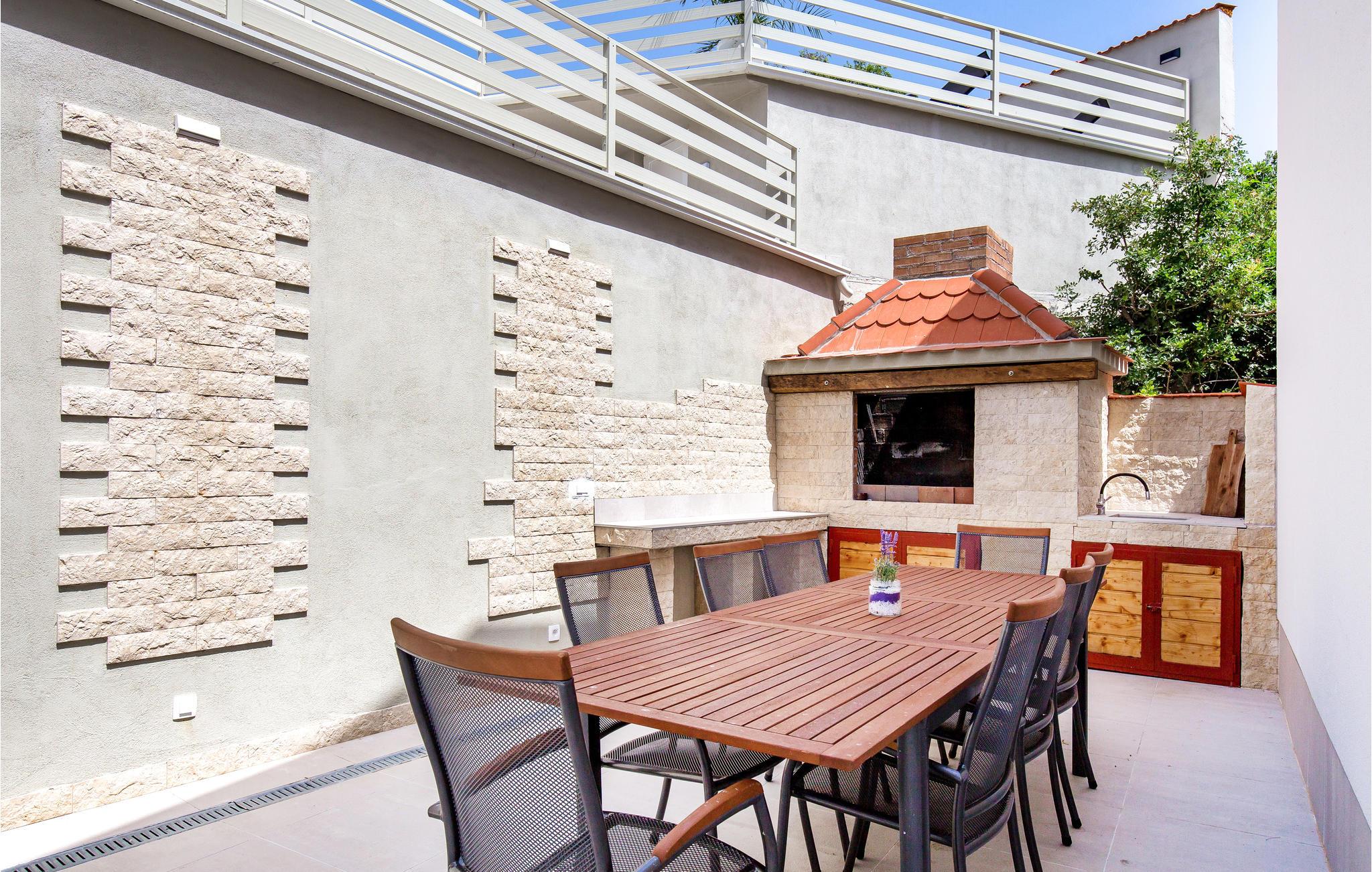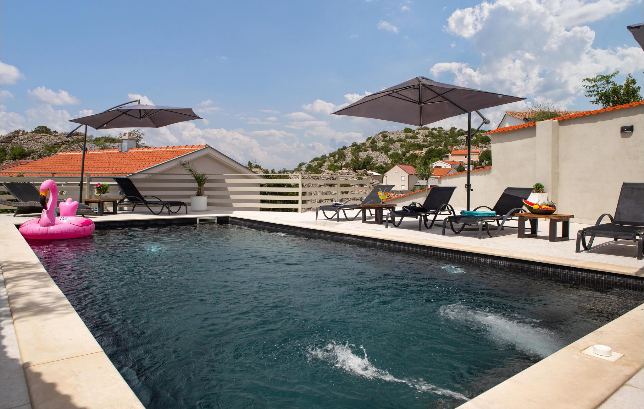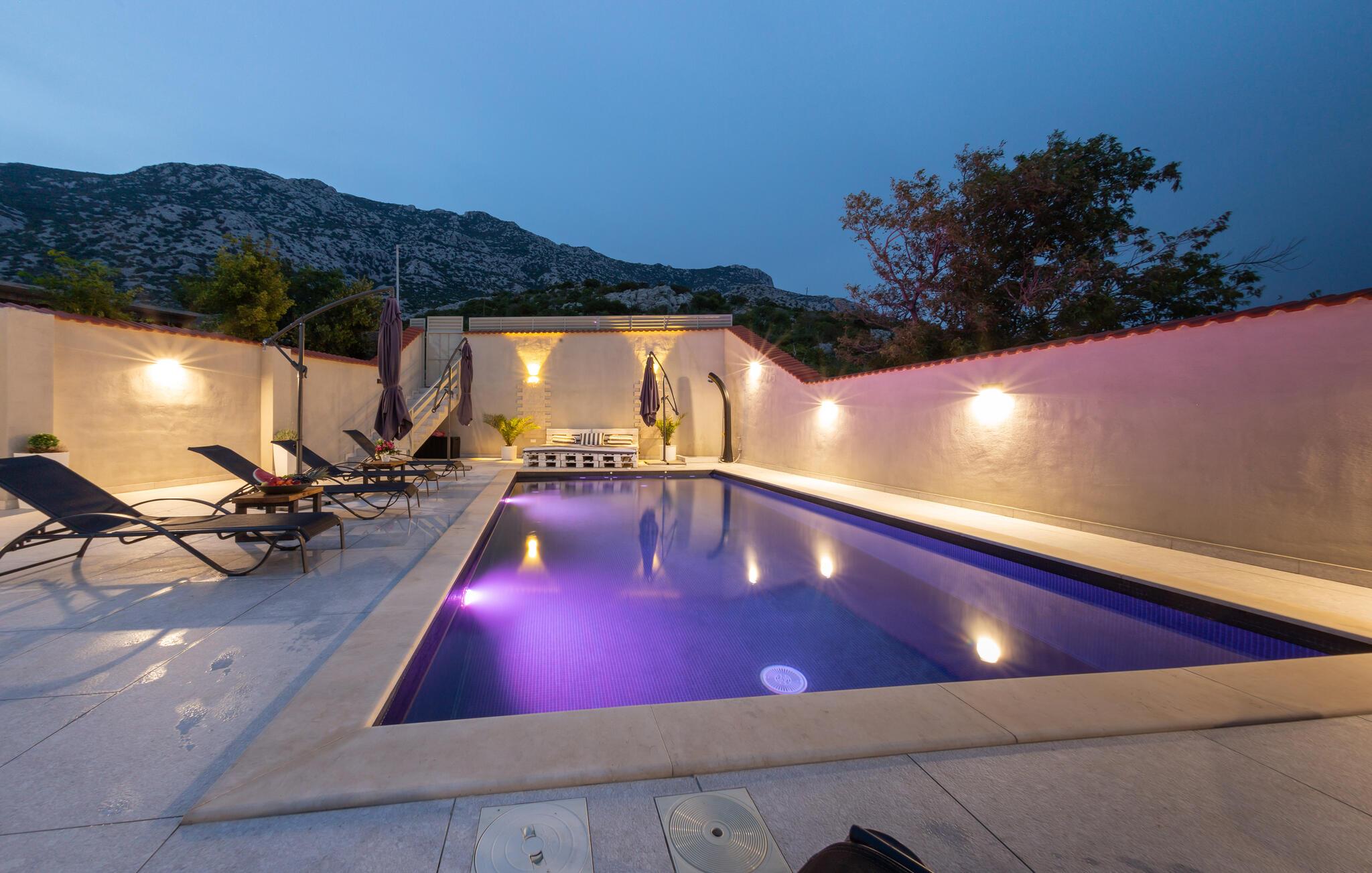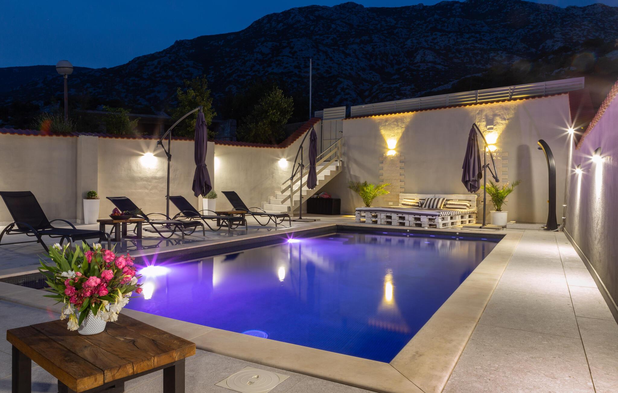 Utenfor finner du et svømmebasseng, ideelt for avkjøling i de varme sommermånedene, og et utendørs sommerkjøkken hvor du kan tilberede et utvalg av delikatesser.
