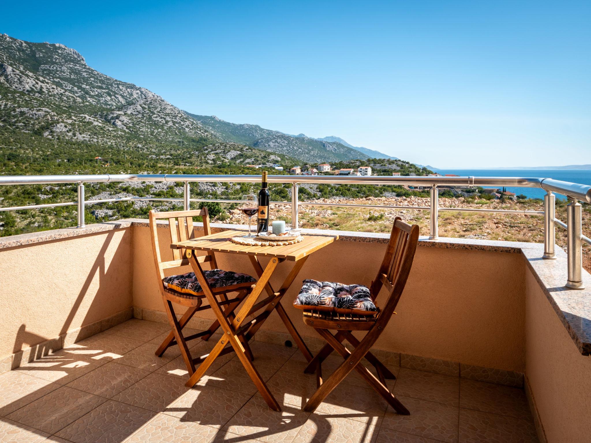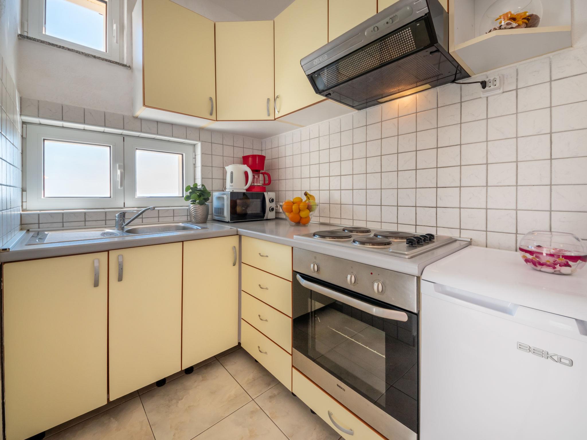 2-room apartment 40 m2 on 1st floor, south-east facing position. Living/dining room 20 m2 with 1 double sofabed (140 cm, length 200 cm), satellite TV (flat screen), air conditioning. Exit to the balcony. 1 room with 1 french bed (160 cm, length 200 cm). Exit to the balcony. Open kitchen (4 hot plates, oven). Shower/WC, hydro massage shower. No heating option. Balcony 6 m2, small balcony 2 m2. Balcony furniture. Distant view of the sea. Facilities: Internet (WiFi, free). Parking (1 car).