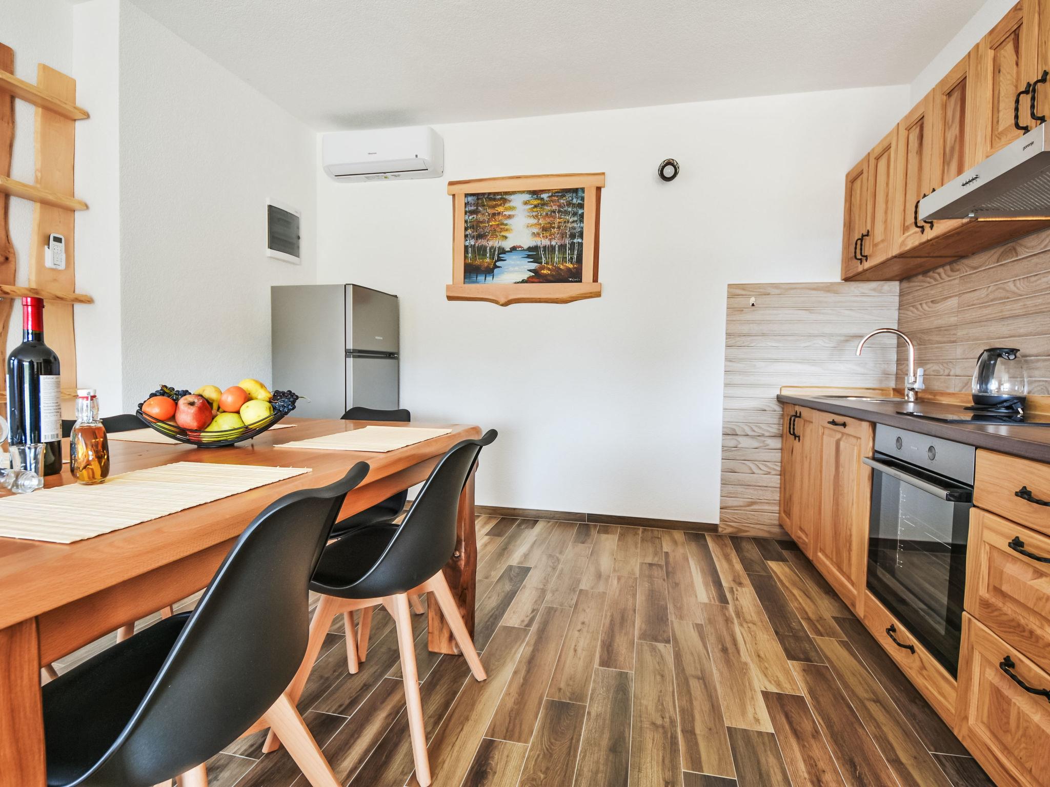 3-room semi-detached house 100 m2. 1 room with 1 french bed (180 cm, length 200 cm). 1 room with 2 beds (90 cm, length 200 cm). Open kitchen (oven, 4 ceramic glass hob hotplates, freezer, electric coffee machine) with air conditioning. Exit to the terrace. Bath/bidet/WC. Wood heating. Terrace 30 m2, roofed. Terrace furniture, deck chairs. Facilities: hair dryer. Internet (WiFi, free). One apartment on the ground floor (separate entrance): dining room, open kitchen, 3 bedrooms. The other apartment on the ground floor (separate entrance): living/dining area, open kitchen, 1 bedroom.