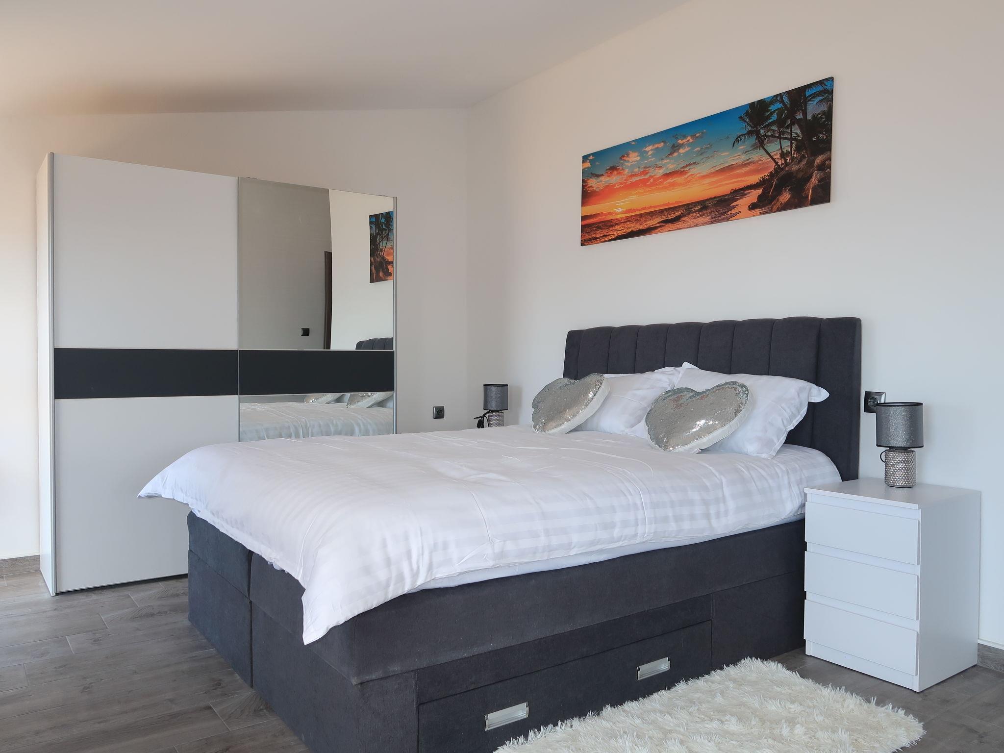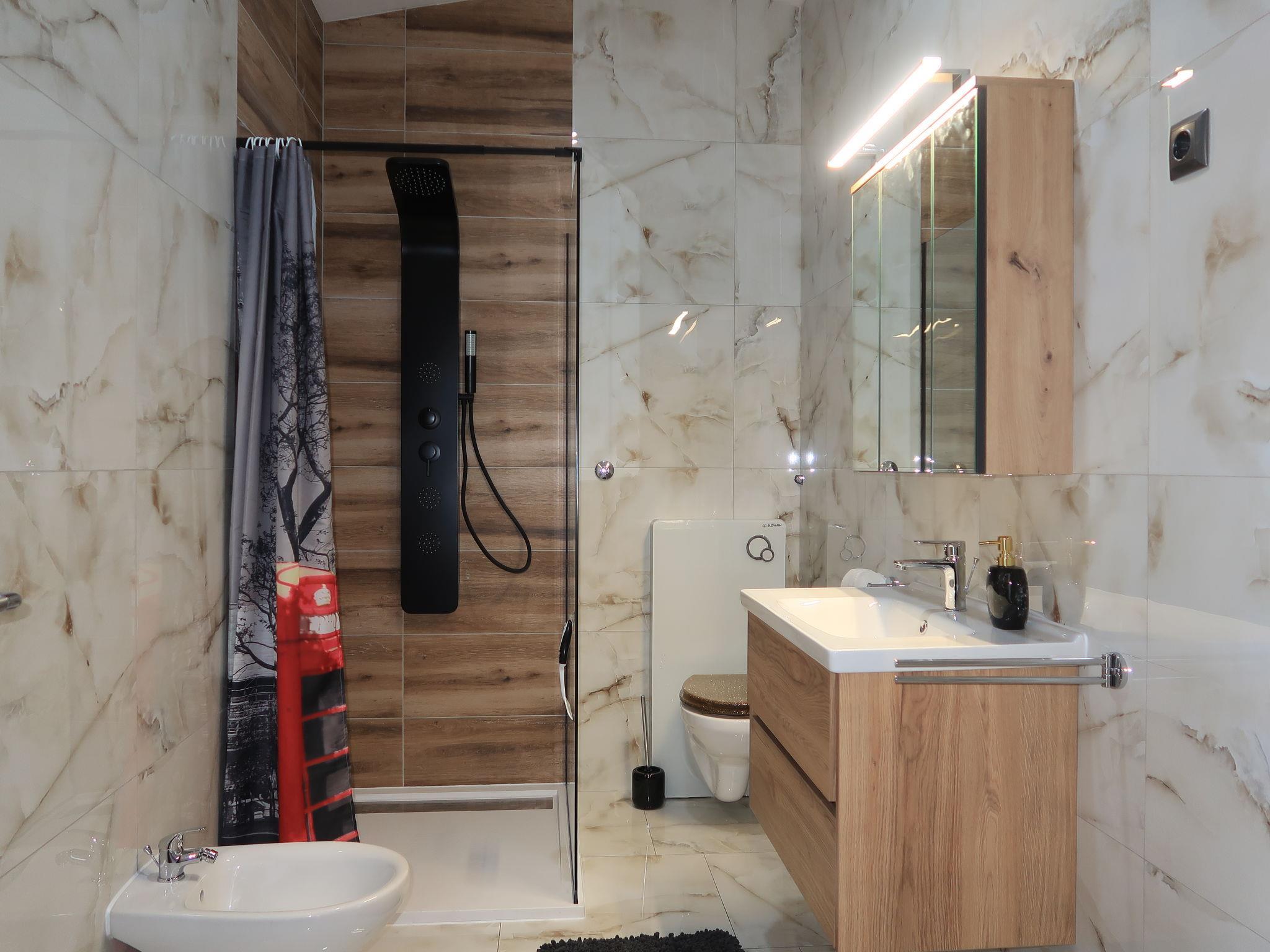 5-room house 150 m2 on 2 levels. Living/dining room 40 m2 with satellite TV and air conditioning. Exit to the terrace. 1 room with 1 french bed (160 cm, length 200 cm), satellite TV. Open kitchen (oven, 4 induction hot plates, toaster, kettle, microwave, freezer, electric coffee machine). Shower/bidet/WC. Upper floor: 1 room with 1 french bed (160 cm, length 200 cm), shower/WC, satellite TV and air conditioning. Exit to the balcony. 1 room with 2 beds (80 cm, length 200 cm), satellite TV and air conditioning. Exit to the balcony. 1 room with 1 french bed (160 cm, length 200 cm), shower/WC, satellite TV and air conditioning. Shower/bidet/WC. Forced-air heating. Balcony 6 m2, terrace 16 m2. Terrace furniture. Beautiful view of the sea. Facilities: safe, mosquito net. Internet (WiFi, free). Please note: non-smoking house. Available: playstation (included).