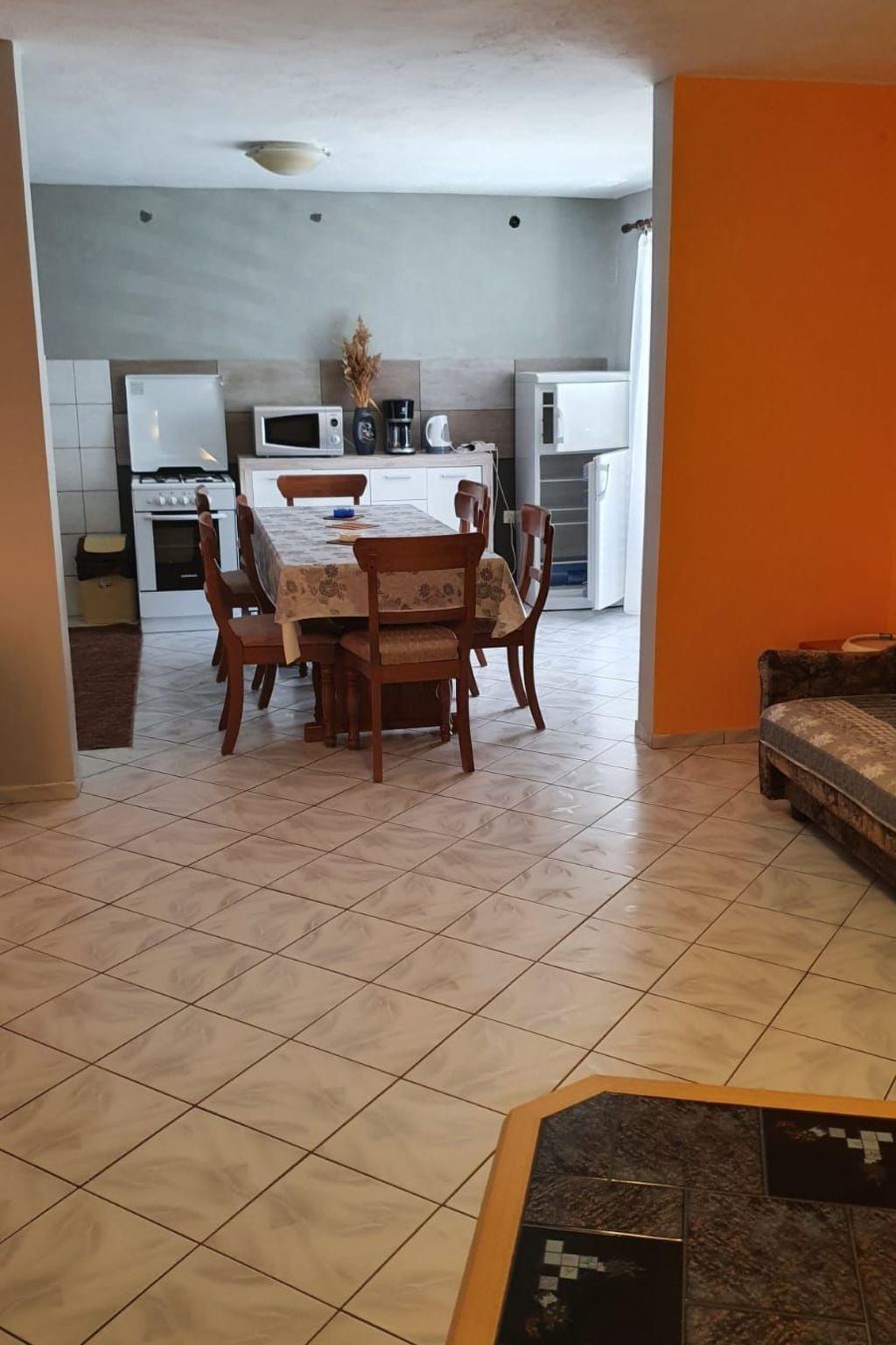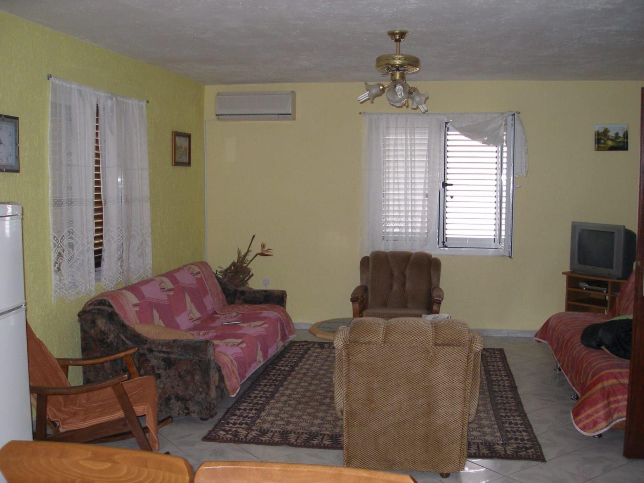 This 71m² flat consists of a large living room with kitchenette equipped with basic cooking utensils (crockery, fridge with freezer, cooker and basic cooking spices). The living room welcomes you with an antique wardrobe with its "history" and a few tiny pieces of antiquity "that means life". In the living area you will also find two sofa beds (each about 165 cm x 205 cm) for one person each. The separate bedroom is furnished with a double bed made of oak wood, from the time of the monarchy (180 cm x 200 cm, with 2 anatomical mattresses, bed linen), the second bedroom has a 2 bunk bed and another sofa bed The small bathroom is equipped with shower, toilet and towels and a separate toilet. Air conditioning, Internet Wi-Fi and satellite TV are also available.