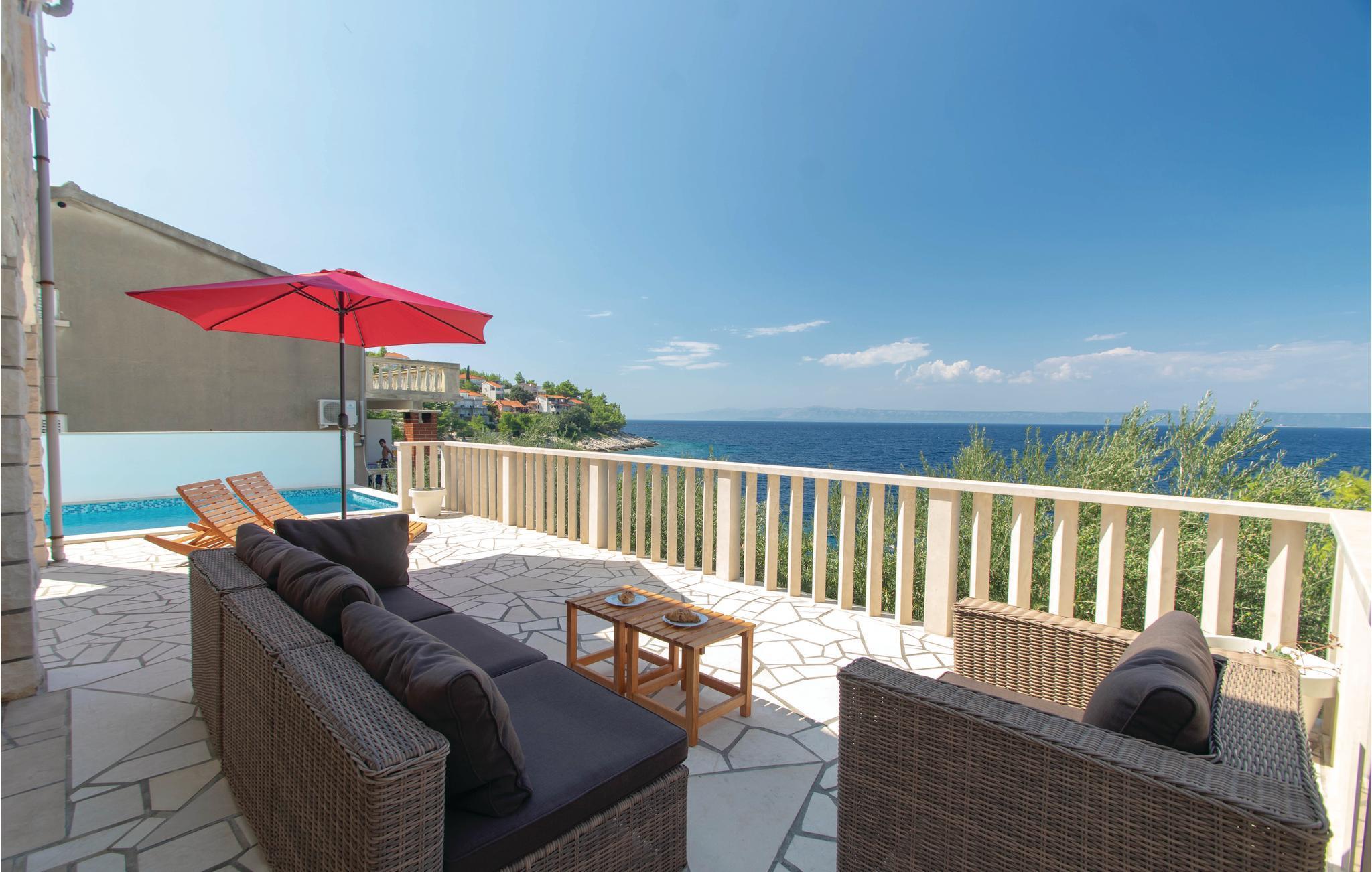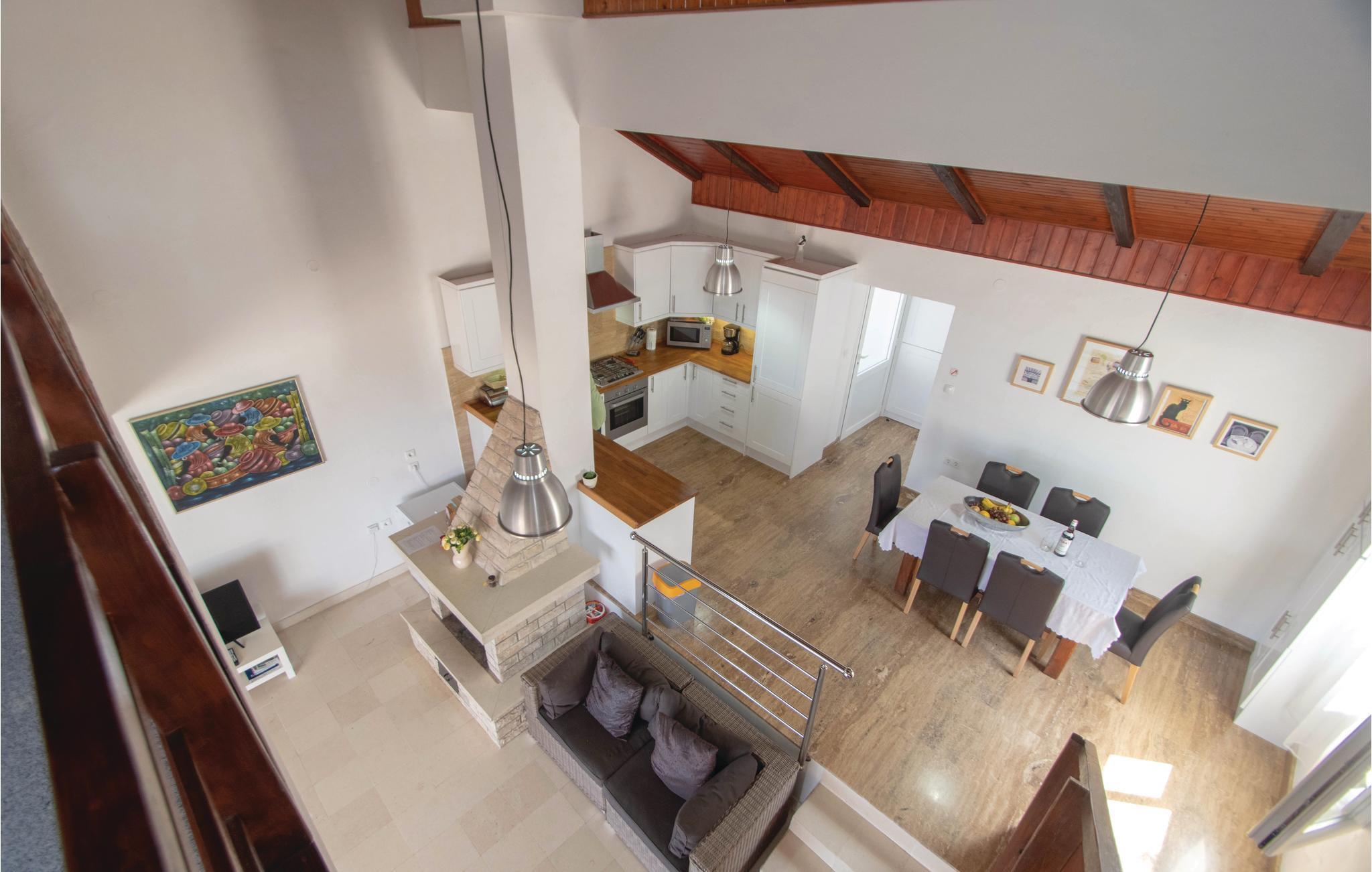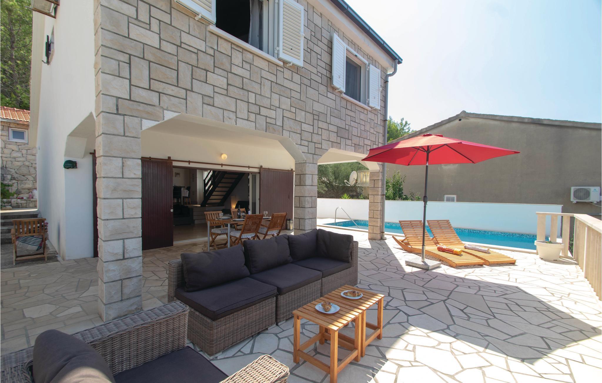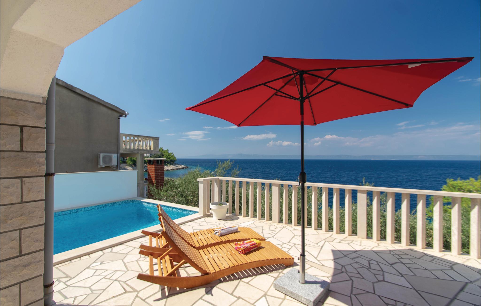 I idylliske omgivelser i Prigradica-bukten ligger dette feriehuset i 2 etasjer og forbundet med interne trapper og tilbyr sine gjester alt de trenger for en avslappende ferie. I første etasje er stuen og på loftet med den laveste takhøyden på 180 cm er soveområdet. I første etasje er det også en overbygd terrasse med panoramautsikt over øya Hvar og det blå havet, hvor du kan tilbringe uforglemmelige timer utendørs. Trapper fører fra huset til betongplatået, hvor du sikkert vil ha en fantastisk tid å slappe av. De siste ca. 50 m til huset er bratte.