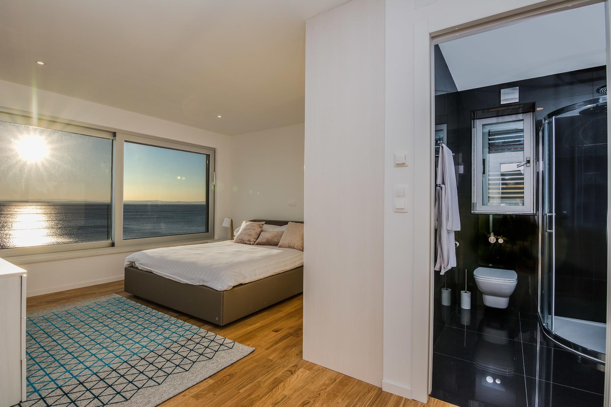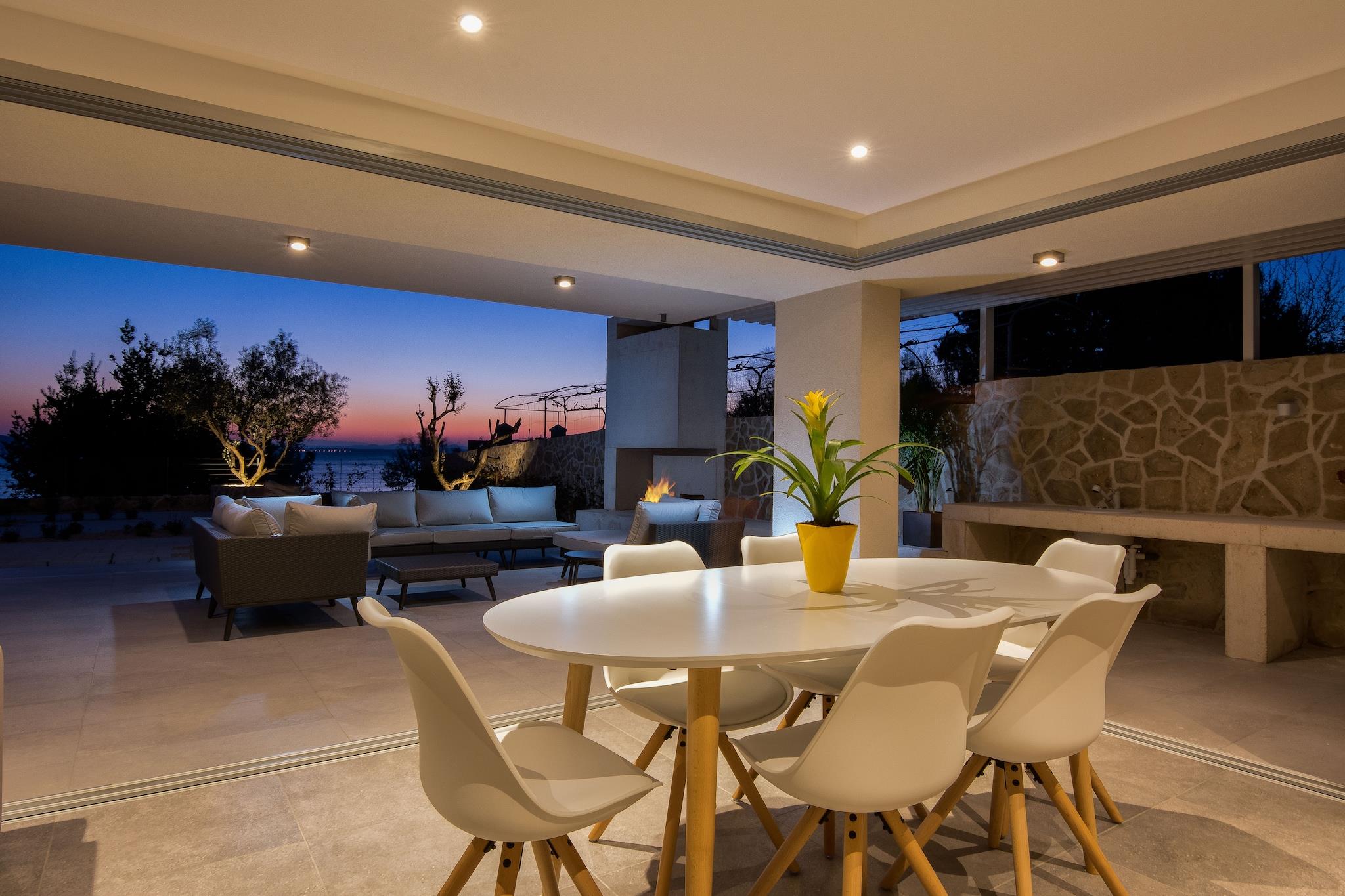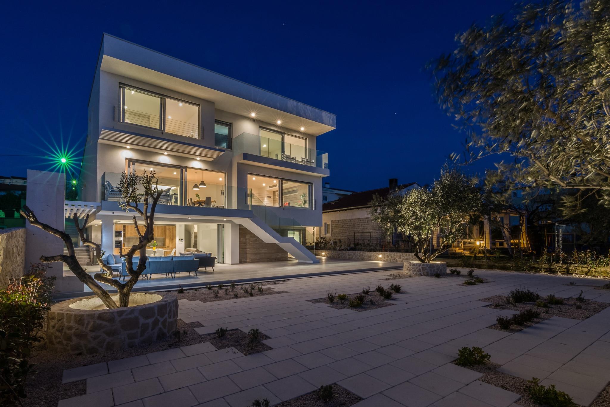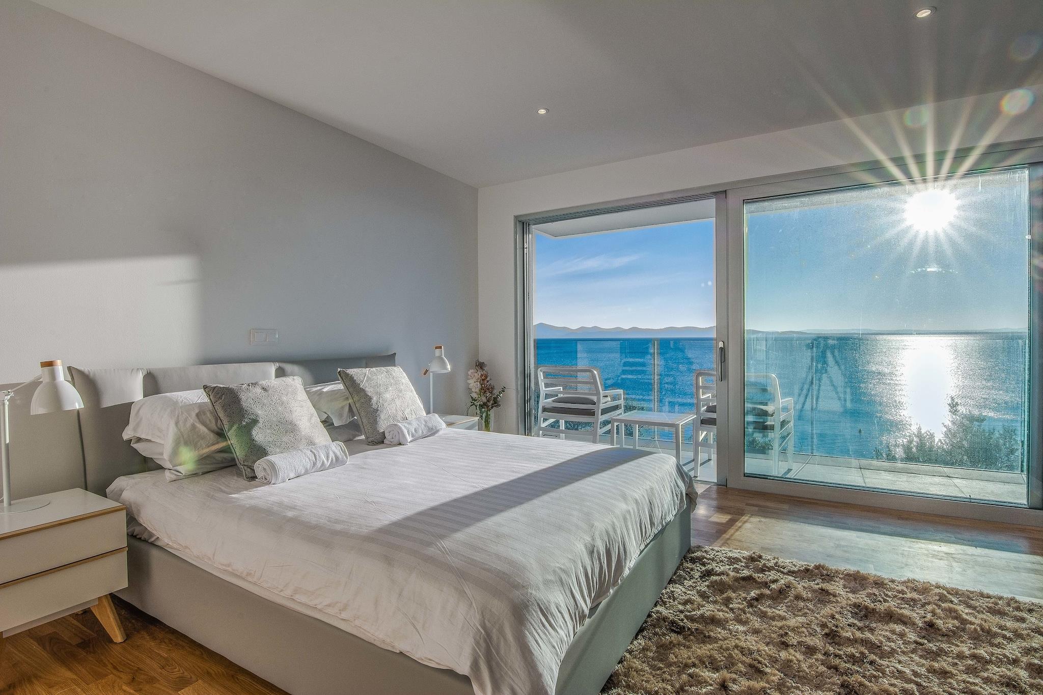 En moderne, romslig luksus tre nivå villa beliggende ved vannkanten med uforstyrret utsikt over Adriaterhavet. Gulv til tak vinduer oversvømmer villaen med naturlig lys og gir fantastisk utsikt over havet og øyene i det fjerne. Flott for familier eller voksne vennegrupper på opptil 10 for å nyte et avslappende opphold i hjertet av Dalmatia. Helt luftkondisjonert gjennom alle levende og sovende områder. Jernbanen har skyvedører som åpner på to sider for å gjøre et innendørs utendørs oppholdsrom. nivå har et fullt utstyrt kjøkken, spisestue, vaskemaskin / tørketrommel, utepeis og gassgrill. Du har også direkte tilgang til sjøen. På dette nivået er det et soverom med to enkeltsenger, direkte tilgang til terrassen og et komplett bad Det andre nivået er det viktigste boarealet med et luksuriøst kjøkken, spisestue, TV / sittegruppe og en utendørs terrasse. Også på dette nivået er det et soverom med køyesenger og et fullt bad. På tredje nivå er det to romslige soverom vidd h dronning senger og eget bad med oppvarmede gulv. Begge rommene har fantastisk utsikt med ett soverom med egen privat terrasse. Kystvillaen ligger i den rolige landsbyen Kozino. Det er flere restauranter innen gangavstand fra villaen. Byen Zadar ligger 10 minutter unna med bil. Nærliggende landsbyen Petrcane tilbyr mange sommeraktiviteter i turistsesongen.