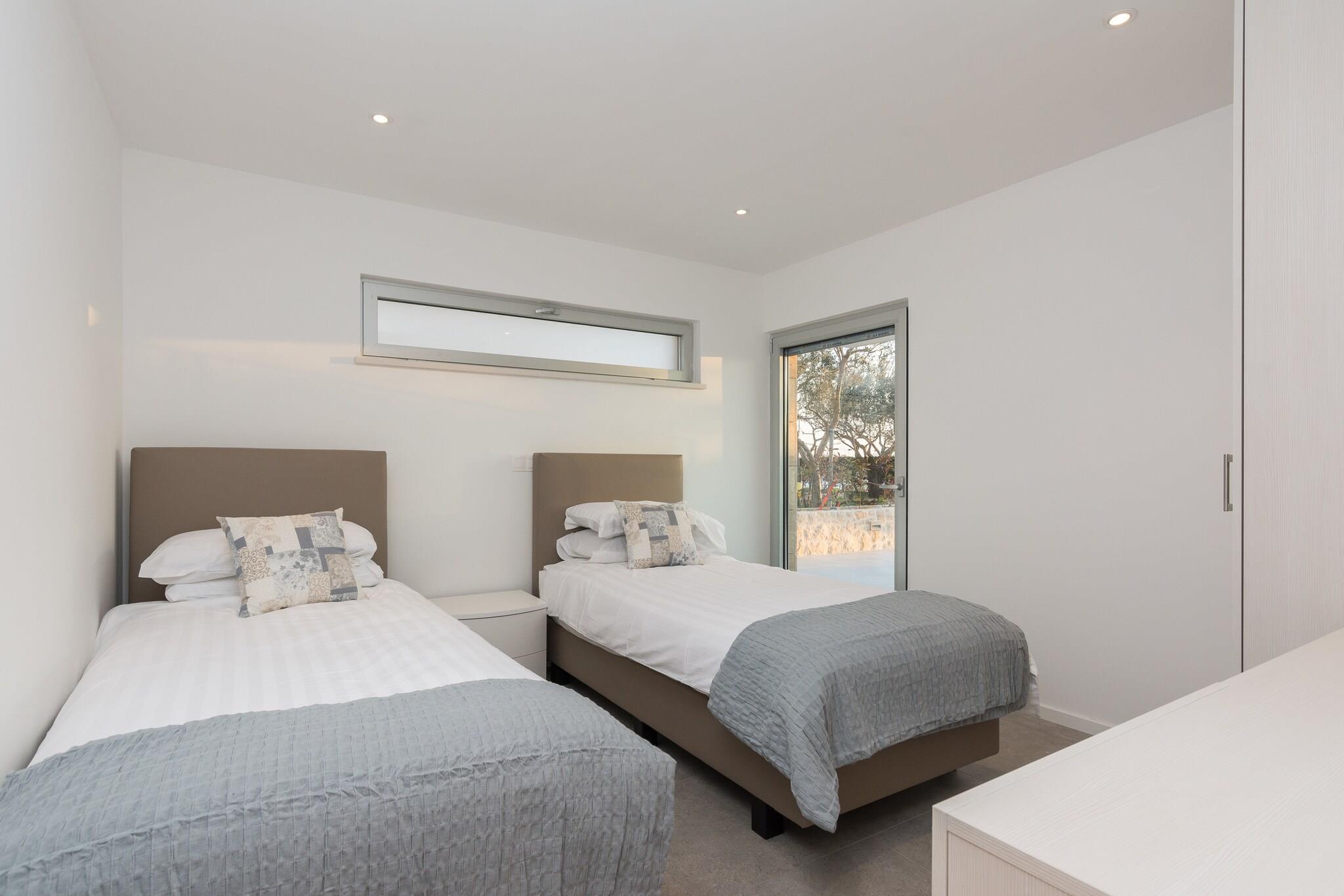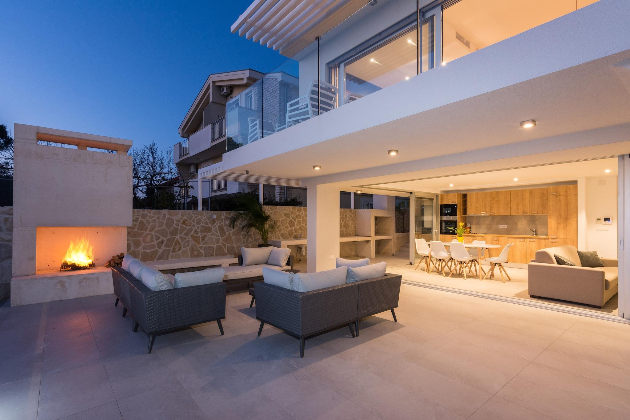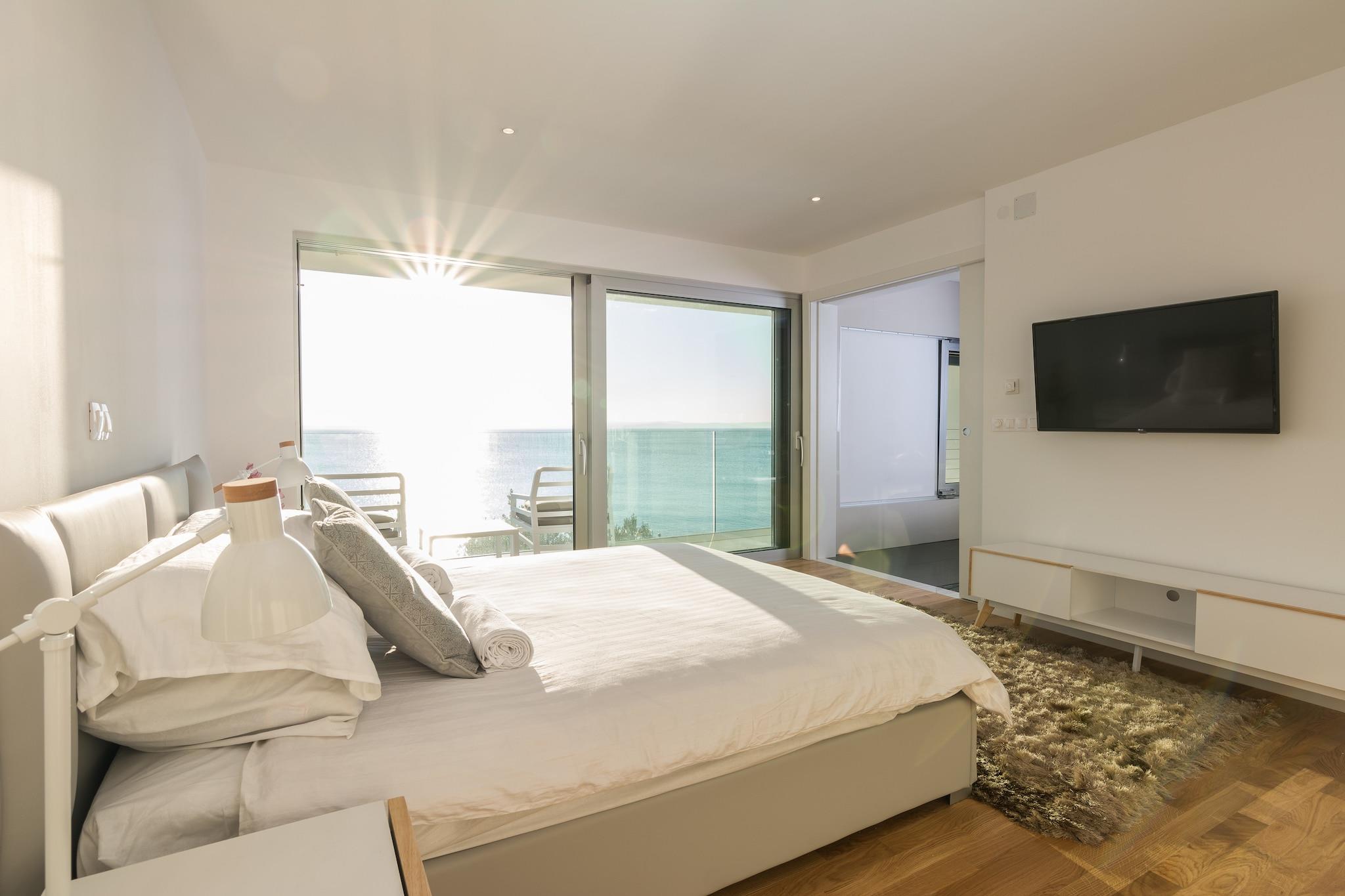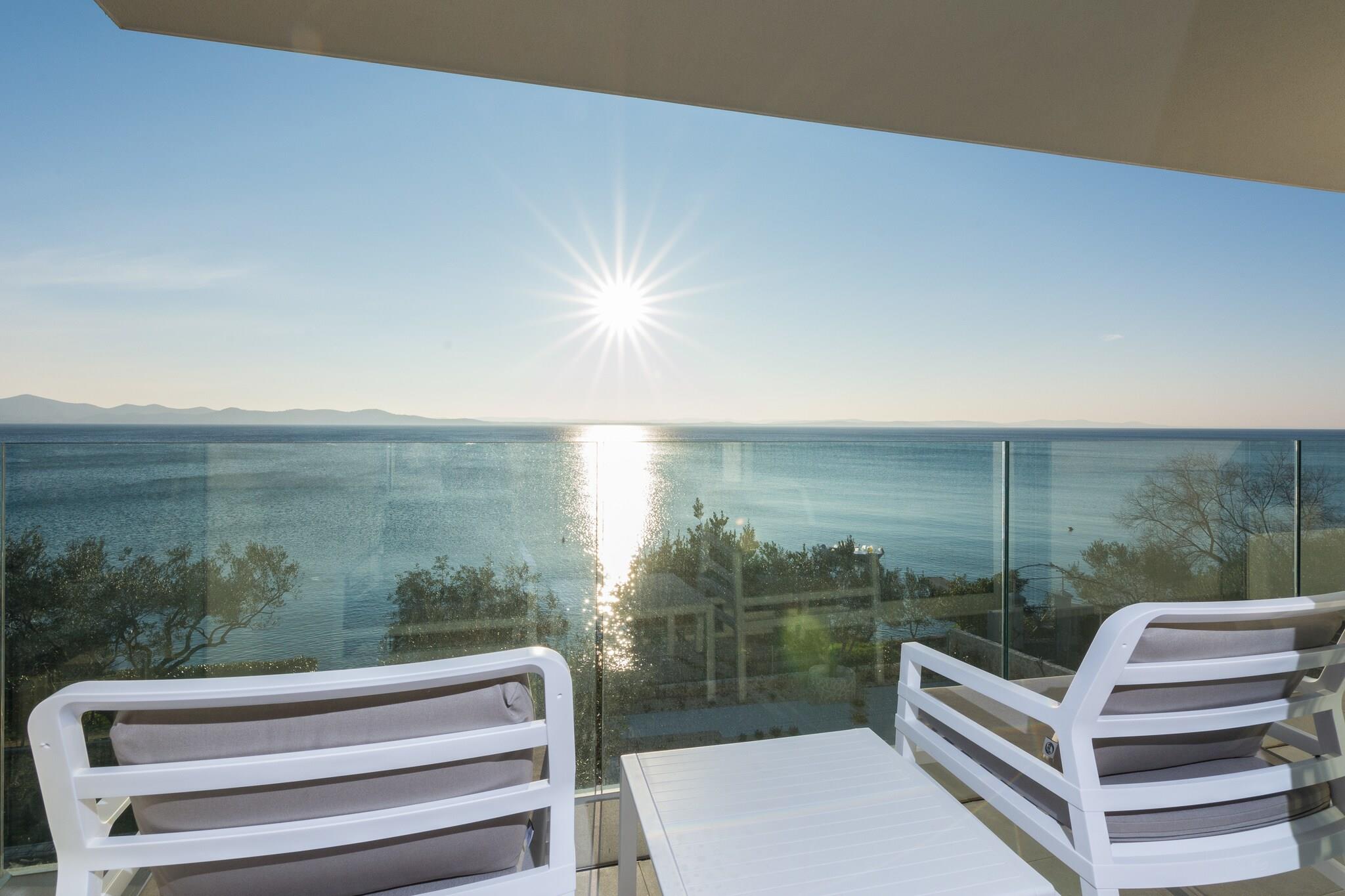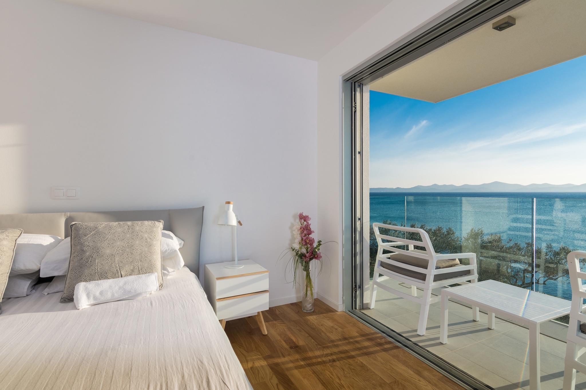 En moderne, romslig luksus tre nivå villa beliggende ved vannkanten med uforstyrret utsikt over Adriaterhavet. Gulv til tak vinduer oversvømmer villaen med naturlig lys og gir fantastisk utsikt over havet og øyene i det fjerne. Flott for familier eller voksne vennegrupper på opptil 10 for å nyte et avslappende opphold i hjertet av Dalmatia. Helt luftkondisjonert gjennom alle levende og sovende områder. Jernbanen har skyvedører som åpner på to sider for å gjøre et innendørs utendørs oppholdsrom. nivå har et fullt utstyrt kjøkken, spisestue, vaskemaskin / tørketrommel, utepeis og gassgrill. Du har også direkte tilgang til sjøen. På dette nivået er det et soverom med to enkeltsenger, direkte tilgang til terrassen og et komplett bad Det andre nivået er det viktigste boarealet med et luksuriøst kjøkken, spisestue, TV / sittegruppe og en utendørs terrasse. Også på dette nivået er det et soverom med køyesenger og et fullt bad. På tredje nivå er det to romslige soverom vidd h dronning senger og eget bad med oppvarmede gulv. Begge rommene har fantastisk utsikt med ett soverom med egen privat terrasse. Kystvillaen ligger i den rolige landsbyen Kozino. Det er flere restauranter innen gangavstand fra villaen. Byen Zadar ligger 10 minutter unna med bil. Nærliggende landsbyen Petrcane tilbyr mange sommeraktiviteter i turistsesongen.