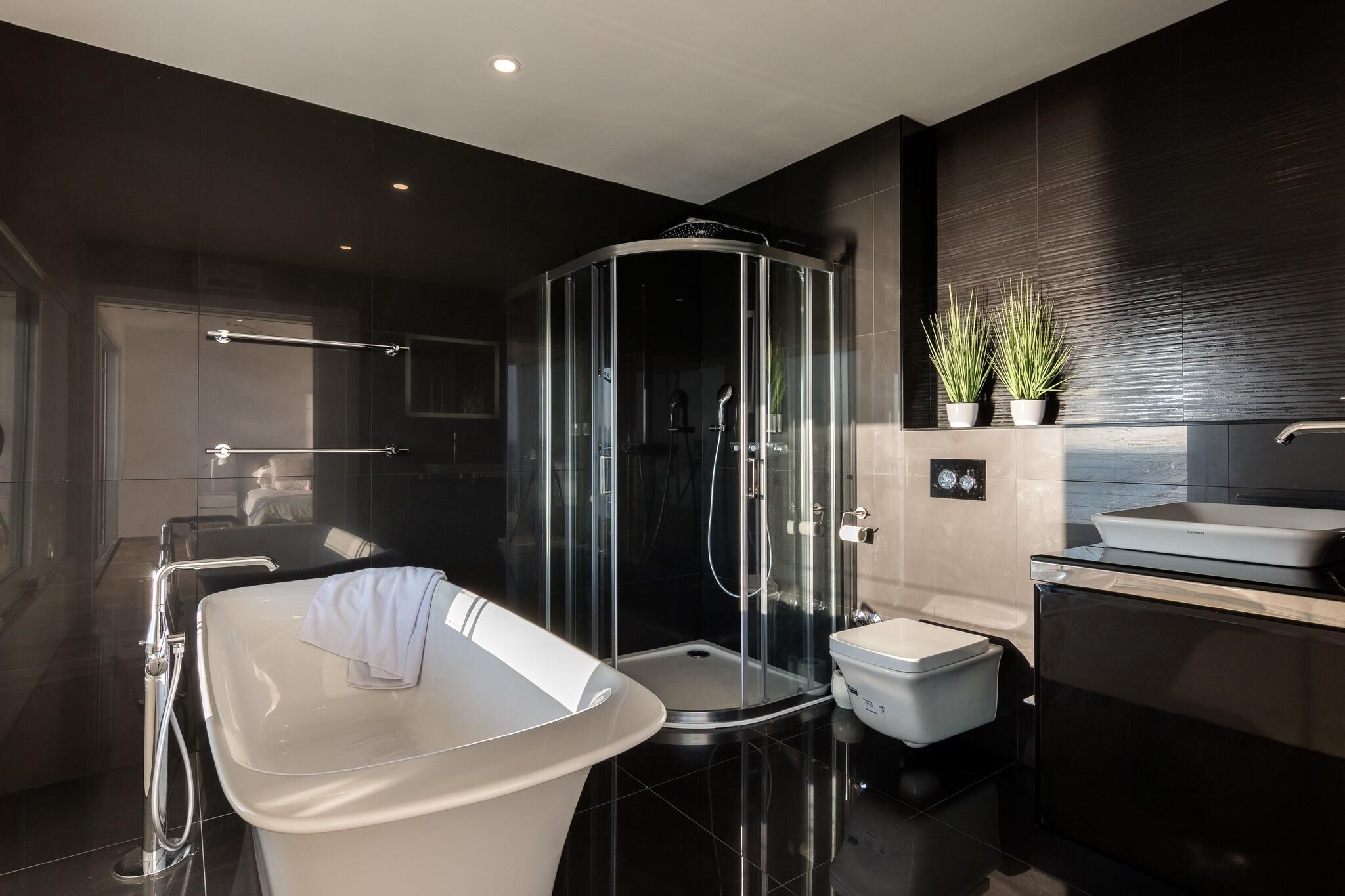 Første etasje: (åpent kjøkken(vannkoker, komfyr(komfyr med 4 kokeplater, elektrisk), stekovn, mikrobølgeovn, oppvaskmaskin, kjøleskap med fryser), Stue/spisestue(dobbel sovesofa, TV(flatskjerm), spisebord(6 personer), klimaanlegg), soveværelse(2x enkeltseng), bad(dusj, håndvask, toalett), tørketrommel, vaskemaskin, babyseng/sprinkelseng) i 2. etasje: (Kjøkken(vannkoker, brødrister, komfyr(komfyr med 5 kokeplater, gass), kaffetrakter, stekovn, mikrobølgeovn, oppvaskmaskin, kjøleskap med fryser), Stue/spisestue(TV(flatskjerm), spisebord(8 personer), peisen, sittehjørne, klimaanlegg), soveværelse(1 persons sovesofa, køyeseng), bad(dusj, håndvask, toalett), balkong eller terrasse) i 3. etasje: (Sovrum med badrum(dobbeltseng, TV(flatskjerm), badekar, dusj, håndvask, toalett, balkon, klimaanlegg), Sovrum med badrum(dobbeltseng, TV(flatskjerm), dusj, håndvask, toalett, klimaanlegg)) garasje, oppvarming(sentral, gulvvarme), terrasse(privat, 30 m2), hage(privat, inngjerdet, opplyst, 250 m2), hagemøbler, grill, parkering, terrassemøbler, utendørs peis