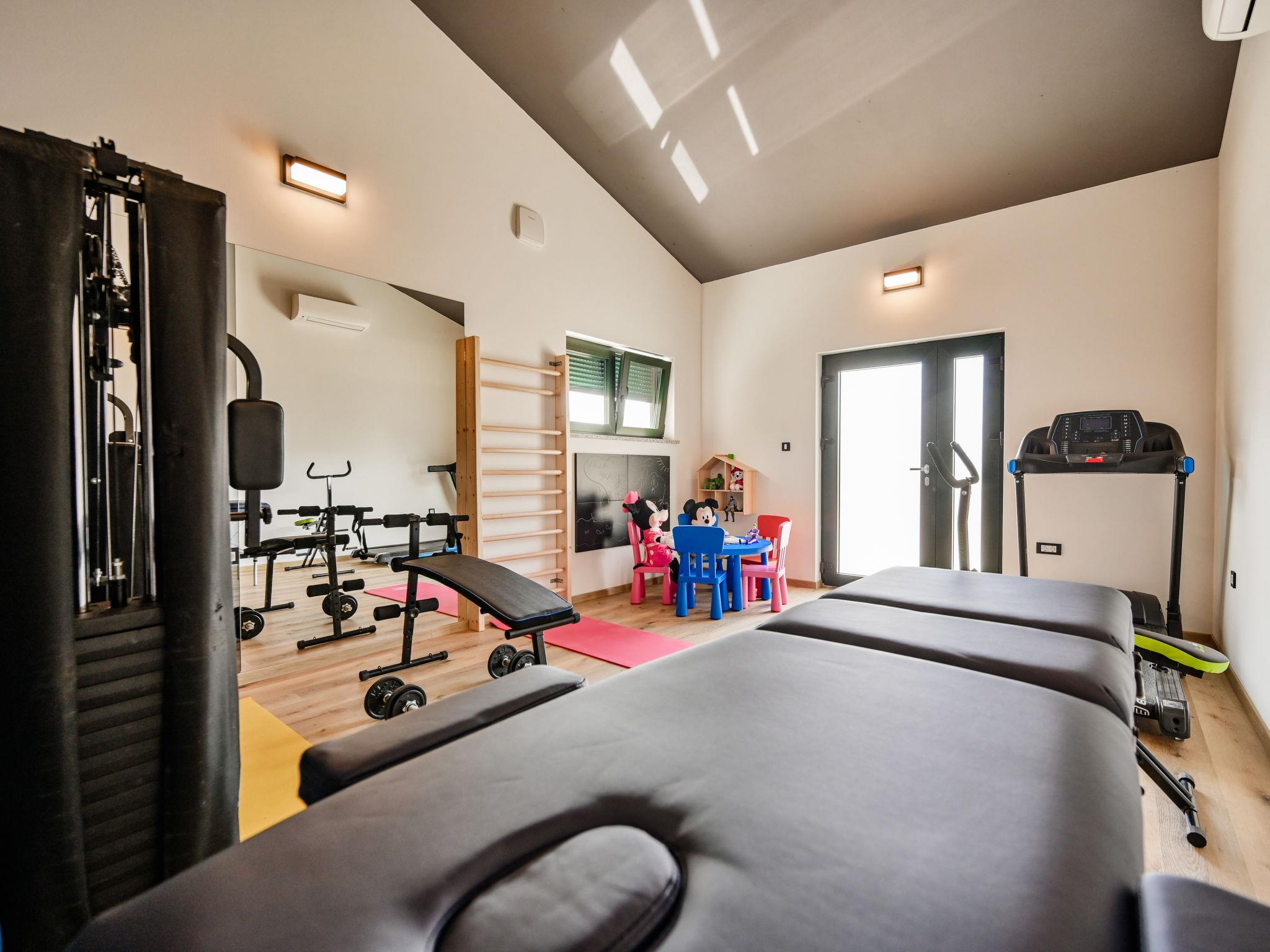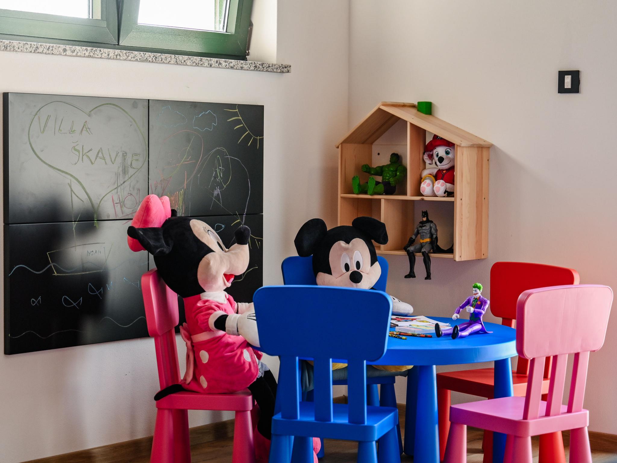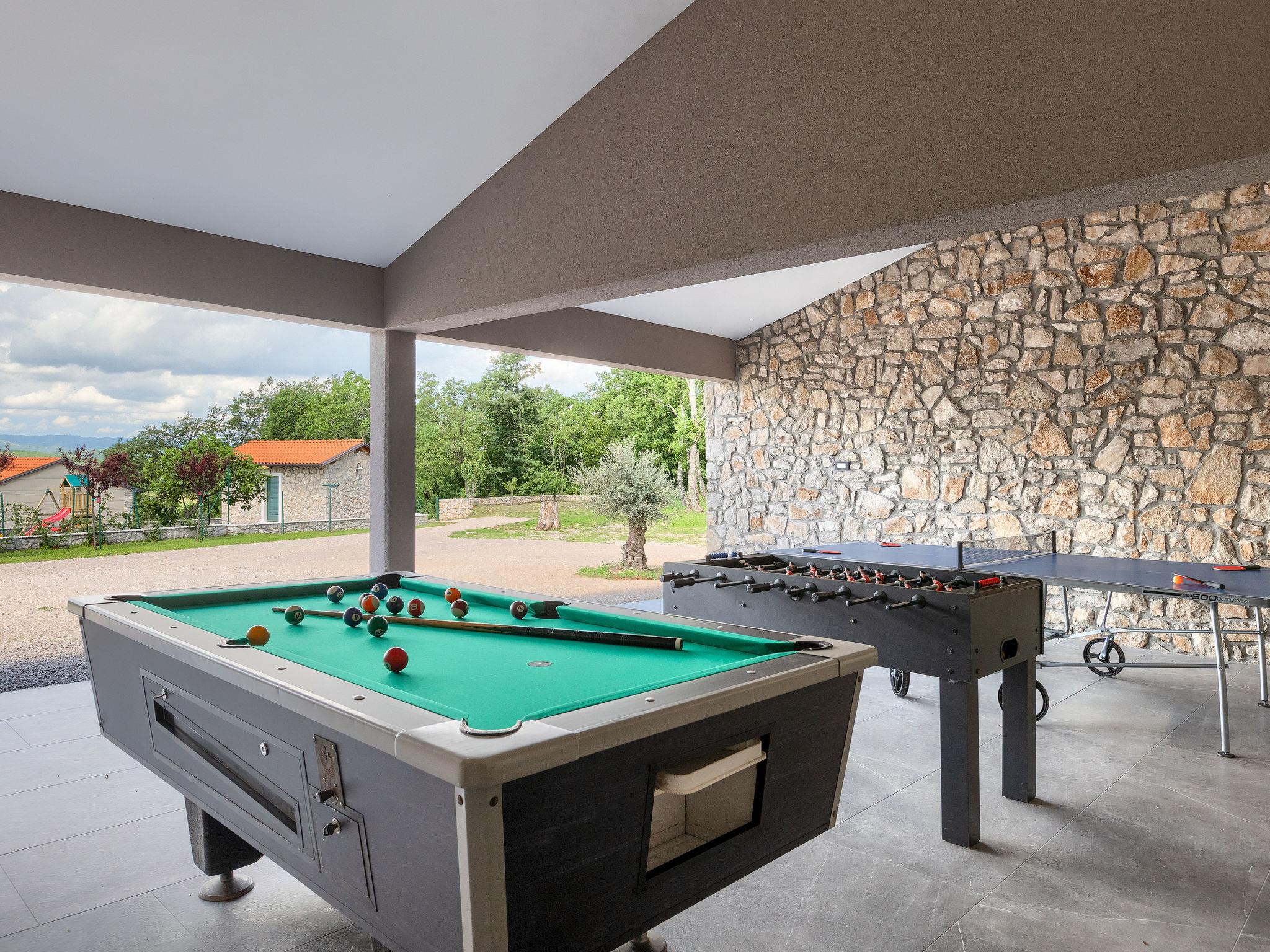 Beautiful single-family house "Villa Škavre", 2 storeys. 16 km from the centre of Labin, 21 km from the centre of Rabac, in a quiet, sunny position, 11 km from the sea, in the countryside. Private: property 3'500 m2, garden with lawn and trees, swimming pool angular (10 x 5 m, depth 140 cm, seasonal availability: 15.May. - 15.Oct.) with internal staircase. WC in the pool area, outdoor shower, terrace (65 m2), garden furniture, barbecue, children's playground (slide, swing). In the house: internet access, table tennis, billiard table, playroom, table football, trampoline, central heating system, washing machine. Parking (for 10 cars) at the house on the premises. Shop 8 km, supermarket 14 km, restaurant 8 km, bus stop 8.2 km, pebble beach 11 km, rocky beach 11 km, concrete beach 11 km. Sailing school 22 km, tennis 17 km, walking paths from the house 600 m, cycle lane 650 m. The owner does not accept any youth groups. Please note: airfield 46 km from the property. The unit consists of 2 houses rented as one unit. Private: outdoor kitchen (4 hot plates, oven, freezer, dishwasher). Organizing a party is not allowed.