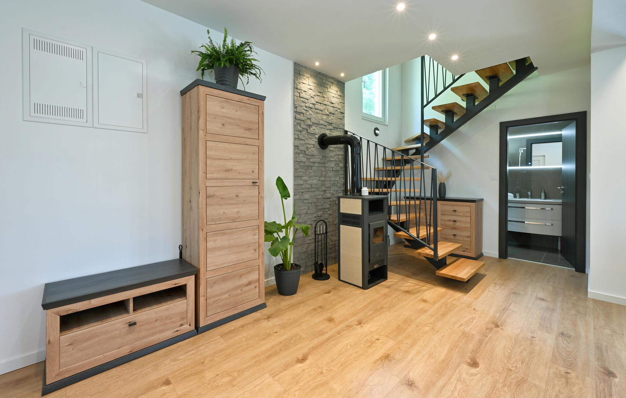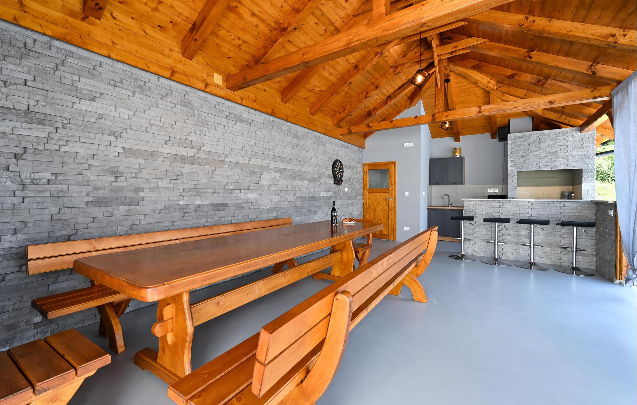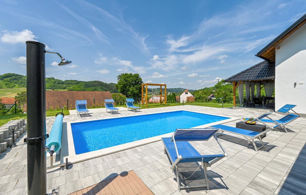 Nyt freden og roen på den overbygde balkongen, som gir deg en fantastisk utsikt over det omkringliggende landskapet. I første etasje er det også en nydelig veranda med bordfotball. Her kan du nyte underholdning og morgenkaffe. Utforsk hagen med det store bassenget, som innbyr til bading og lek, soling og gynging. Det store overbygde sommerkjøkkenet er også perfekt for kulinariske kvelder i hyggelig selskap.