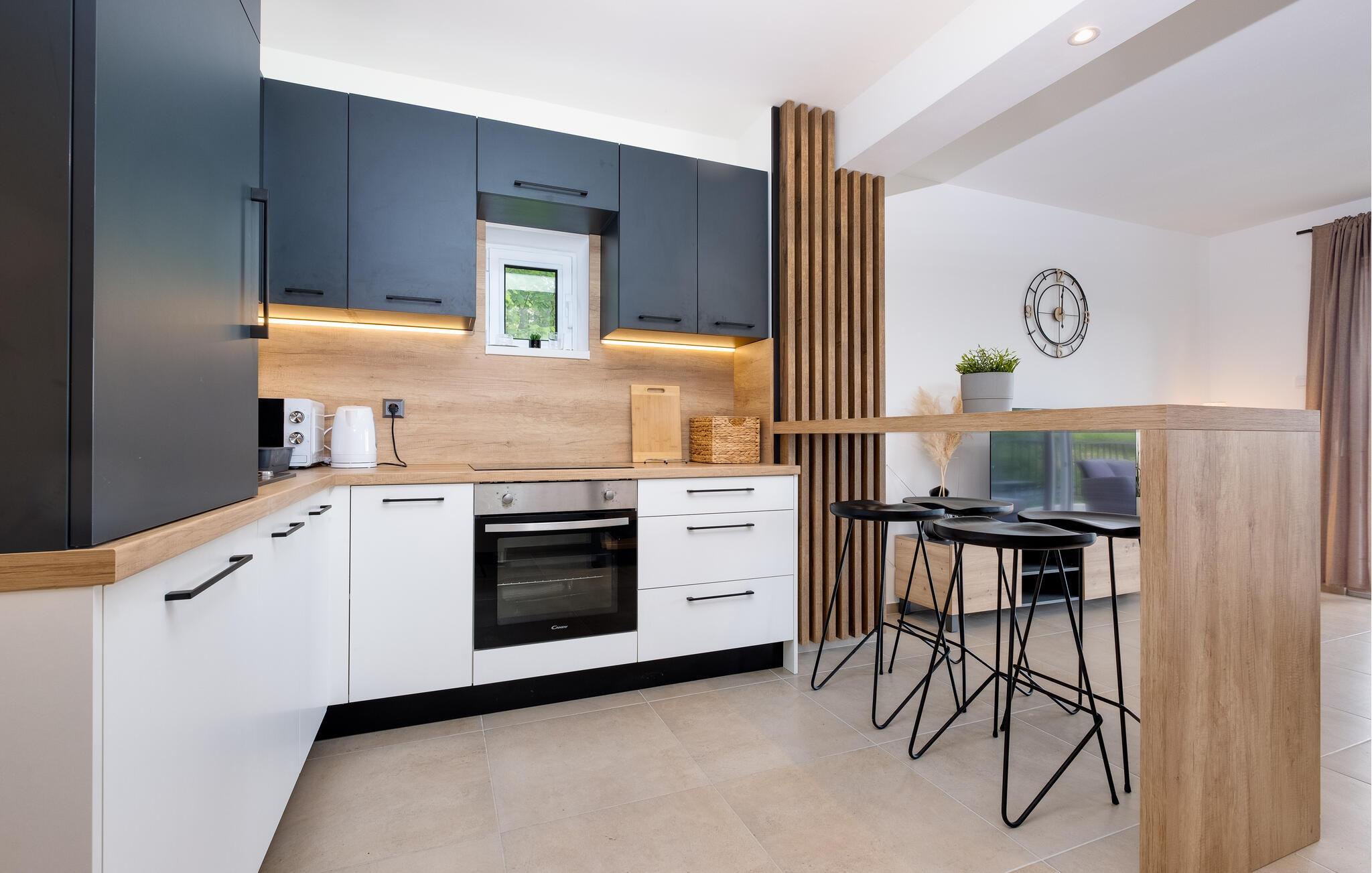 Dette moderne feriehuset imponerer med sin elegante design med varme treelementer og harmoniske fargeaksenter. Gled deg til å lage mat sammen på kjøkkenet av høy kvalitet og koselige måltider i den rustikke spiseplassen. Slapp av i den romslige sofagruppen, stream en spennende serie eller fordyp deg i en god bok.