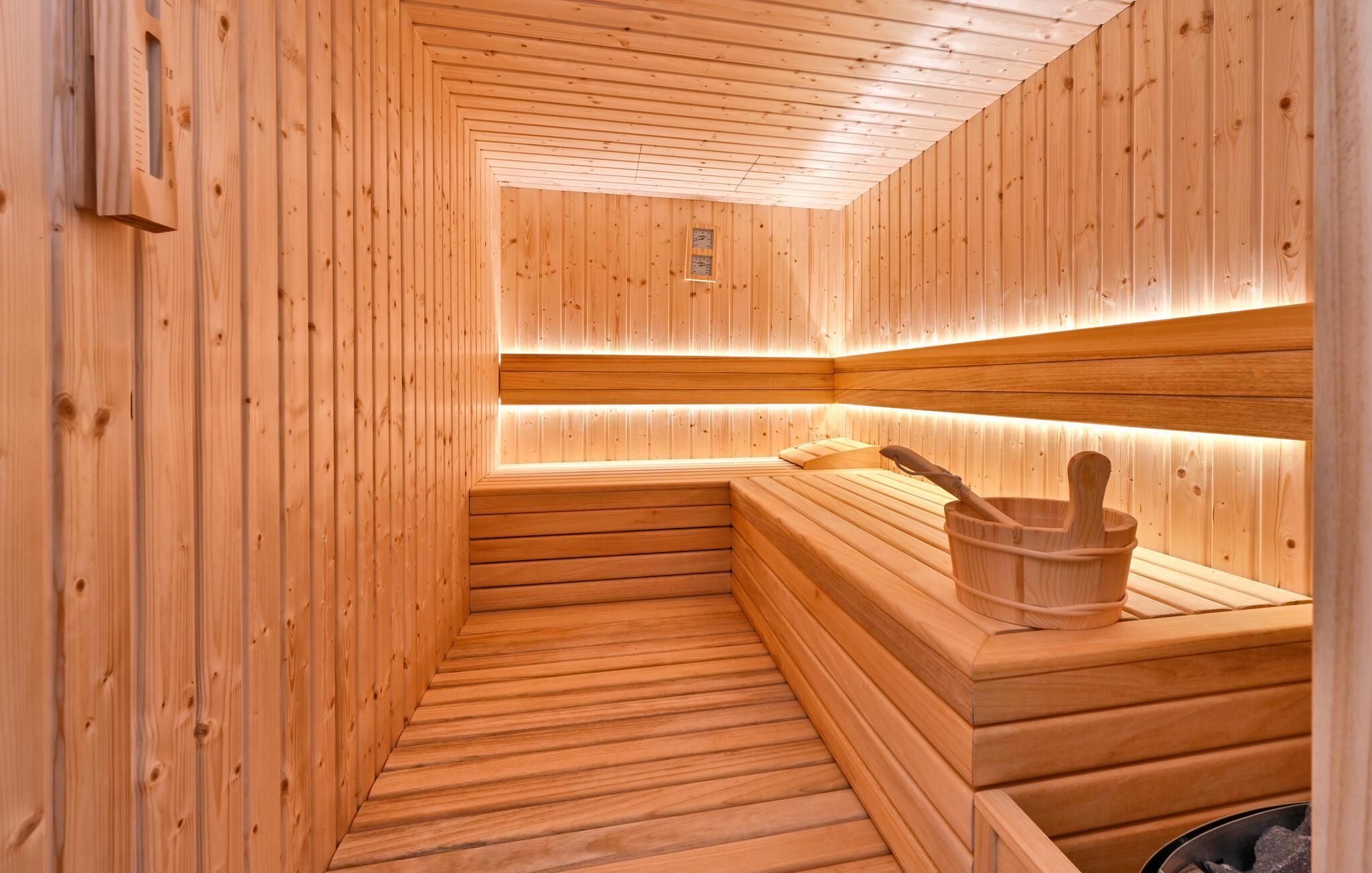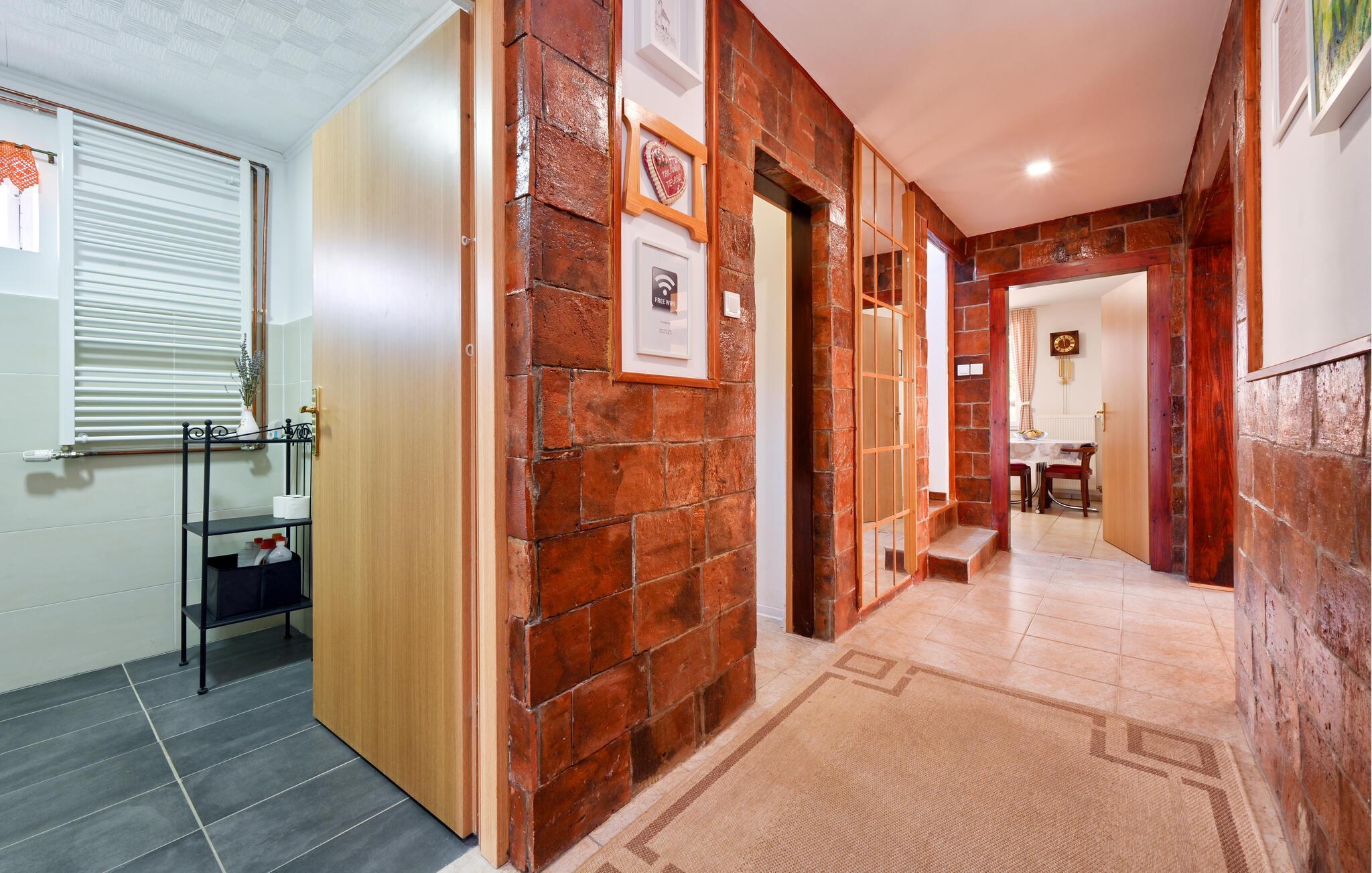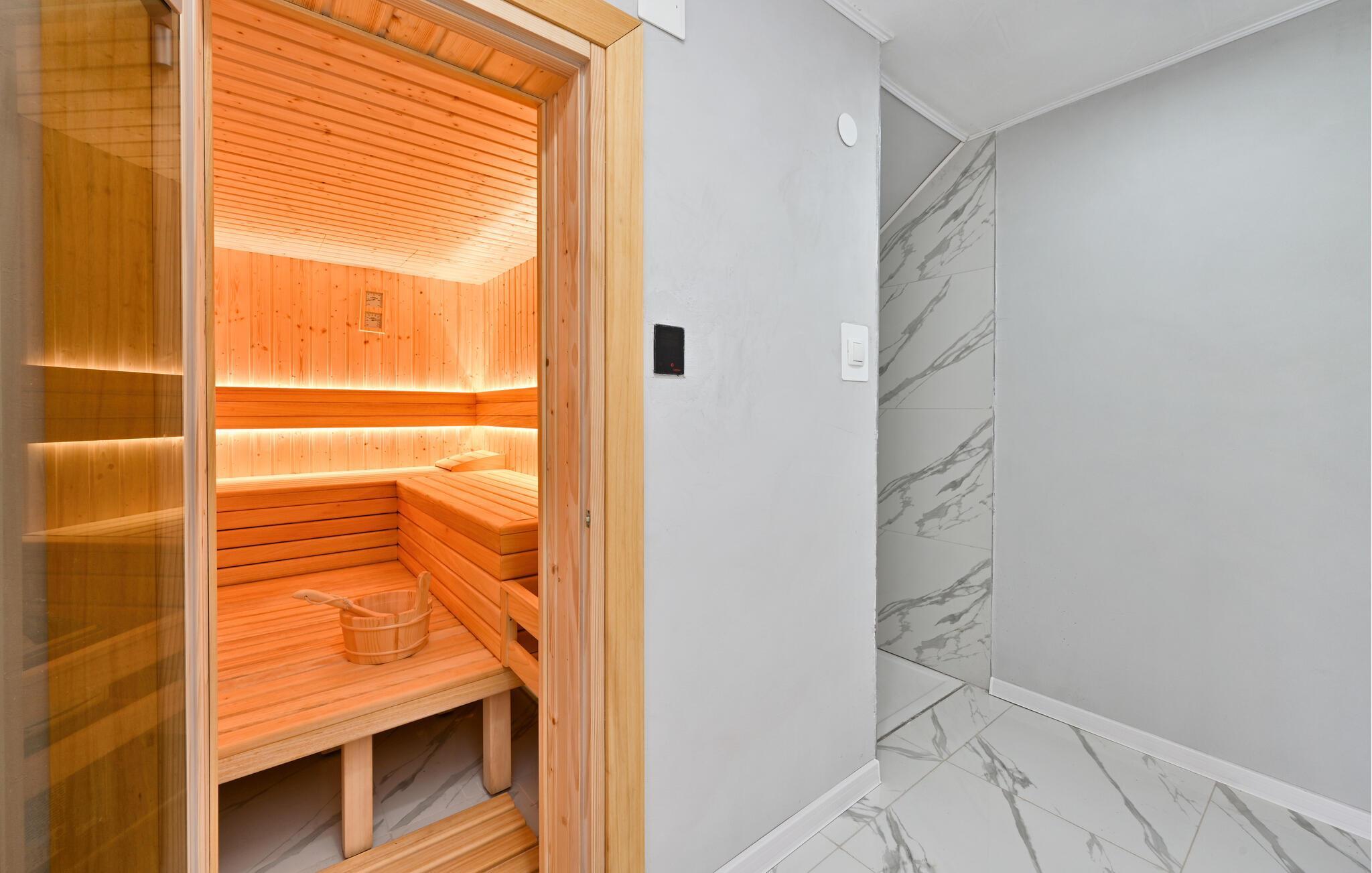Dette romslige feriehuset ligger på en rolig høyde, omgitt av skog og natur, og er det perfekte stedet for ferien din. Det vakkert innredede interiøret innbyr til avslapping, mens badstuen og boblebadet i et separat rom lover ren avslapning. Barna vil glede seg over lekeplassen med mange underholdningsmuligheter, mens du kan grille på den store terrassen eller nyte måltider i frisk luft. Nyt den fantastiske utsikten over det omkringliggende landskapet og slapp av.