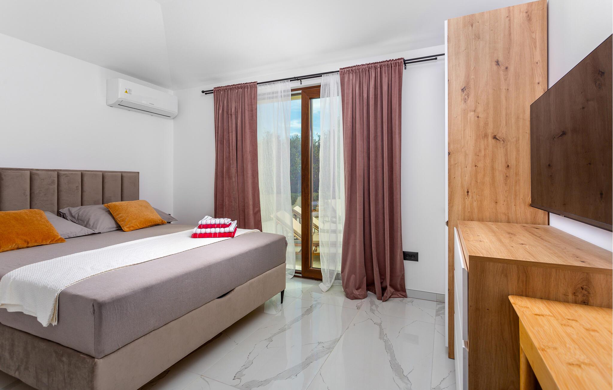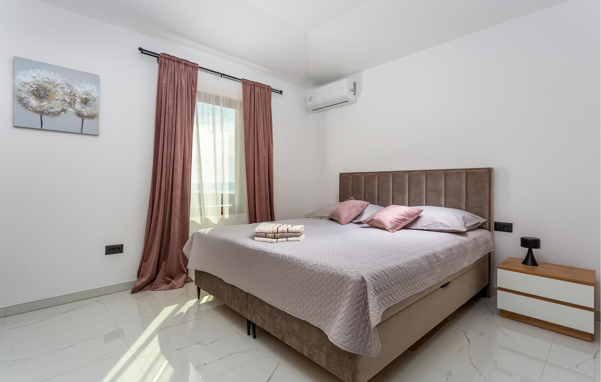 Nyt den moderne og koselige atmosfæren i dette store huset så snart du kommer inn. Smakfull innredning, møbler av høy kvalitet og lyse farger skaper en vellykket symbiose der du kan slappe av med dine nærmeste og nyte feriehverdagen. Oppdag de forskjellige rommene i to etasjer og trekk deg tilbake til soverommene, alle med eget bad. Den åpne stuen med tilstøtende spiseplass og det vakre kjøkkenet i første etasje gir deg en herlig ramme rundt frokostbordet om morgenen. Du kan også spise på den store, overbygde terrassen eller tilbringe ferien i bassenget og på solsengene med utsikt over havet.