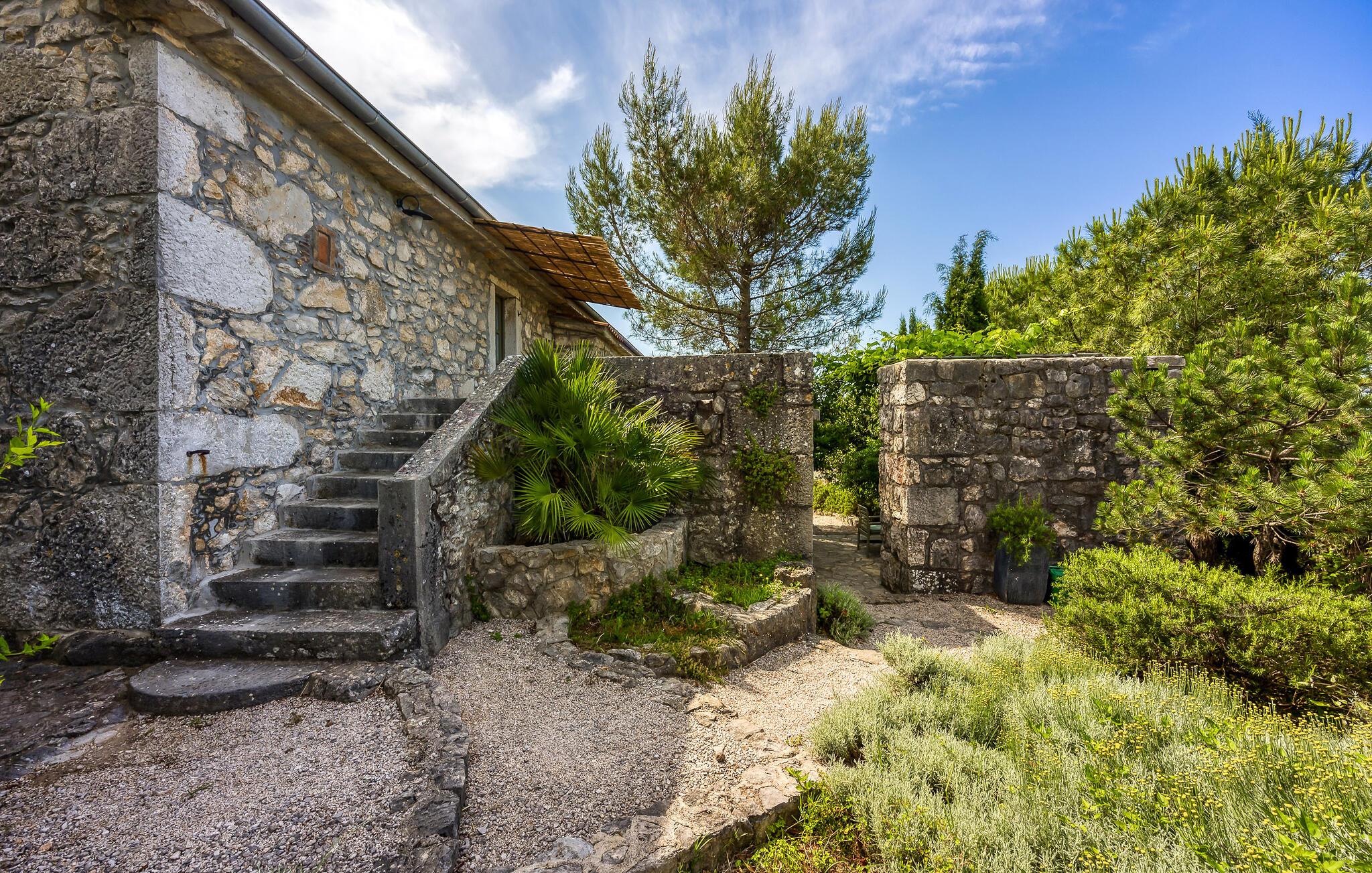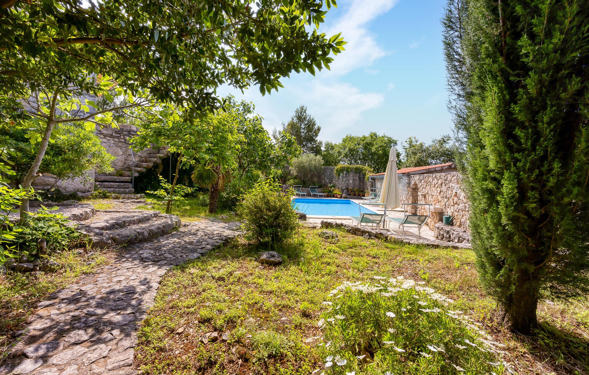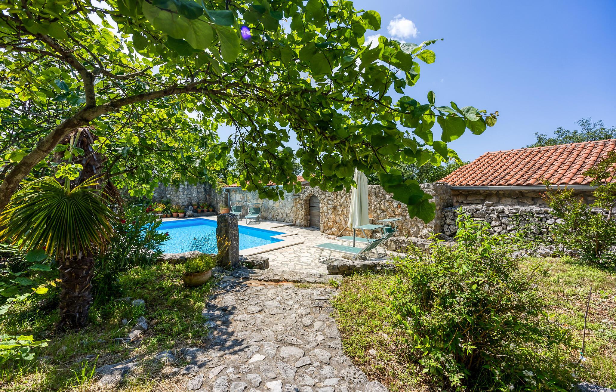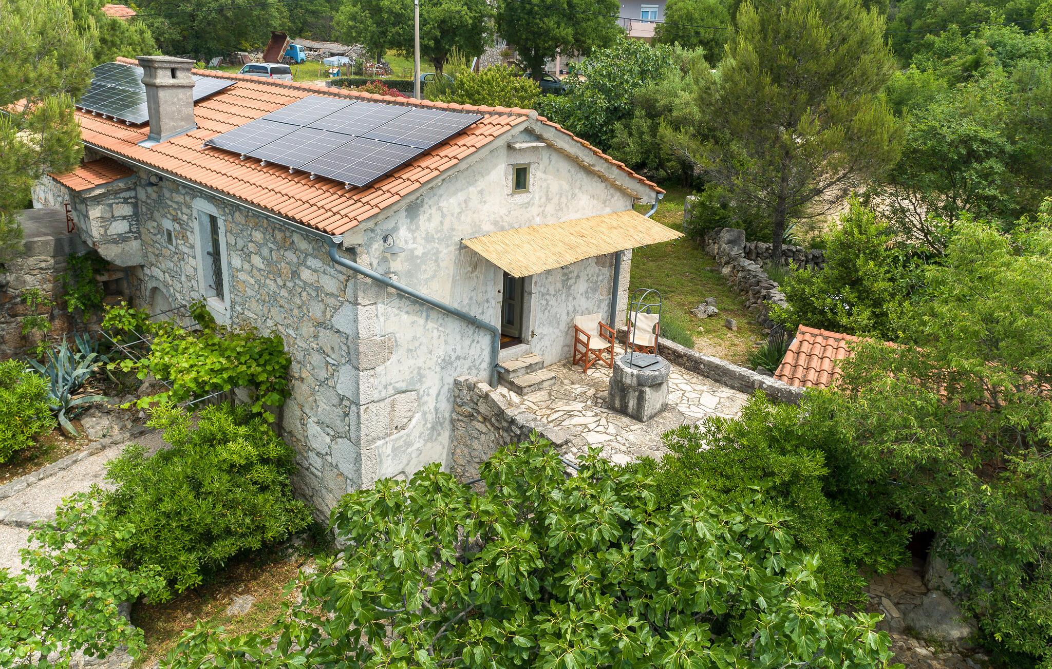 Rustikk atmosfære i et rolig område. Omgitt av den vakre, grønne middelhavsfloraen på øya Krk, finner du dette smakfullt og tradisjonelt innredede feriehuset. Bajcici er et rolig sted i Kvarnerbukten. I første etasje av feriehuset ligger det romslige kjøkkenet og stuen, mens i andre etasje er det to soverom. Det lille, koselige annekset venter på gjestene med ett soverom og et bad. Videre venter et vakkert svømmebasseng og terrassen på den inngjerdede naturlige eiendommen, hvor du kan nyte utsikten over bassenget og de varierte omgivelsene mens du nipper til en kopp kaffe. Besøk byen Krk, i sommermånedene er mange kunstnere og ensembler gjester her. De andre pittoreske byene Vrbnik, Baska, Malinska og Punat ligger også på øya, de vil gjerne invitere deg til å besøke dem. Øyene Rab, Cres og Losinj kan nås daglig med utfluktsbåter. Den lille øya Kosljun er veldig sjarmerende og ligger i bukten Puntarska Draga. Her finner du, blant andre kulturhistorisk verdifulle steder, et kloster som huser et arkeologisk museum og et bibliotek med imponerende historiske bøker. Folkedrakter fra øya Krk og fra de andre regionene i Kvarnerbukta oppbevares også her. Den lille øya er et svært attraktivt utfluktsmål på grunn av sin viktige kulturarv og besøkes av mange turister. Under sommerfestivalen på Krk arrangeres det også konserter i klosteret.