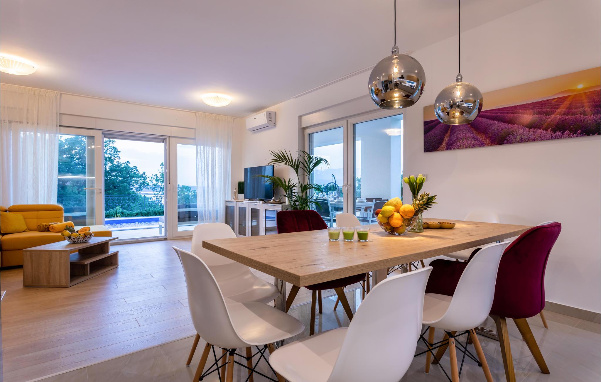 Dette fortryllende feriehuset inviterer deg til en avslappende ferie. Det ligger i nærheten av havet og skogen, i den lille landsbyen Klimno, som ligger på den vakre øya Krk. Det luftige interiøret er moderne og fullt utstyrt for å tilfredsstille smaken og behovene til selv de mest krevende gjestene. Grill, solsenger, boblebad og utendørsbasseng samt inngjerdet hage er tilgjengelig i hagen. Klimno, så vel som hele øya Krk, tilbyr et ekstremt rikt utvalg av underholdnings-, kultur- og sportsfasiliteter. Det er mange muligheter for en aktiv ferie: promenader, wakeboarding, sykkelstier og gokartbaner. Prøv et rikt og utmerket gastronomisk tilbud og førsteklasses lokale viner.