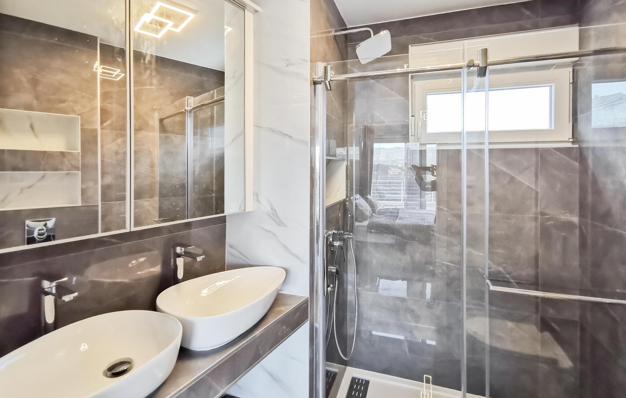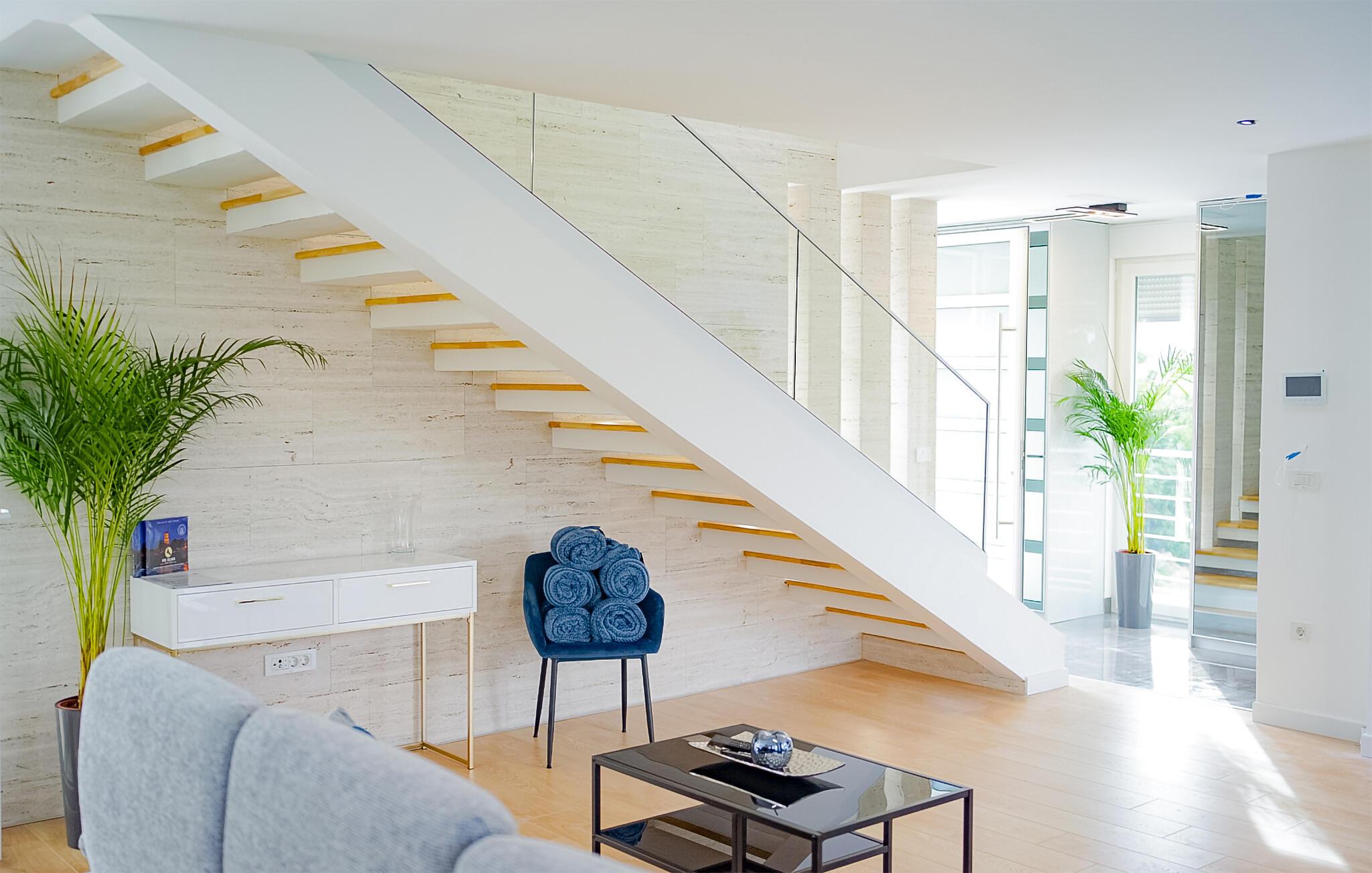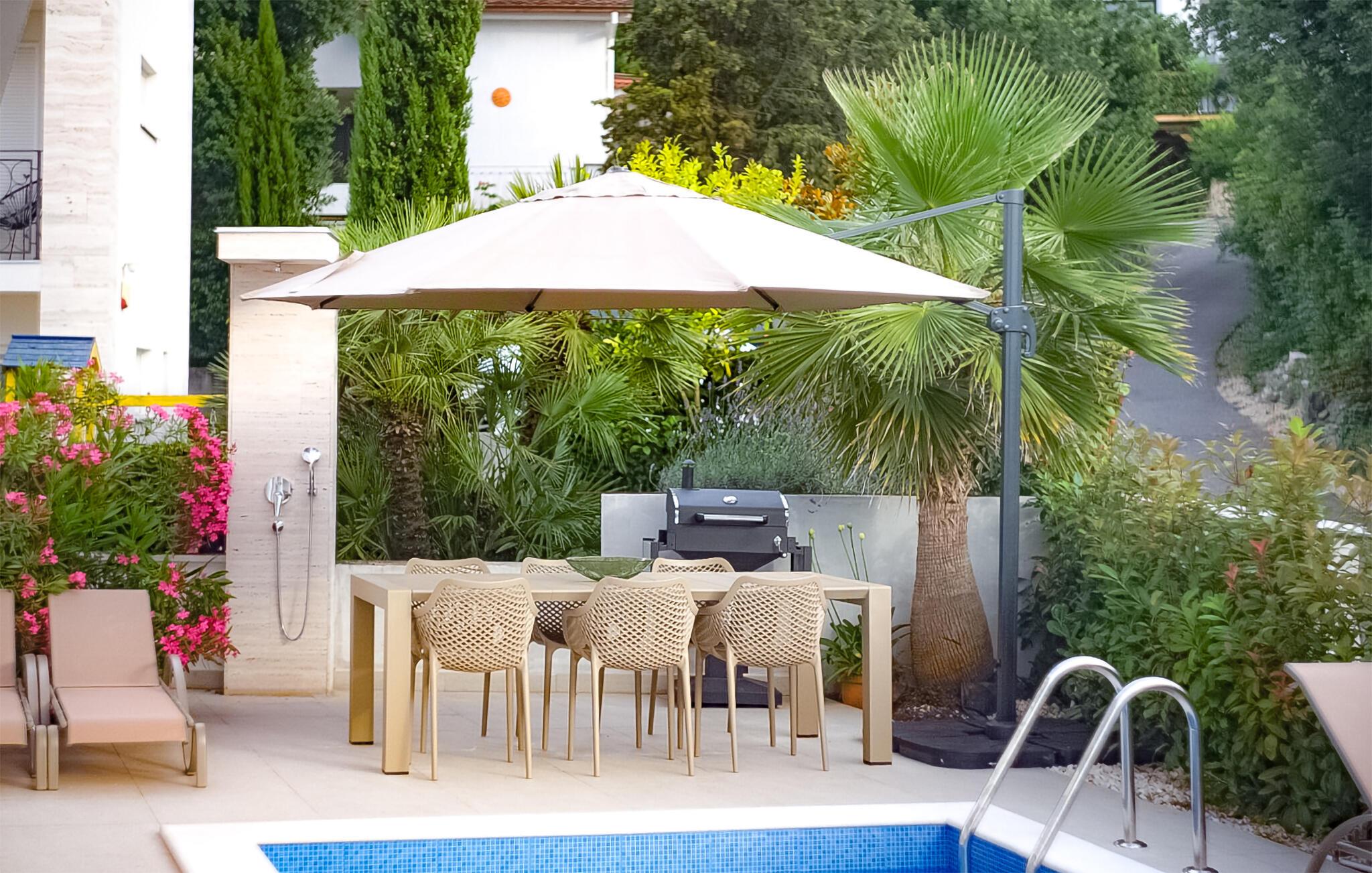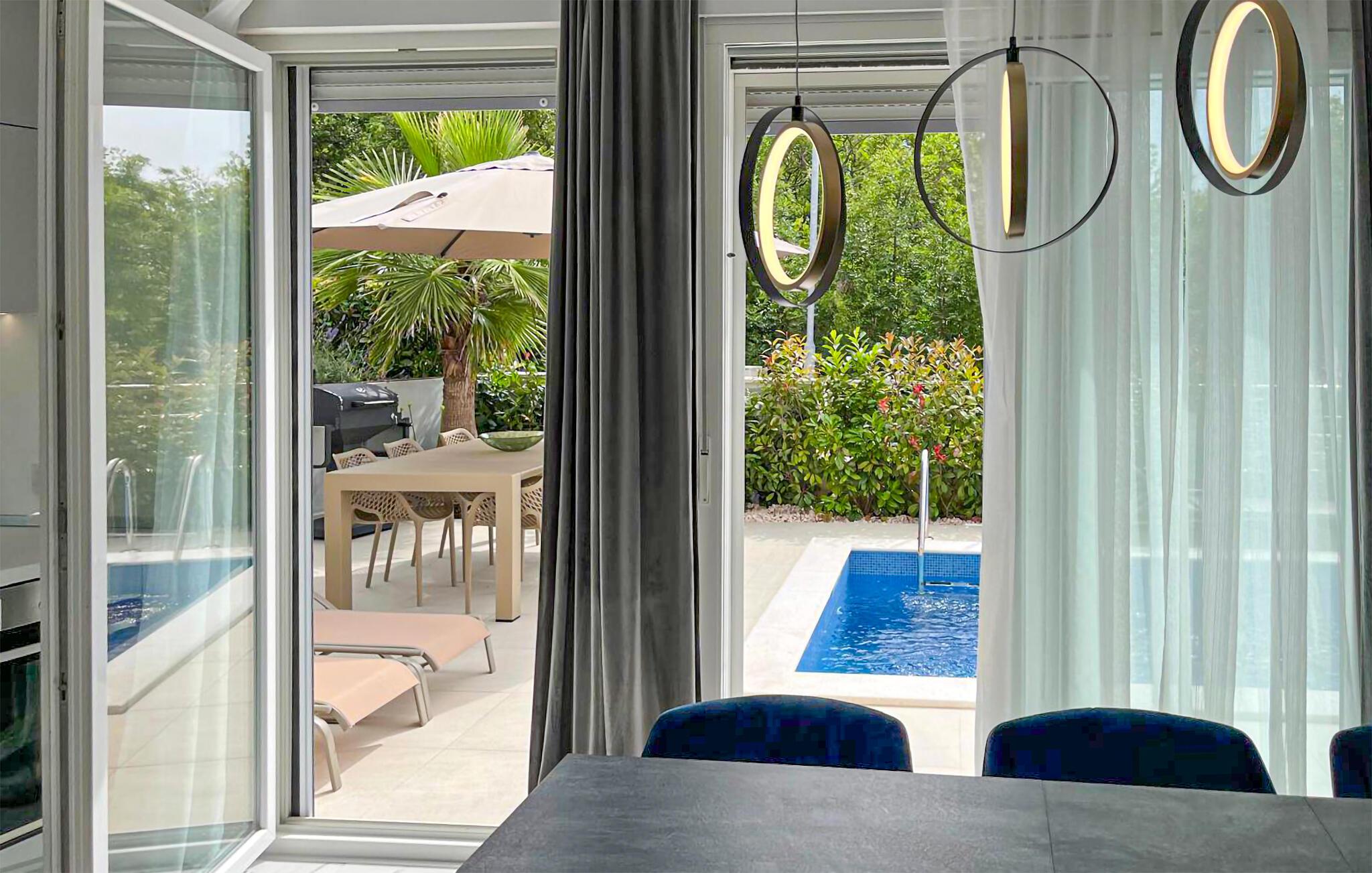 Fra kjøkkenet er det utgang til terrassen, hvor det er et svømmebasseng og komfortable solsenger for avslapping. Du kan også nyte de andre koselige terrassene med vakker utsikt over havet. Her kan du starte dagen med frokost eller en svømmetur, eller spise lunsj eller middag ved spisebordet. Se barna svømme eller ta en dukkert selv mens andre fortsatt sover.