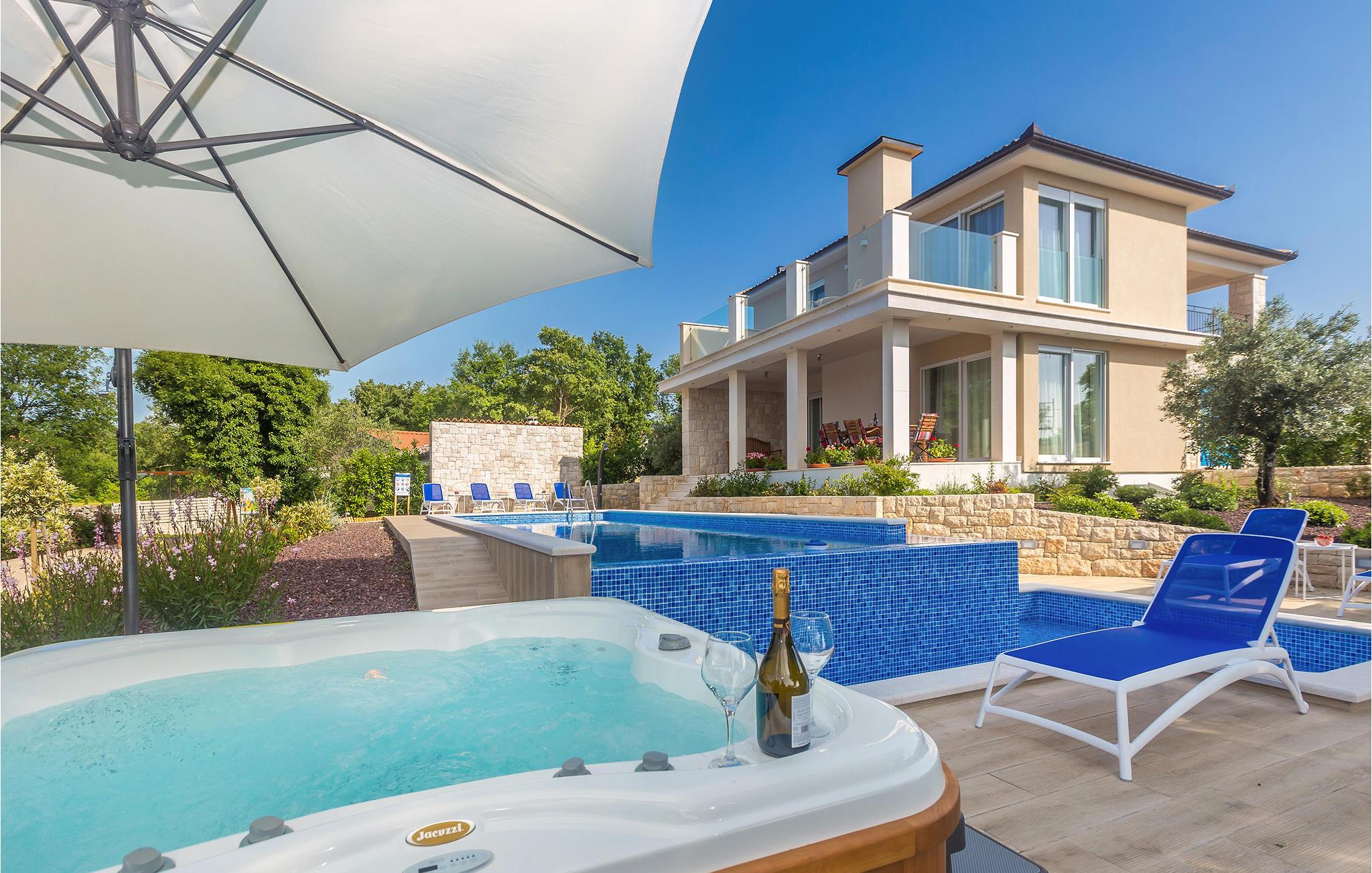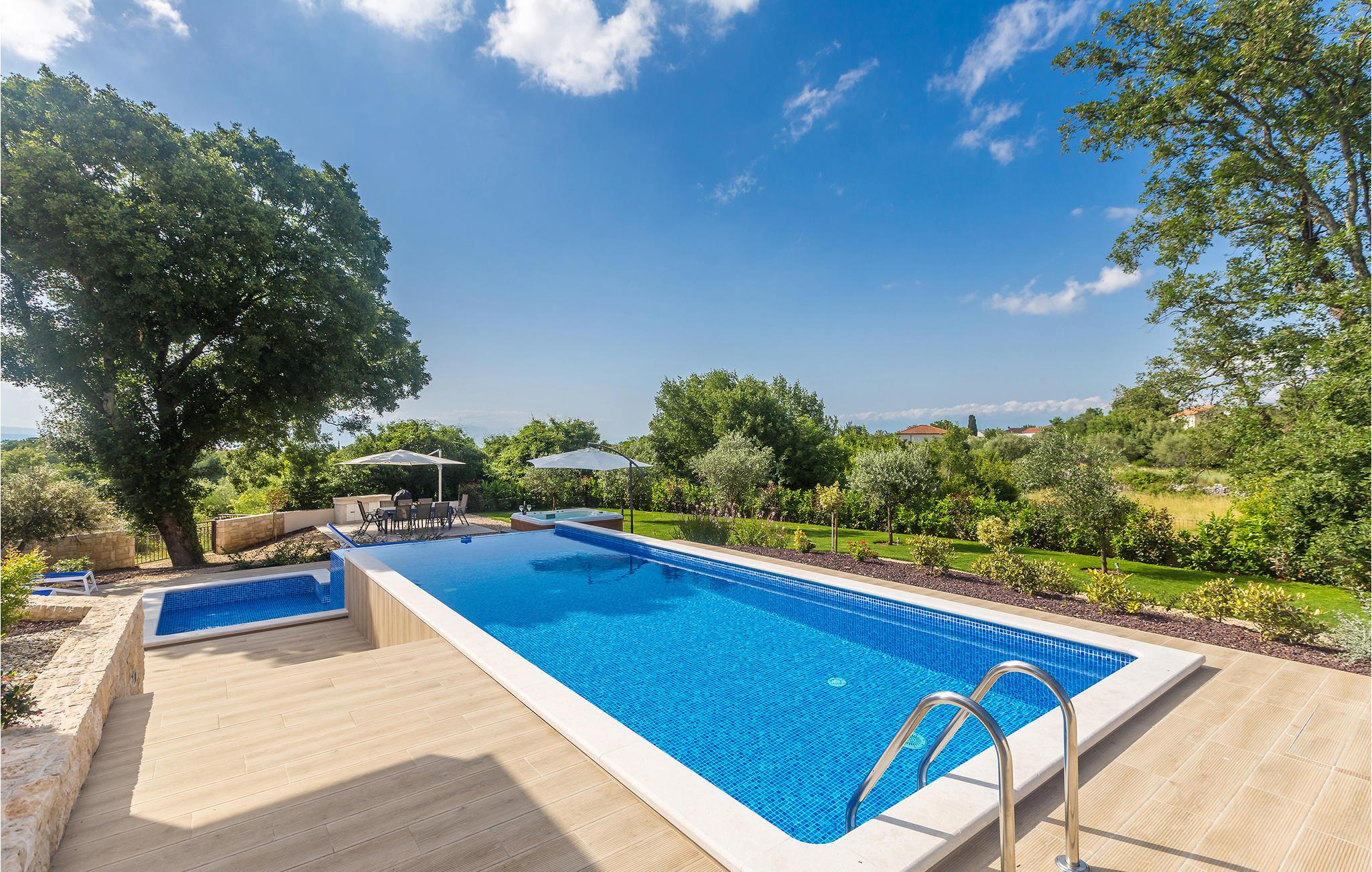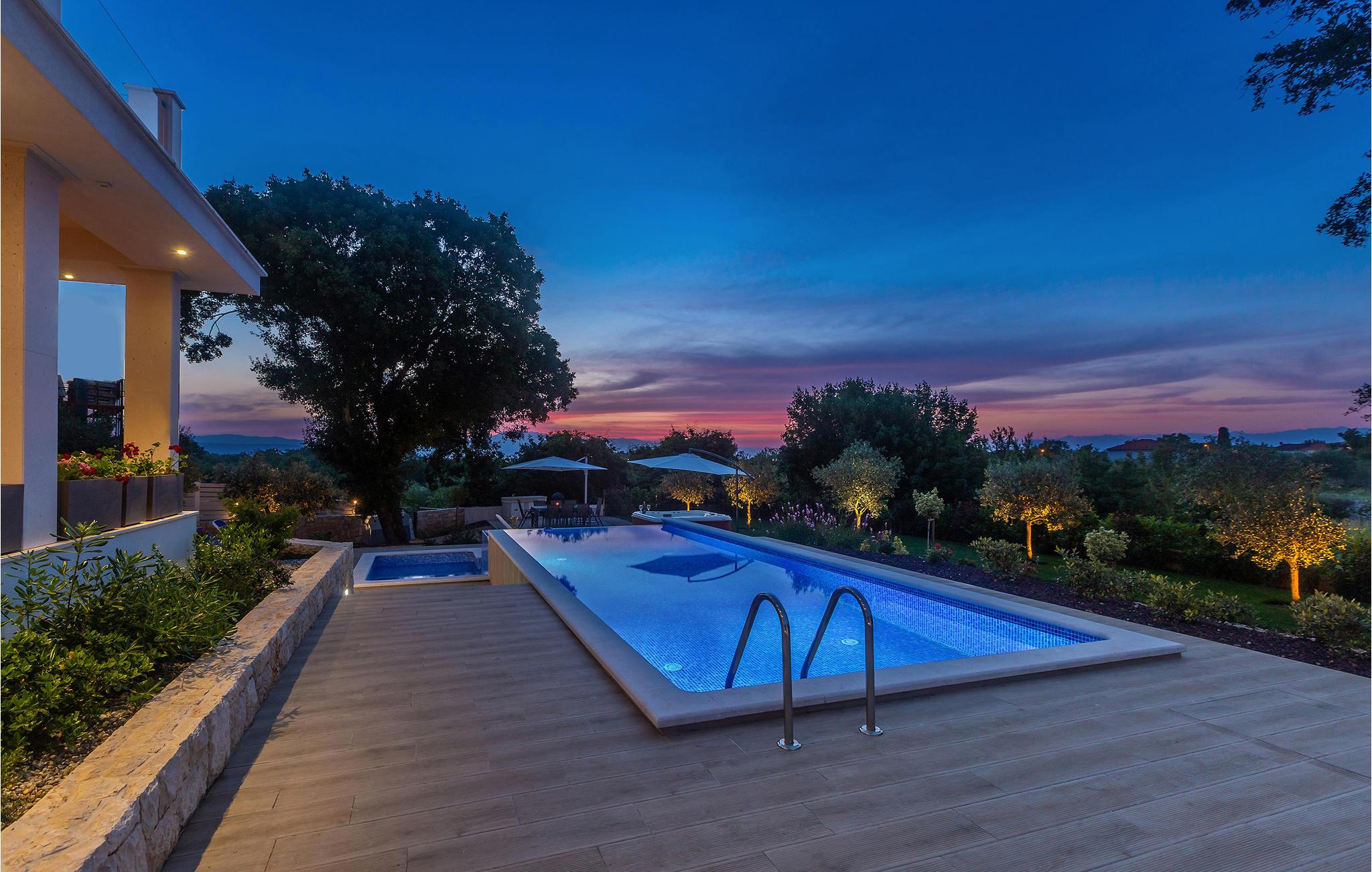 Dette vakre feriehuset med eget basseng ligger i den lille landsbyen Ljutii på den solfylte øya Krk, like ved byen Malinska. Huset er romslig, stilfullt innredet og strekker seg over tre etasjer. I kjelleren er det badstue med avslapningsrom og underholdningsrom med biljard og bordfotball. Første etasje har en stor stue med kjøkken og et soverom, mens det er ytterligere tre soverom i øverste etasje. Det er også flere terrasser hvor du kan slappe av. I hagen venter et evighetsbasseng, og de yngste gjestene kan fordrive tiden i barnebassenget og med leker. Under oppholdet kan du besøke en av strendene i Malinska, hvor du også finner butikker, suvenirbutikker, restauranter og kafeer.