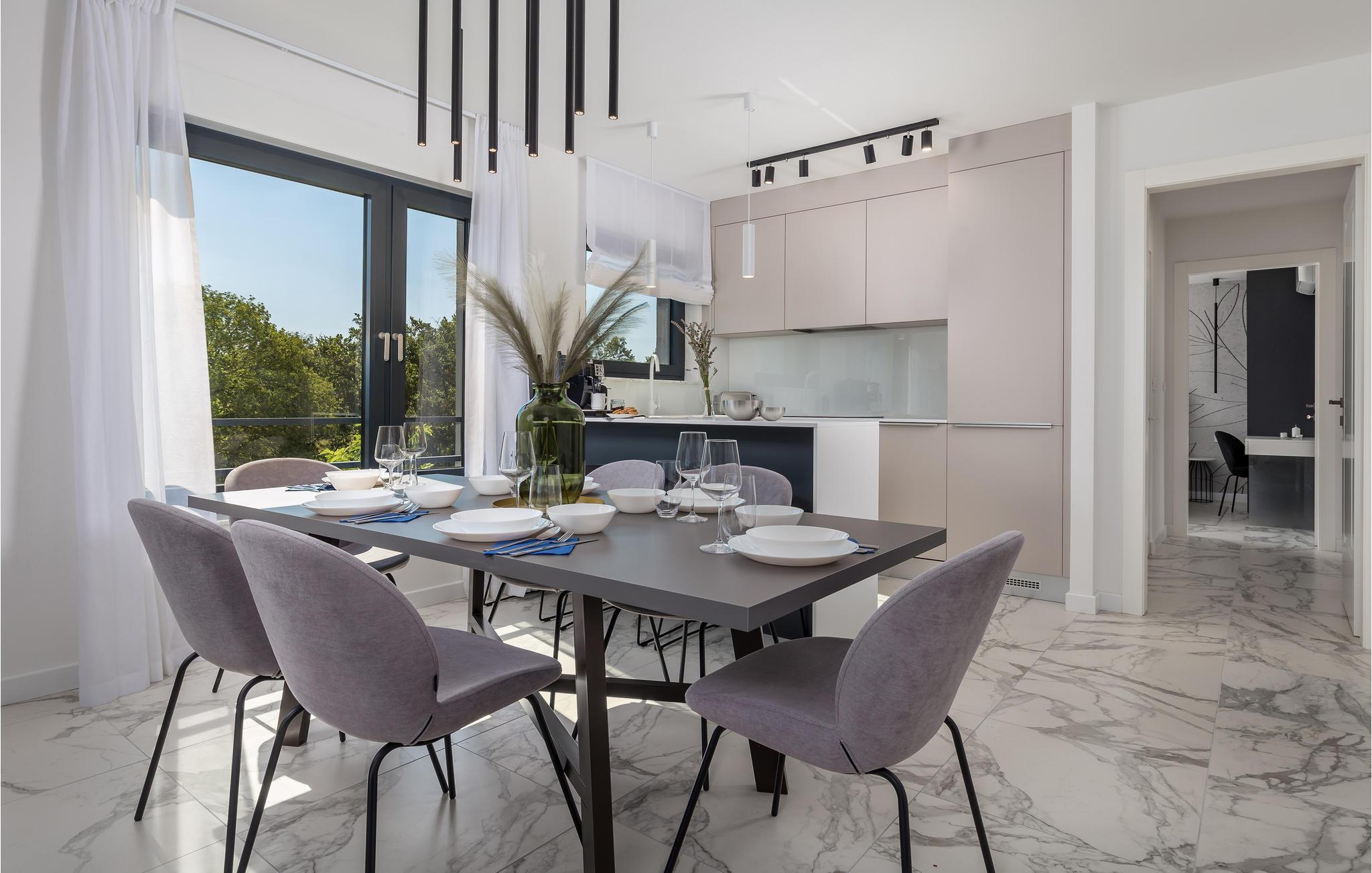 Det store, lyse kjøkkenet gir deg plass til å tilberede deilige måltider sammen med familien. Om morgenen kan du lage en deilig kaffe her og nyte den på den romslige balkongen med havutsikt. Planlegg aktiviteter og utflukter for den kommende ferien i hodet ditt. Nyt frokosten med familien din, bestående av lokal frukt og grønnsaker, på balkongen din. Om kveldene kan du slappe av sammen på den store sofaen i stuen og se en film.