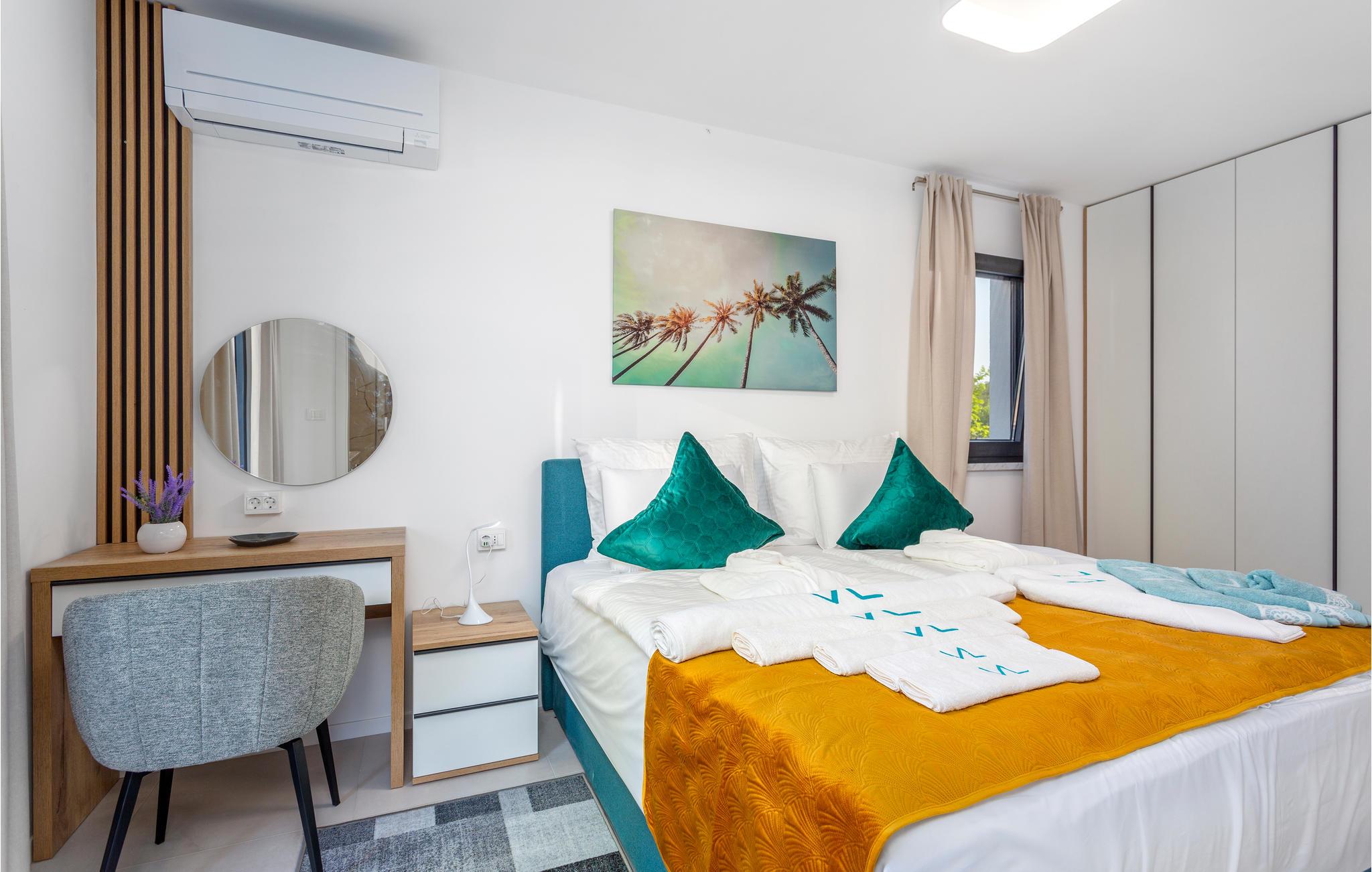 Velkommen til denne komfortable leiligheten nær stranden, som tar imot sine gjester i en svært attraktiv beliggenhet med panoramautsikt, akkurat det rette stedet for en hyggelig ferie. Lyse rom og moderne innredning gjør oppholdet her til en vellykket opplevelse, men det absolutte høydepunktet er utsikten dere kan nyte når dere lager mat, spiser og slapper av sammen. Gled dere til koselige kvelder sammen i sofaen etter opplevelsene. Nyt de herlige timene utendørs, mens dere soler dere på terrassen og lar blikket vandre over landskapet og glemmer alle tanker om hverdagen. Forfrisk deg i et av de to felles bassengene eller avslutt dagen med et beroligende bad i det private boblebadet under åpen himmel.