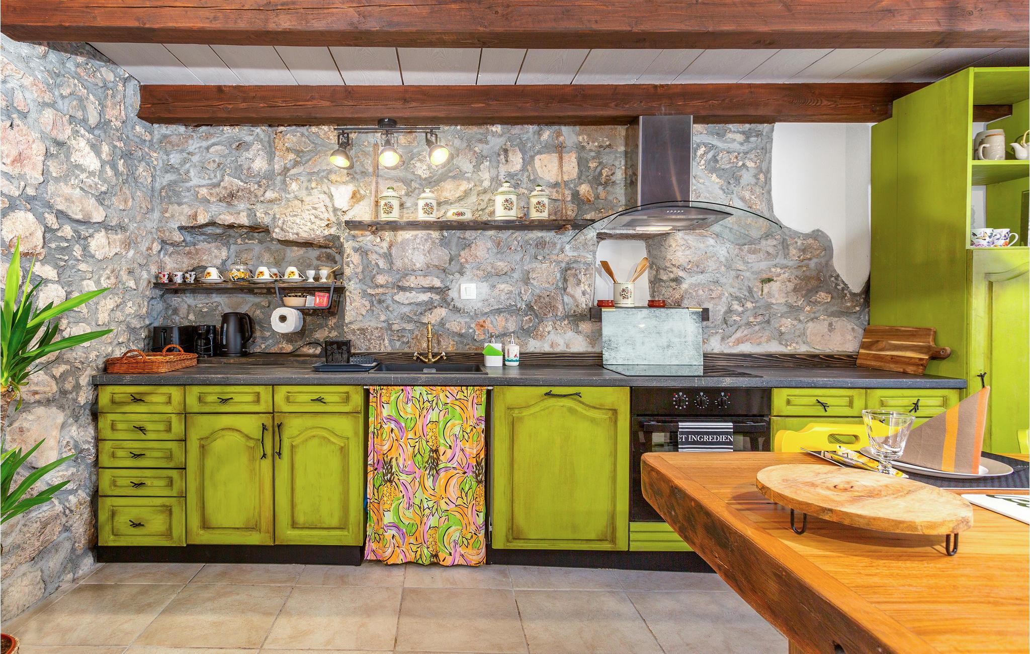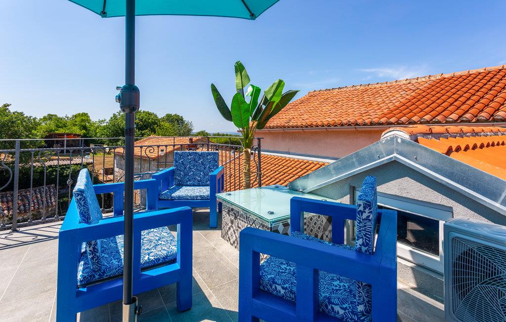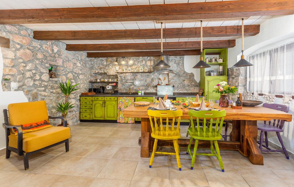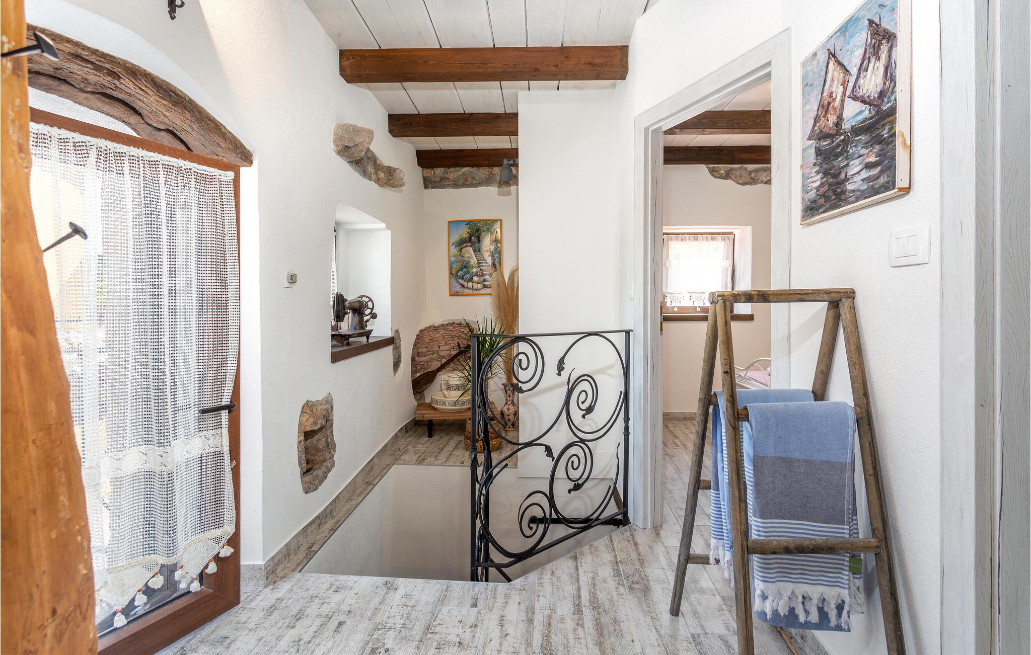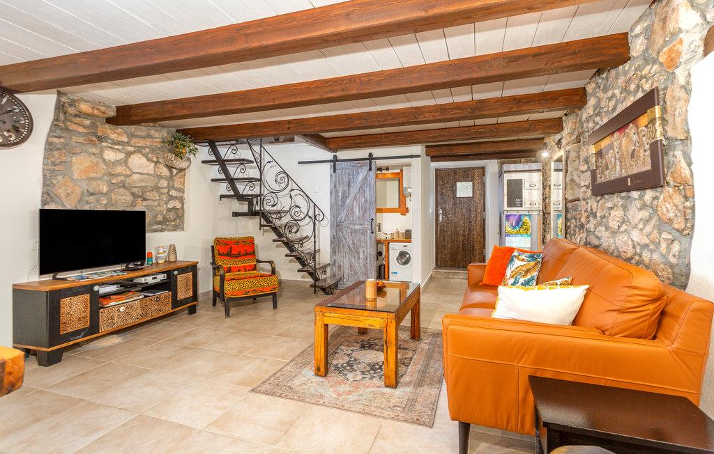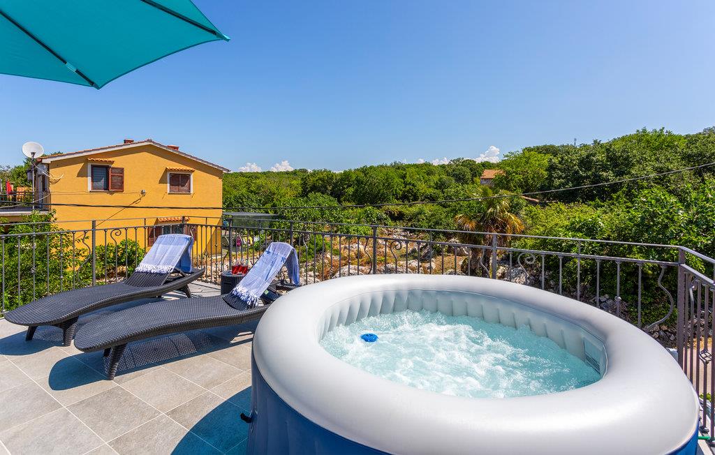 Dette koselige feriehuset med stein- og treelementer ønsker deg velkommen med vakker utsikt over Kvarnerbukta. Her kan du føle deg som hjemme og slappe av i en tiltalende, lokal atmosfære. Du kan også se frem til to terrasser. På den ene kan du nyte en kopp kaffe med delvis utsikt over havet og de varierte omgivelsene. Du kan også slappe av i boblebadet og lese favorittboken din. Den nedre terrassen er inngjerdet, og her er det en grill som du kan bruke til kveldsmåltidet.