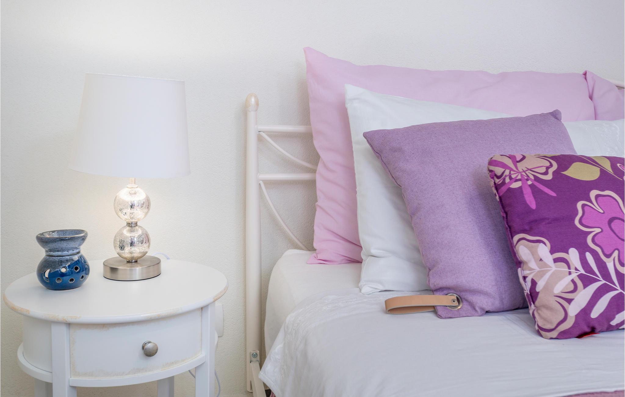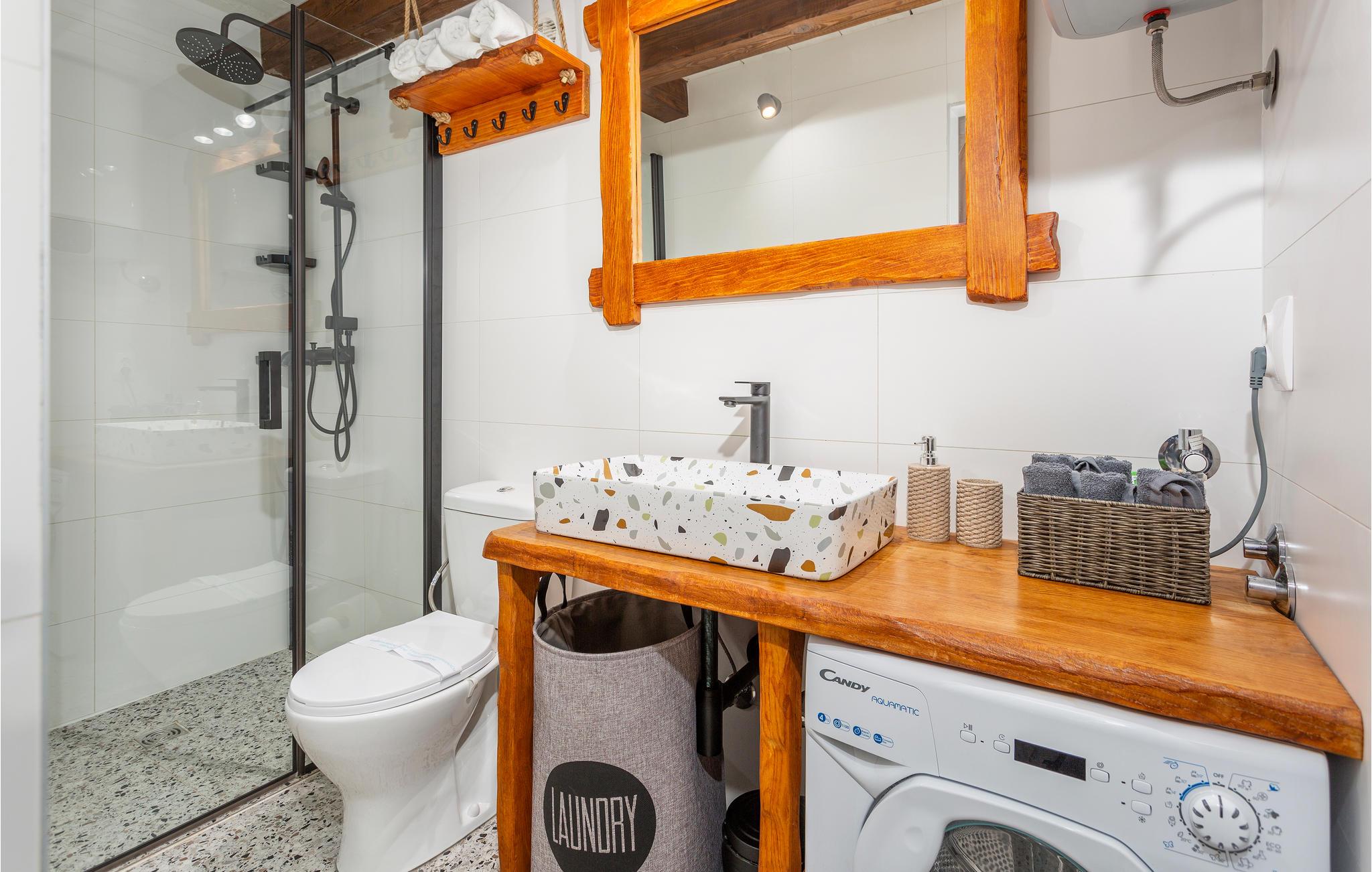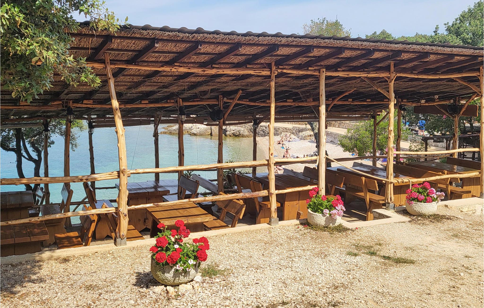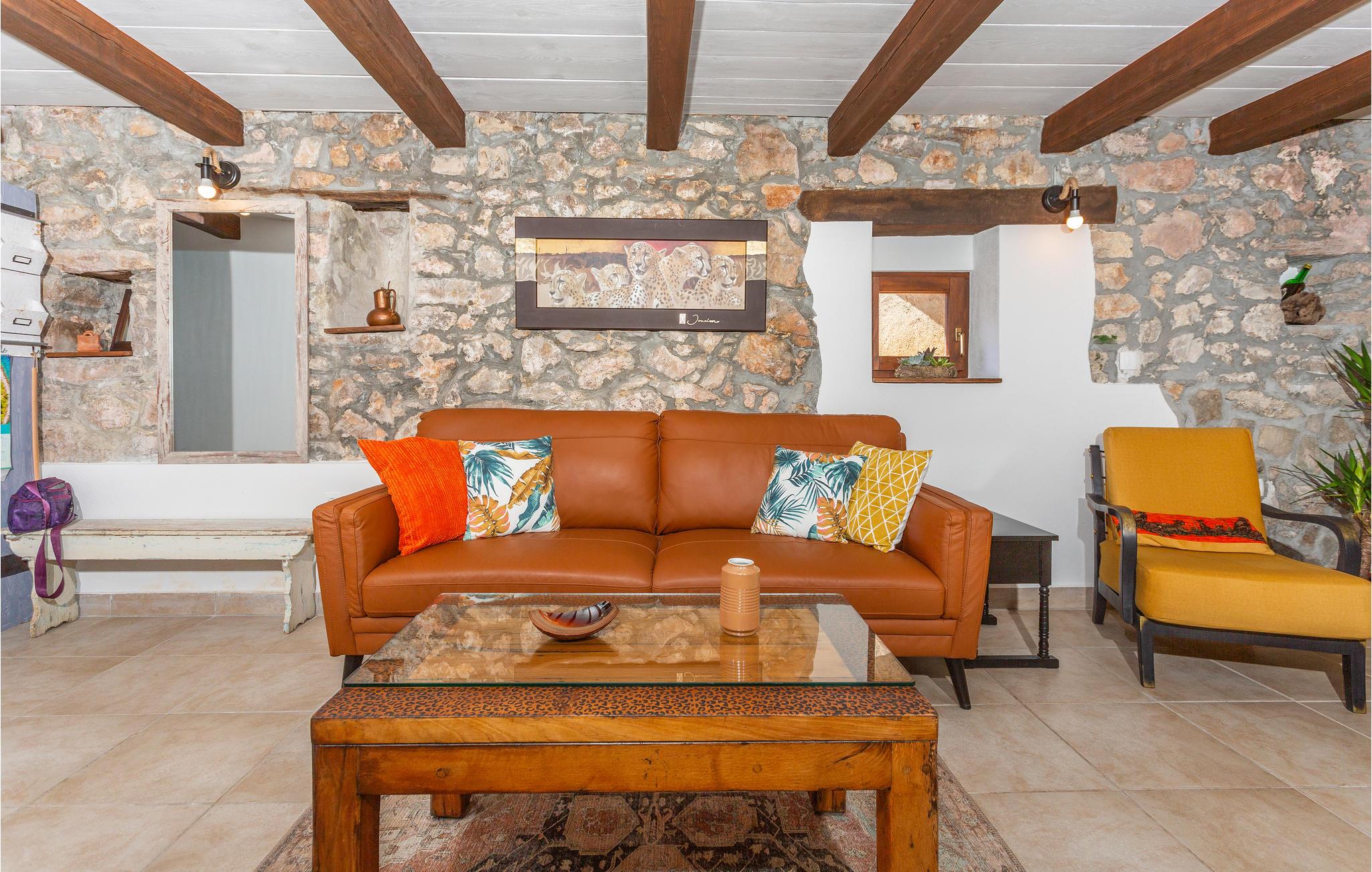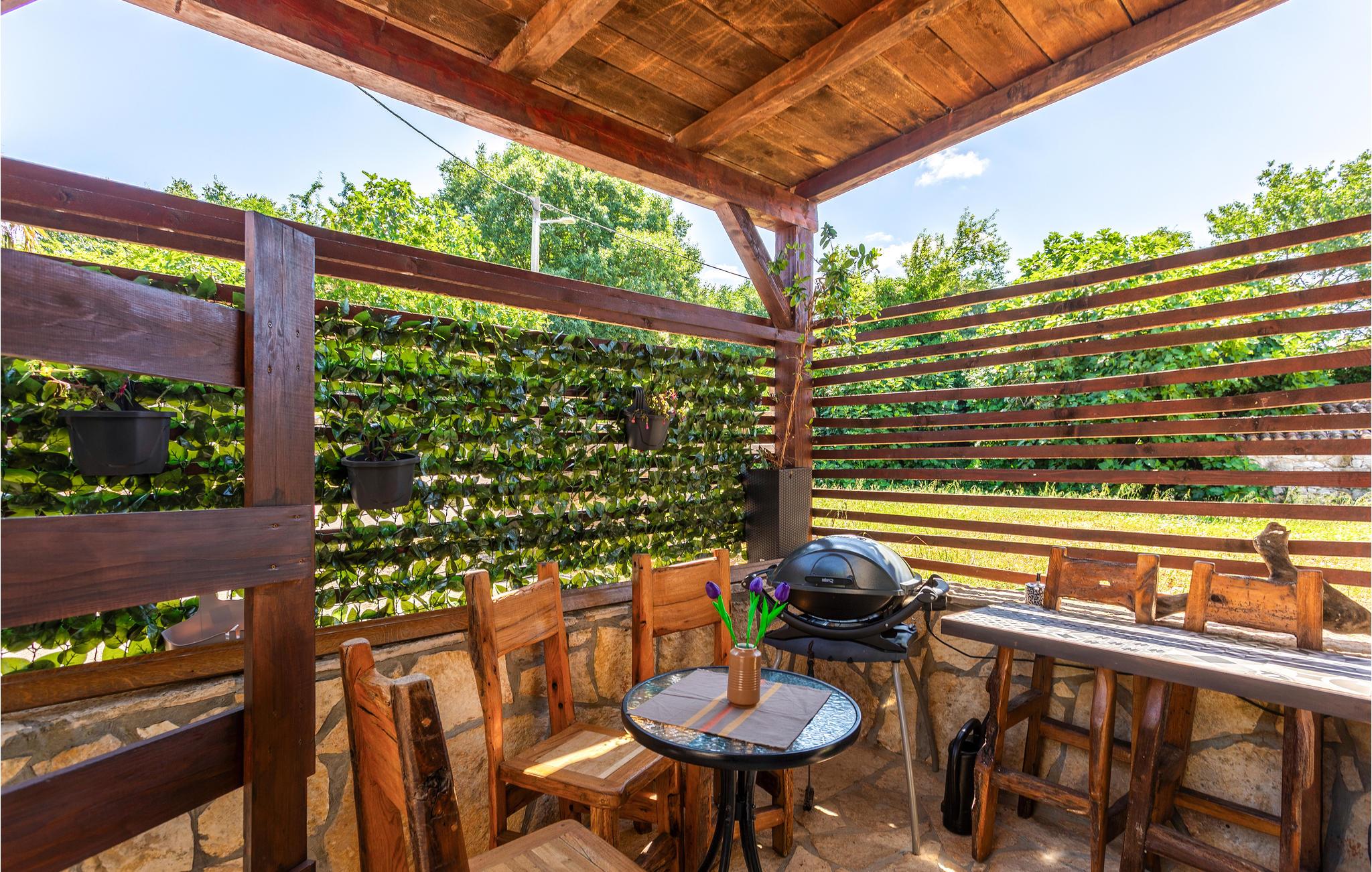 Dette koselige feriehuset med stein- og treelementer ønsker deg velkommen med vakker utsikt over Kvarnerbukta. Her kan du føle deg som hjemme og slappe av i en tiltalende, lokal atmosfære. Du kan også se frem til to terrasser. På den ene kan du nyte en kopp kaffe med delvis utsikt over havet og de varierte omgivelsene. Du kan også slappe av i boblebadet og lese favorittboken din. Den nedre terrassen er inngjerdet, og her er det en grill som du kan bruke til kveldsmåltidet.