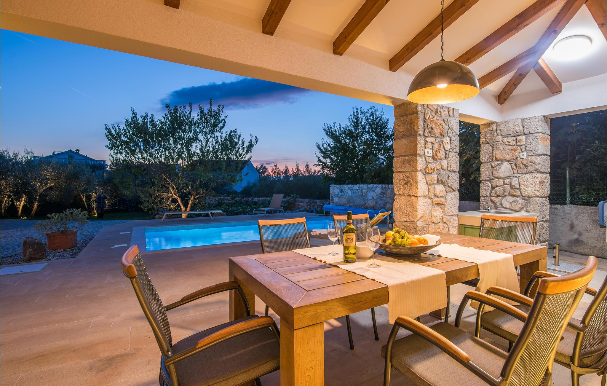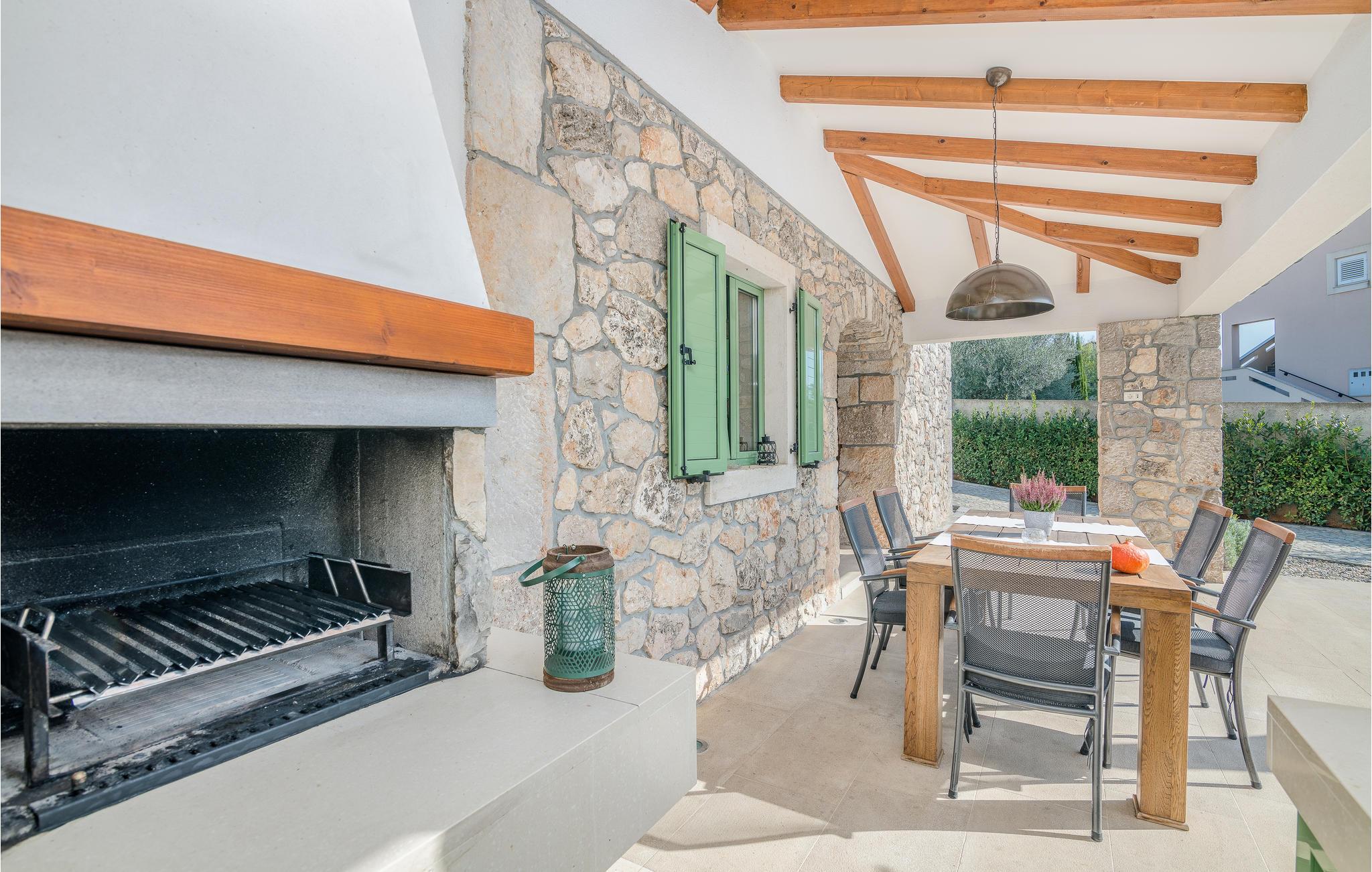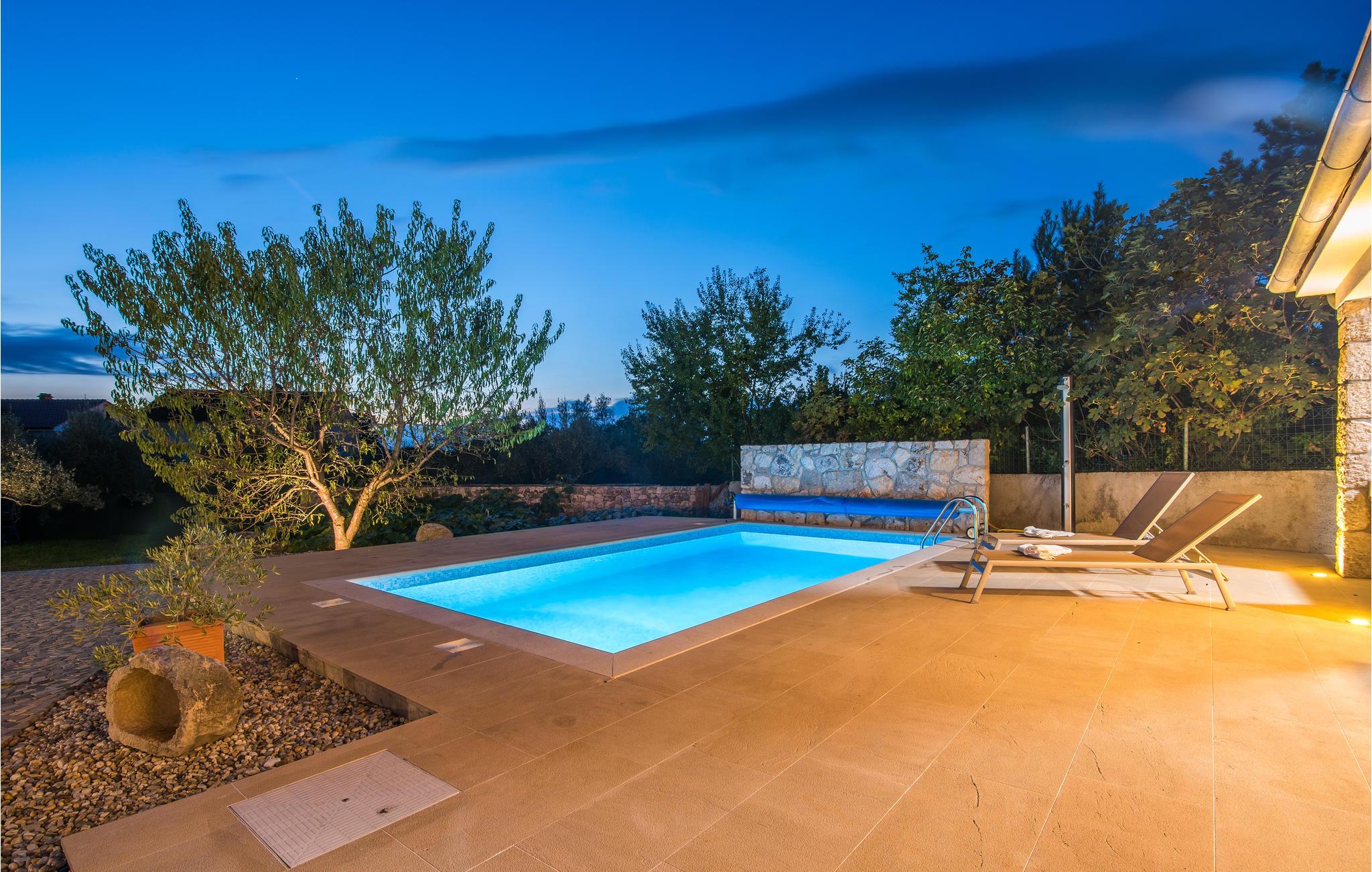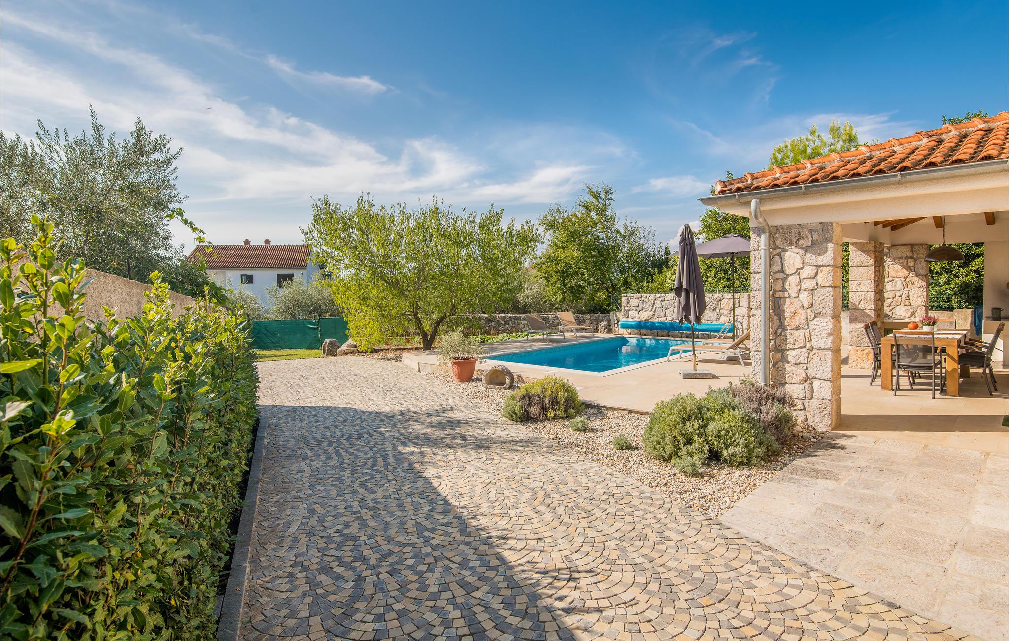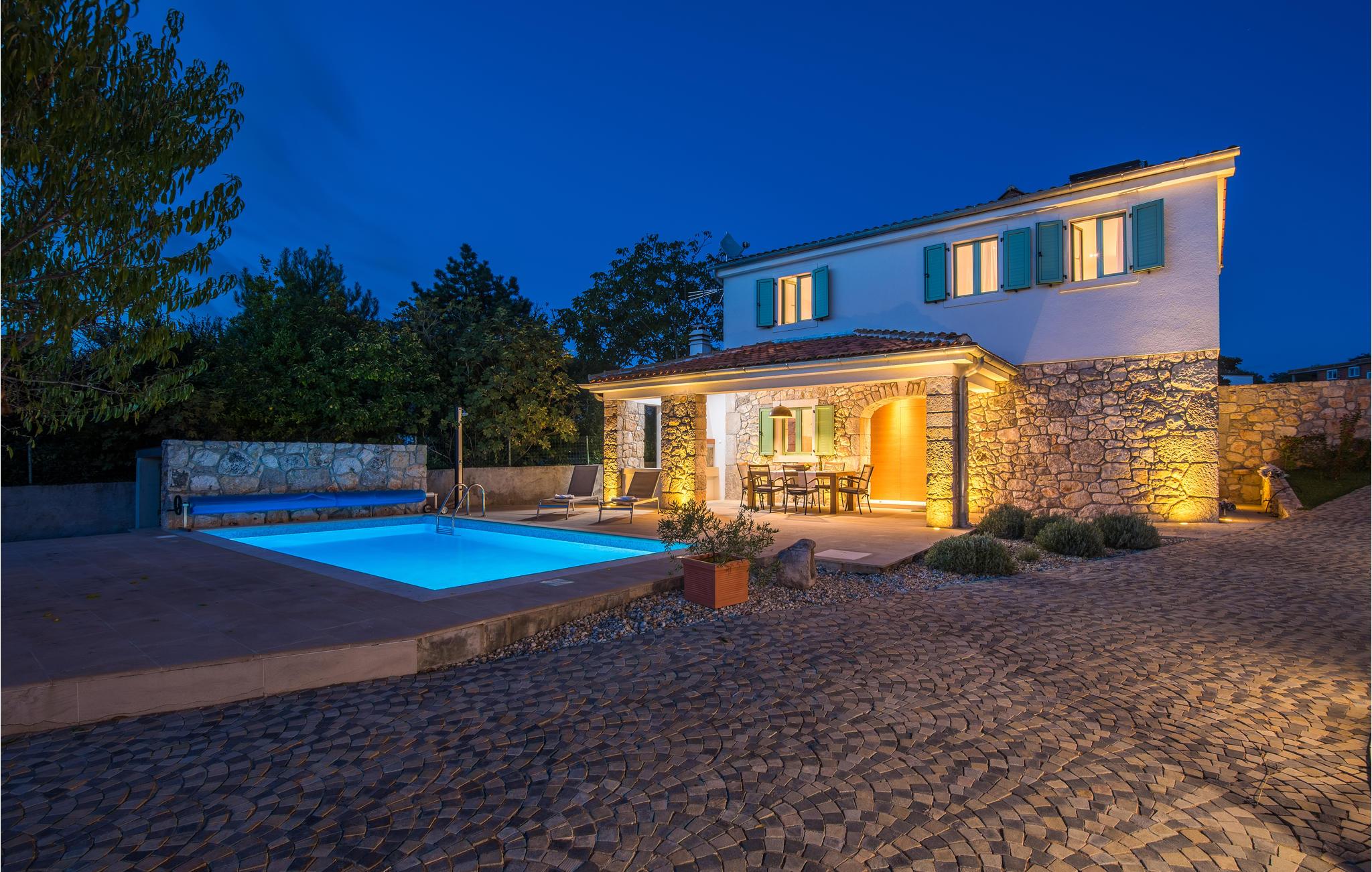 I nærheten av Malinska, i den lille landsbyen Radici, venter dette vakre feriehuset på deg. Det er fullt utstyrt og moderne innredet, en sjarmerende blanding av tradisjon og modernitet. Første etasje har en romslig stue med kjøkken og spisestue. Den interne trappen fører til 1. etasje med 2 soverom og 2 bad. Den vakkert vedlikeholdte og inngjerdede hagen med utsikt over olivenlunden tilbyr en rekke måter å slappe av på, med favorittboken din eller når du tilbereder favorittrettene dine på grillen eller finner forfriskning i bassenget. Økologiske sesongens grønnsaker er også tilgjengelig i hagen. En spasertur tar deg til kysten og strandpromenadene i Malinska. Det er sand- og rullesteinstrender og bortgjemte viker, samt fasiliteter som garanterer aktiv rekreasjon og underholdning. En lokal vei går bak huset.