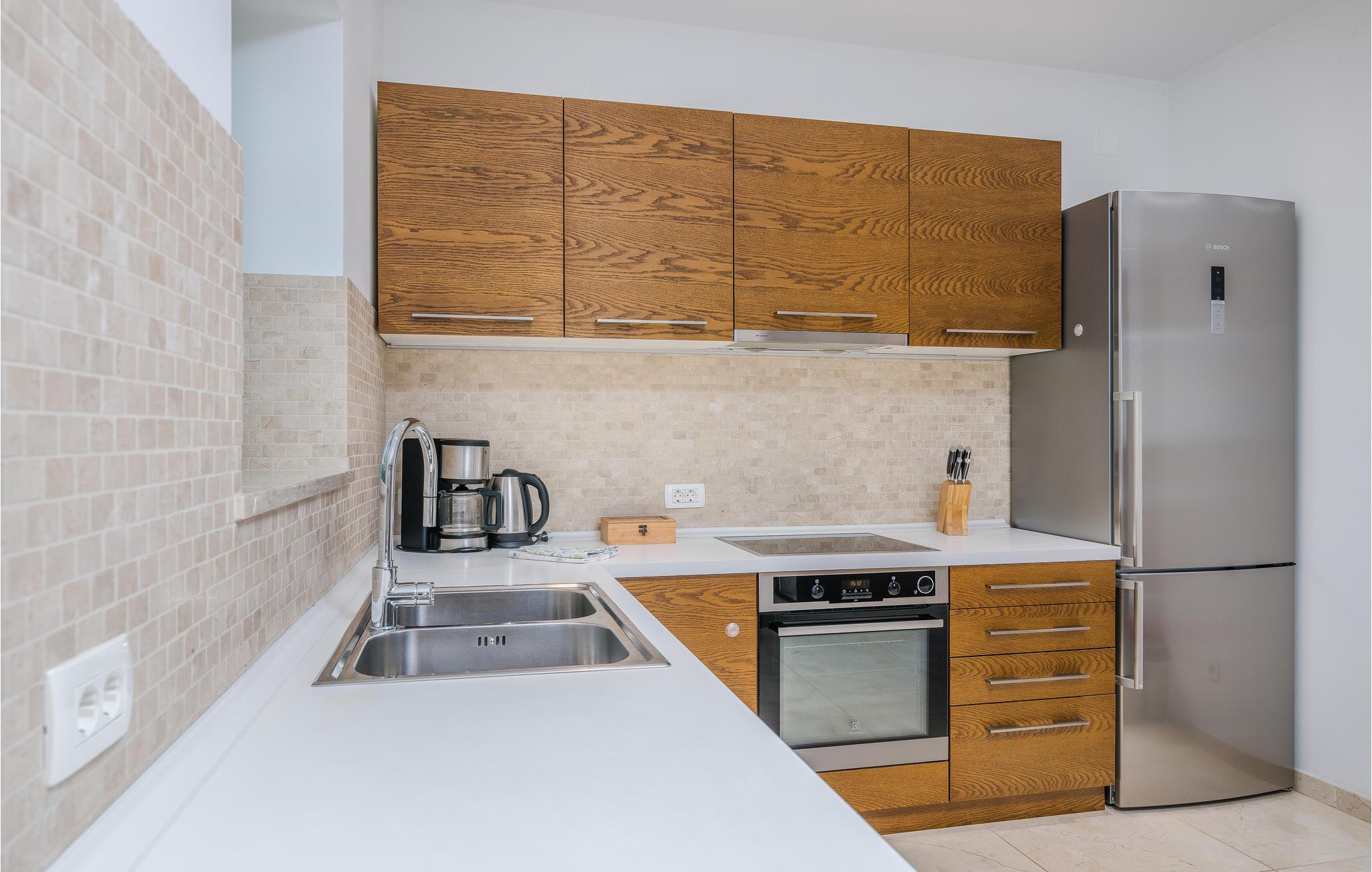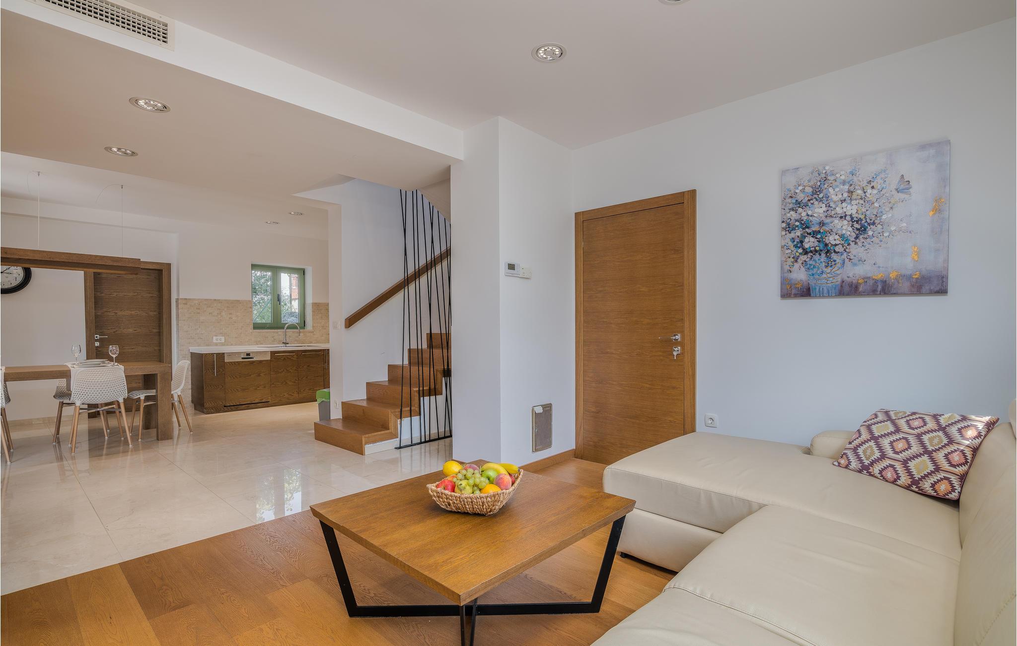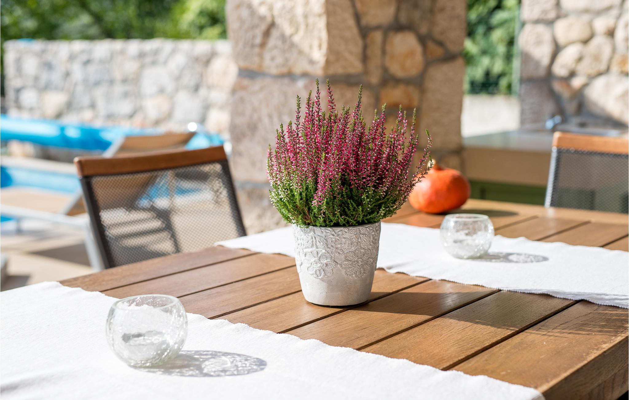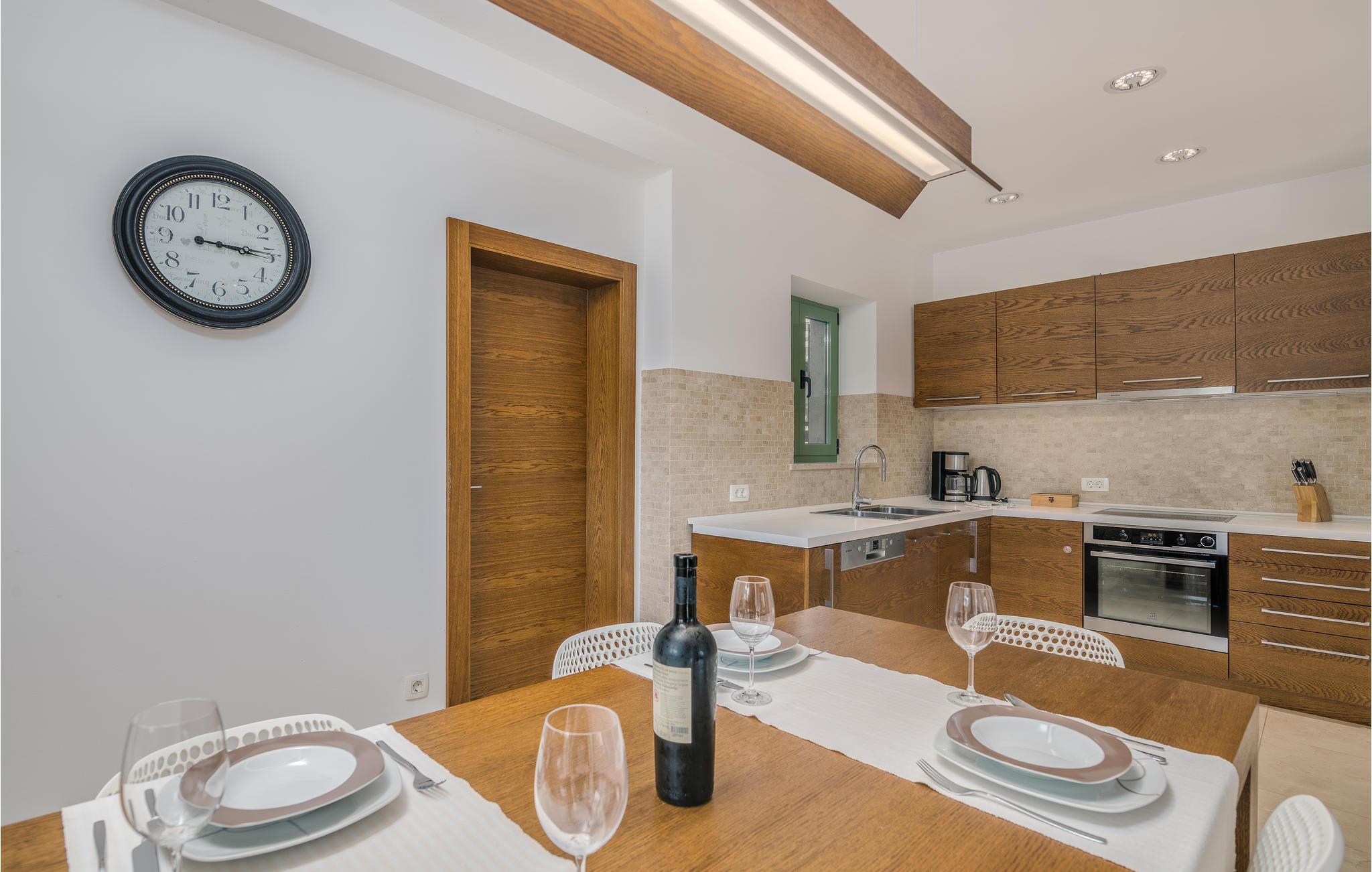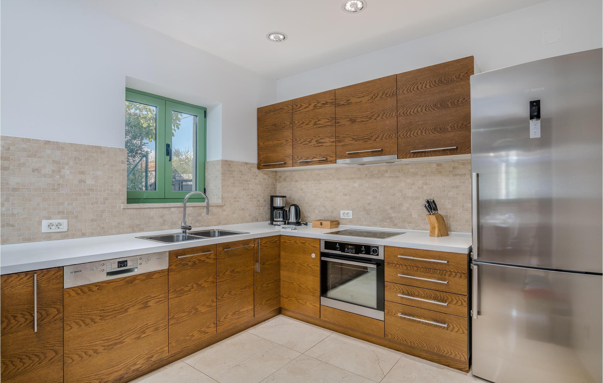 I nærheten av Malinska, i den lille landsbyen Radici, venter dette vakre feriehuset på deg. Det er fullt utstyrt og moderne innredet, en sjarmerende blanding av tradisjon og modernitet. Første etasje har en romslig stue med kjøkken og spisestue. Den interne trappen fører til 1. etasje med 2 soverom og 2 bad. Den vakkert vedlikeholdte og inngjerdede hagen med utsikt over olivenlunden tilbyr en rekke måter å slappe av på, med favorittboken din eller når du tilbereder favorittrettene dine på grillen eller finner forfriskning i bassenget. Økologiske sesongens grønnsaker er også tilgjengelig i hagen. En spasertur tar deg til kysten og strandpromenadene i Malinska. Det er sand- og rullesteinstrender og bortgjemte viker, samt fasiliteter som garanterer aktiv rekreasjon og underholdning. En lokal vei går bak huset.