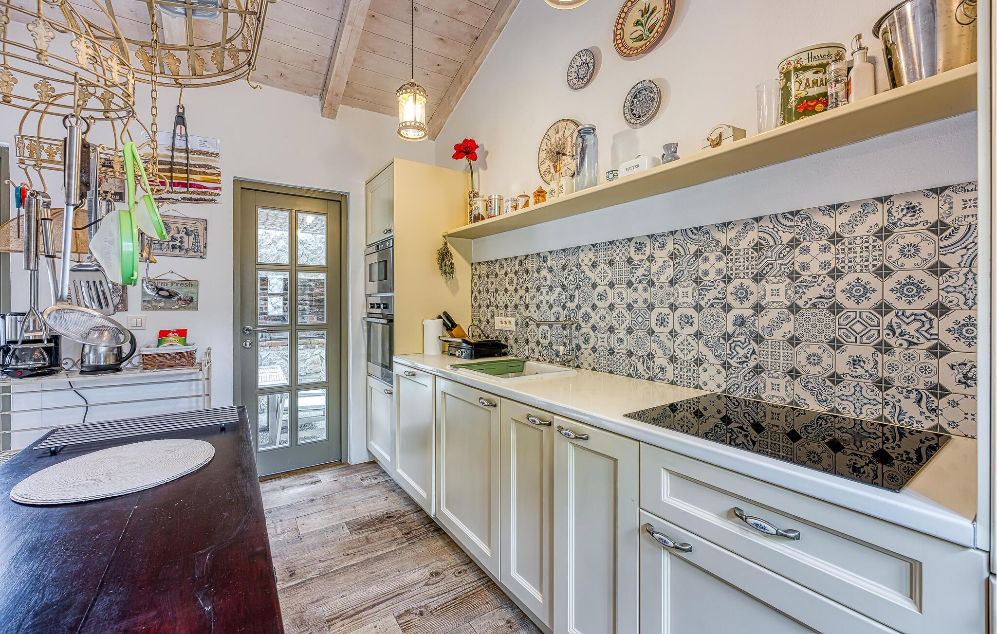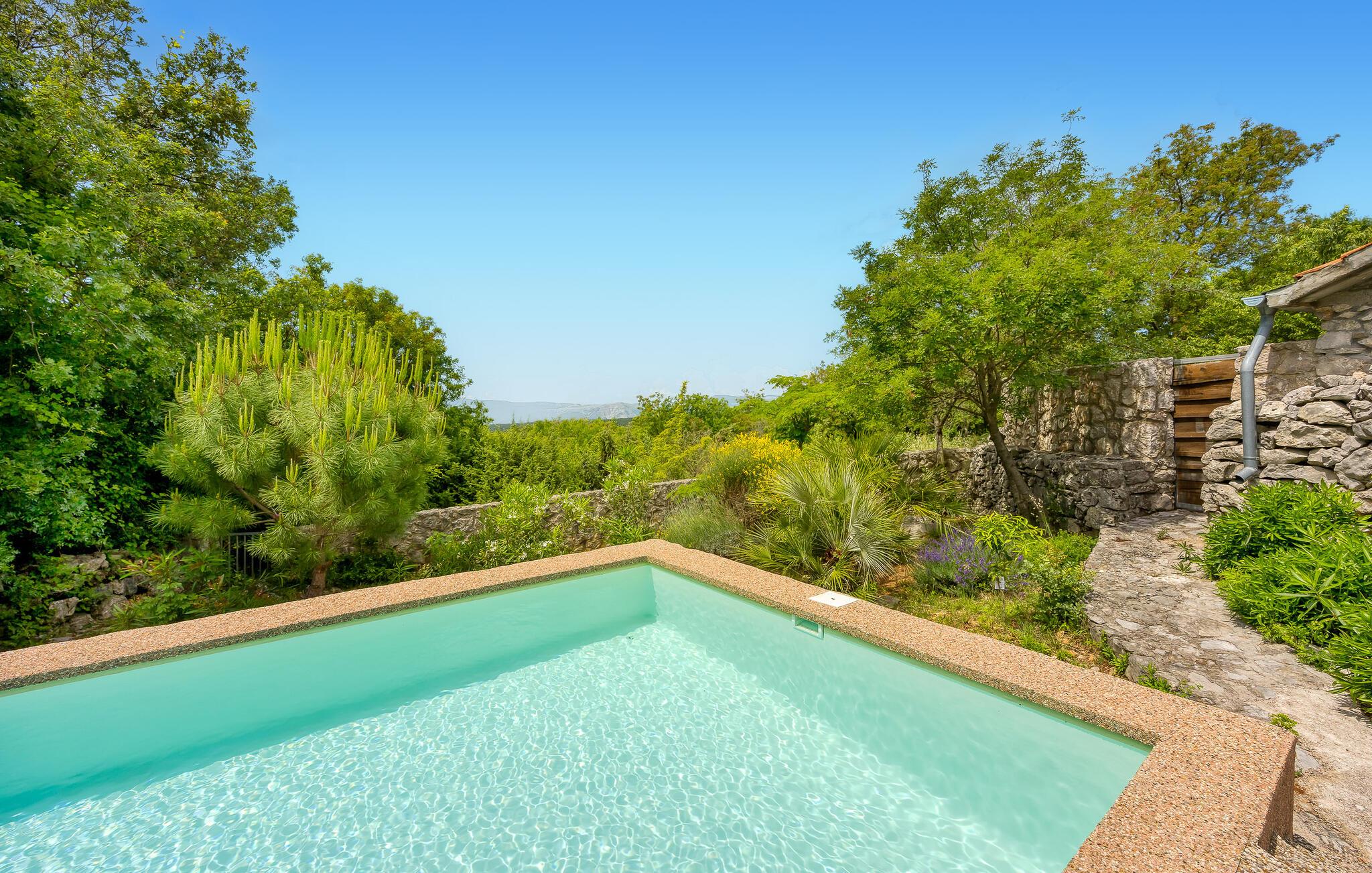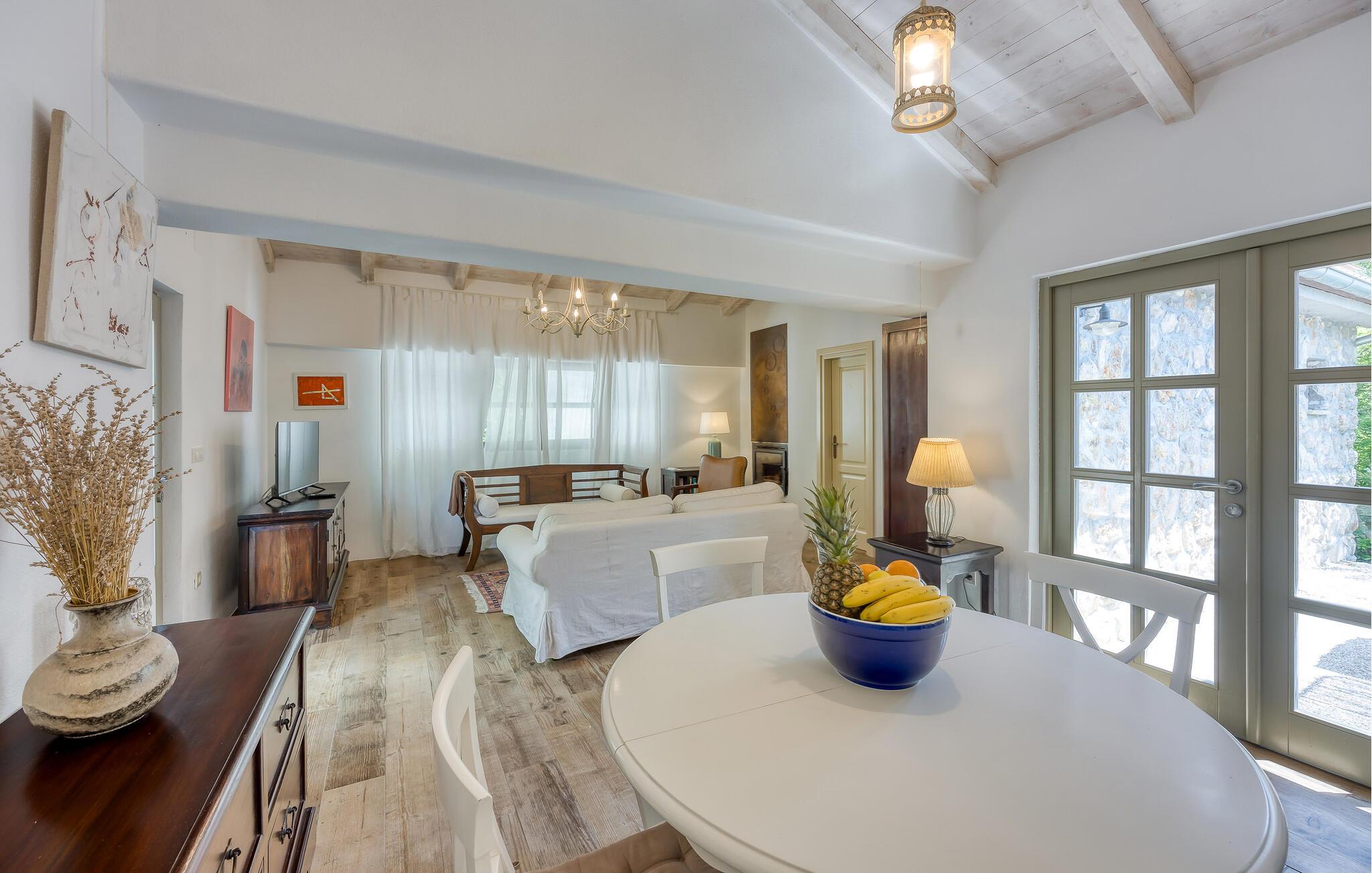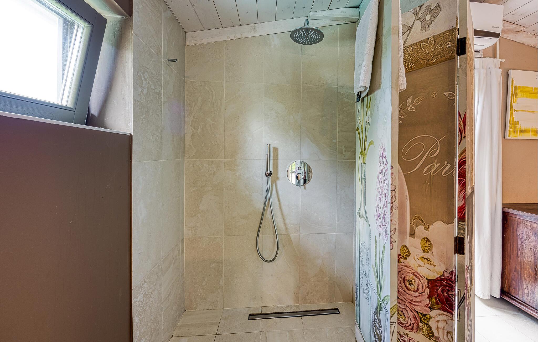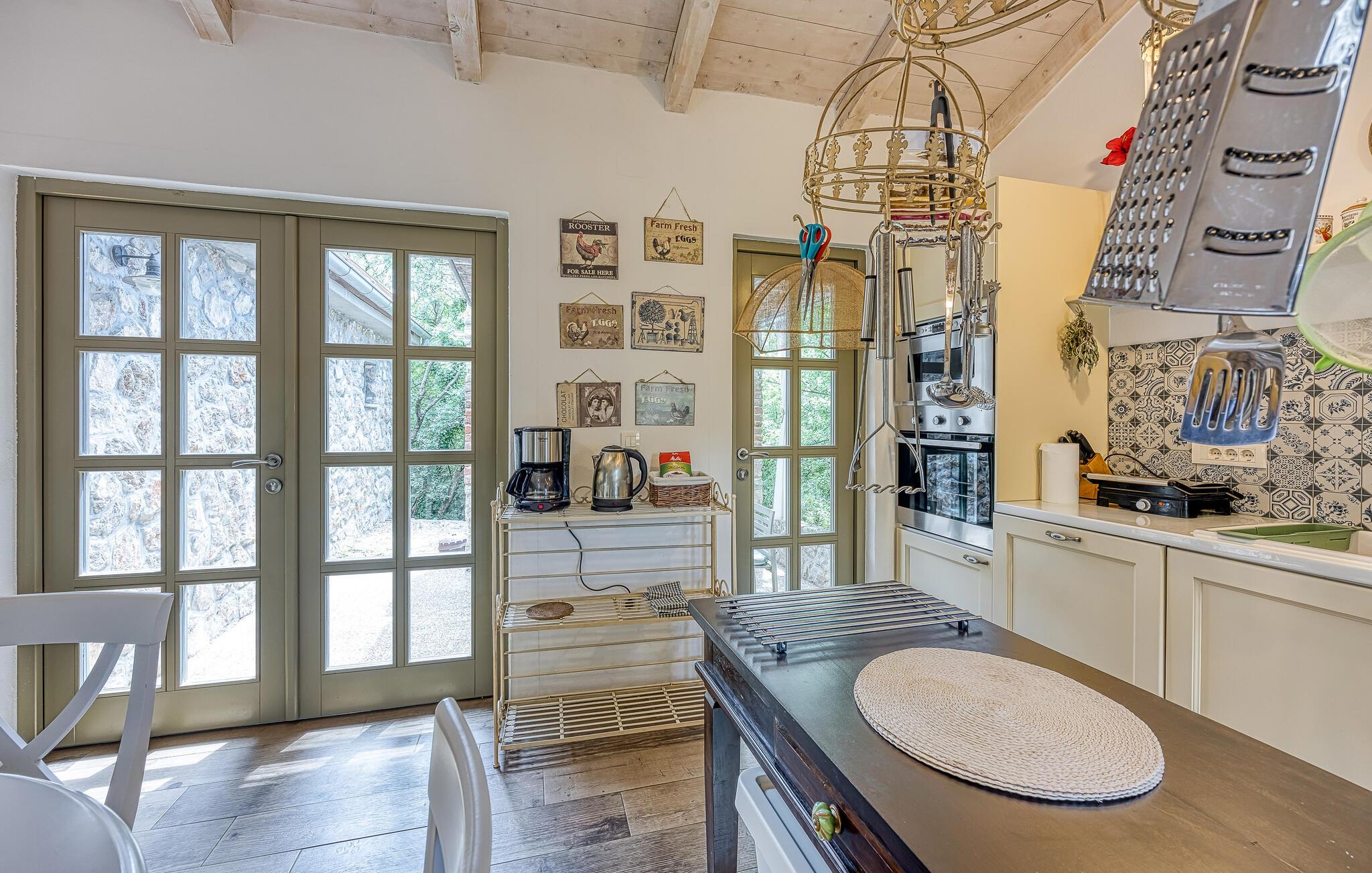 Dette vakkert innredede feriehuset ligger i Bajii, en liten og rolig landsby ikke langt fra den større byen Malinska og byen Krk. Det er et ideelt valg for en familieferie rett ved siden av skogen og omgitt av grøntområder. Hovedhuset har et stort kjøkken med åpen kjøkkenløsning og stue og et soverom med bad i åpen planløsning. Annekset ligger bare ti skritt unna og består av et soverom og et tilstøtende bad med åpen planløsning. Det er også et utendørsbasseng som er skapt for forfriskninger om sommeren, og det tilbyr også privatliv ettersom det er beskyttet mot innsyn. På den store, inngjerdede tomten på 1500 m2 er det flere terrasser med hagemøbler, solsenger og en utendørs murpeis. Parkering er tilgjengelig på eierens tomt ved siden av huset. Malinska og byen Krk kan nås på bare noen få minutter med bil. I sommermånedene er det et variert gastronomisk tilbud og fasiliteter for alle aldersgrupper. I løpet av ferien kan du besøke den lille byen Vrbnik og smake på den opprinnelige Vrbnika lahtina-vinen, ta en tur til Baka og besøke Biserujka-hulen. På øya Krk kan de som elsker en aktiv ferie forvente en hyggelig og innholdsrik ferie. Det er promenader, kilometervis med sykkelstier og joggestier som fører gjennom det vakre landskapet og er en ideell måte å oppdage den fantastiske naturskjønnheten på.