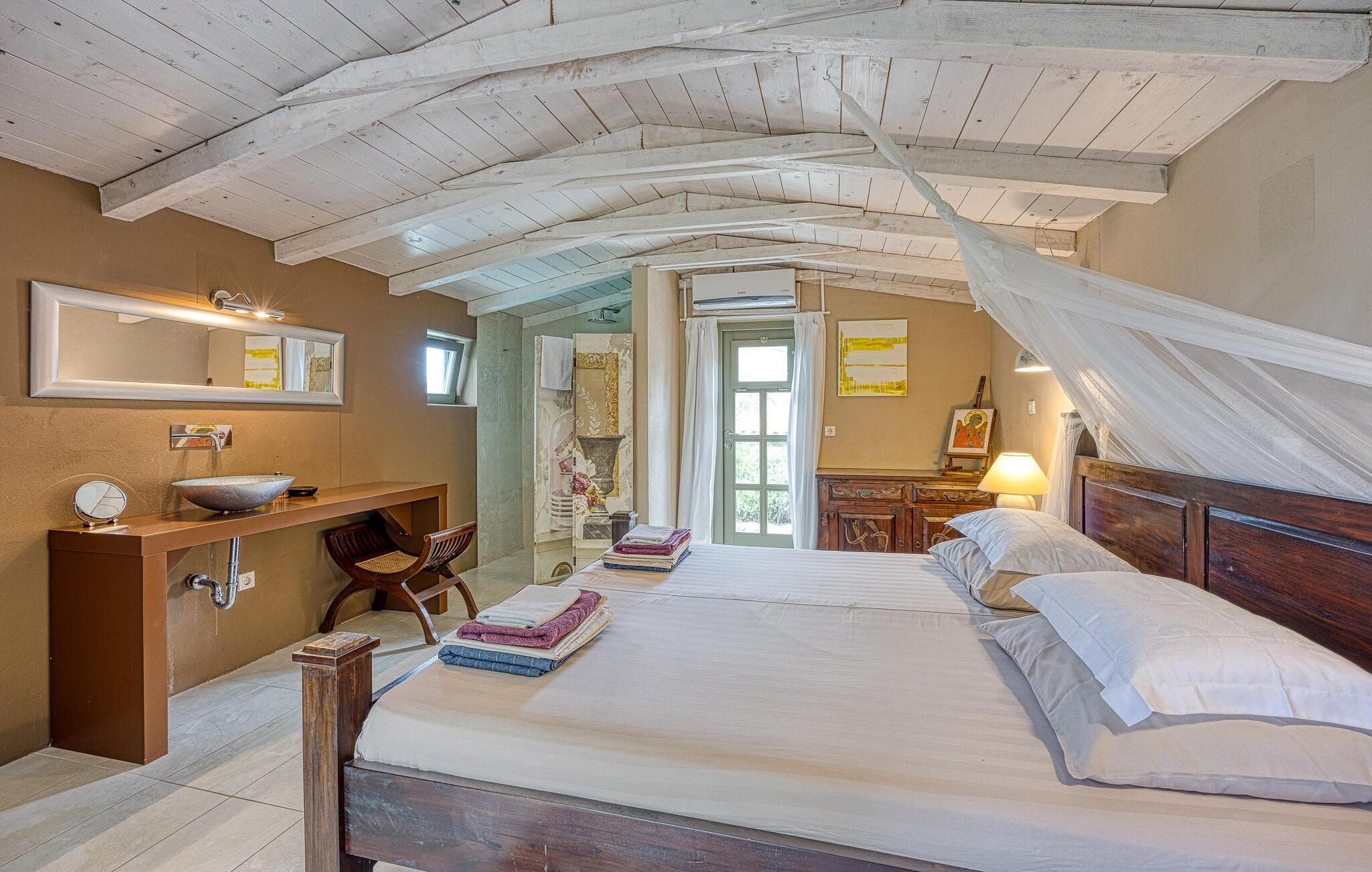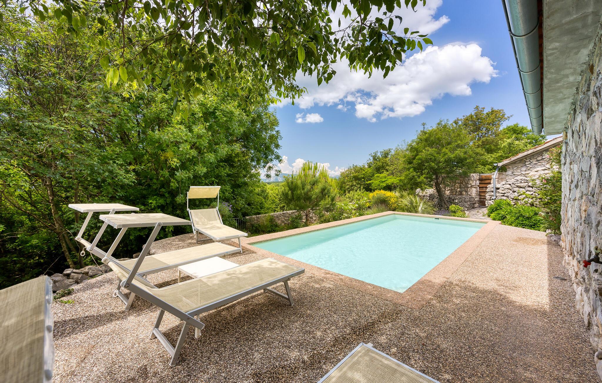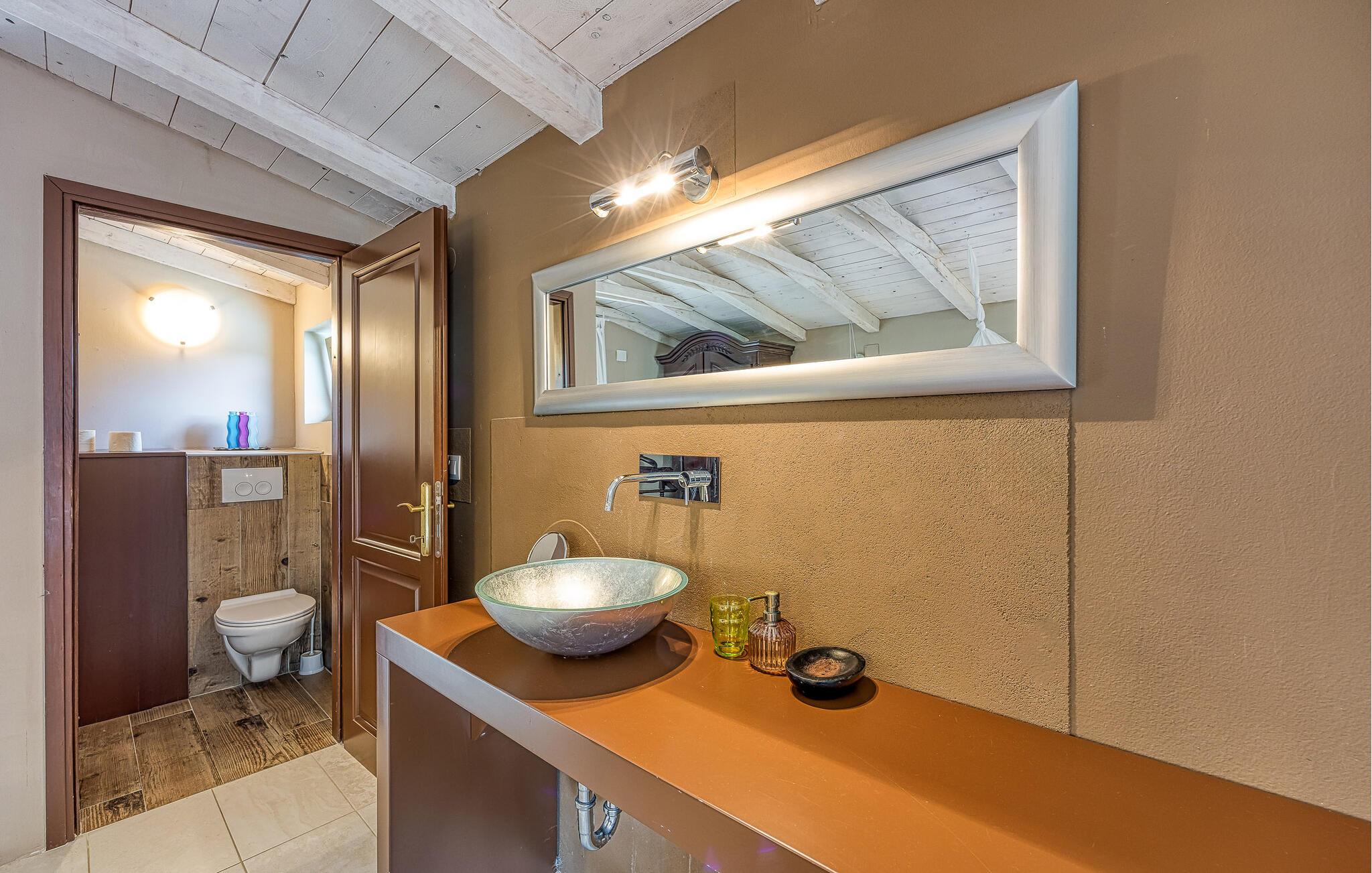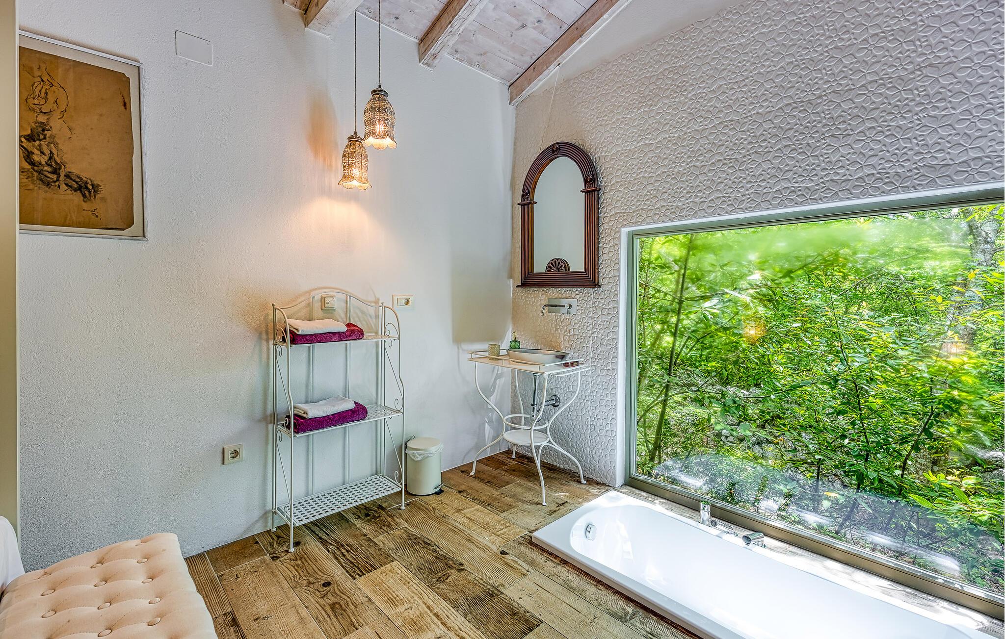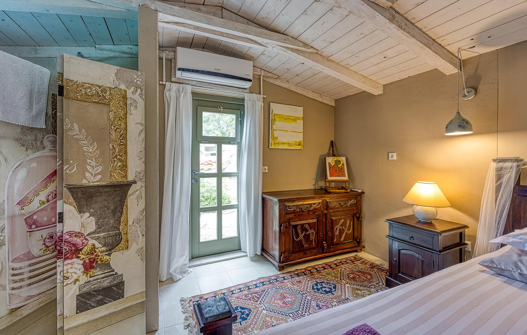 Dette vakkert innredede feriehuset ligger i Bajii, en liten og rolig landsby ikke langt fra den større byen Malinska og byen Krk. Det er et ideelt valg for en familieferie rett ved siden av skogen og omgitt av grøntområder. Hovedhuset har et stort kjøkken med åpen kjøkkenløsning og stue og et soverom med bad i åpen planløsning. Annekset ligger bare ti skritt unna og består av et soverom og et tilstøtende bad med åpen planløsning. Det er også et utendørsbasseng som er skapt for forfriskninger om sommeren, og det tilbyr også privatliv ettersom det er beskyttet mot innsyn. På den store, inngjerdede tomten på 1500 m2 er det flere terrasser med hagemøbler, solsenger og en utendørs murpeis. Parkering er tilgjengelig på eierens tomt ved siden av huset. Malinska og byen Krk kan nås på bare noen få minutter med bil. I sommermånedene er det et variert gastronomisk tilbud og fasiliteter for alle aldersgrupper. I løpet av ferien kan du besøke den lille byen Vrbnik og smake på den opprinnelige Vrbnika lahtina-vinen, ta en tur til Baka og besøke Biserujka-hulen. På øya Krk kan de som elsker en aktiv ferie forvente en hyggelig og innholdsrik ferie. Det er promenader, kilometervis med sykkelstier og joggestier som fører gjennom det vakre landskapet og er en ideell måte å oppdage den fantastiske naturskjønnheten på.
